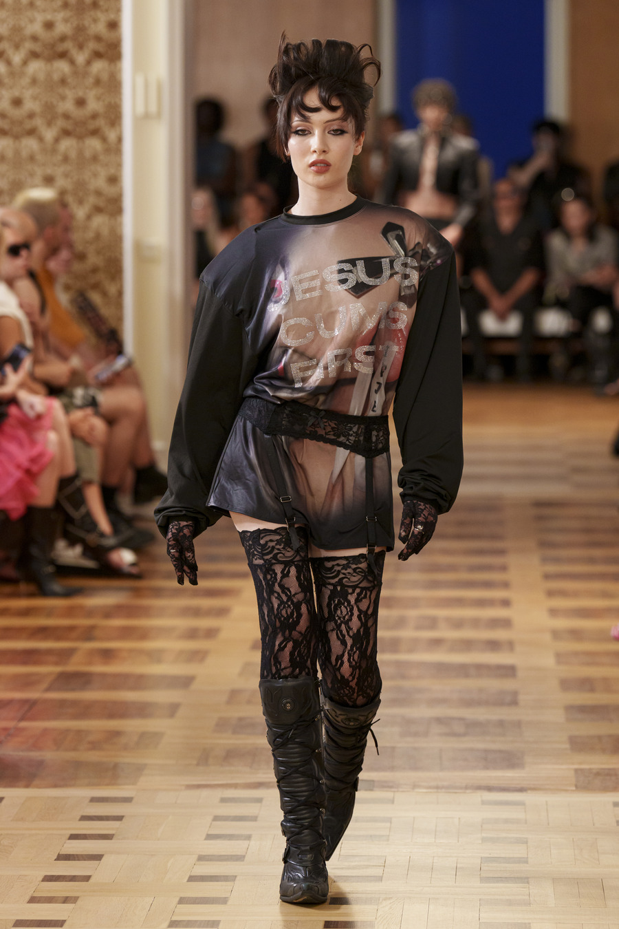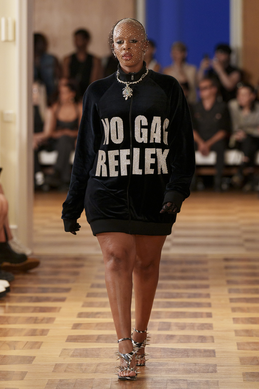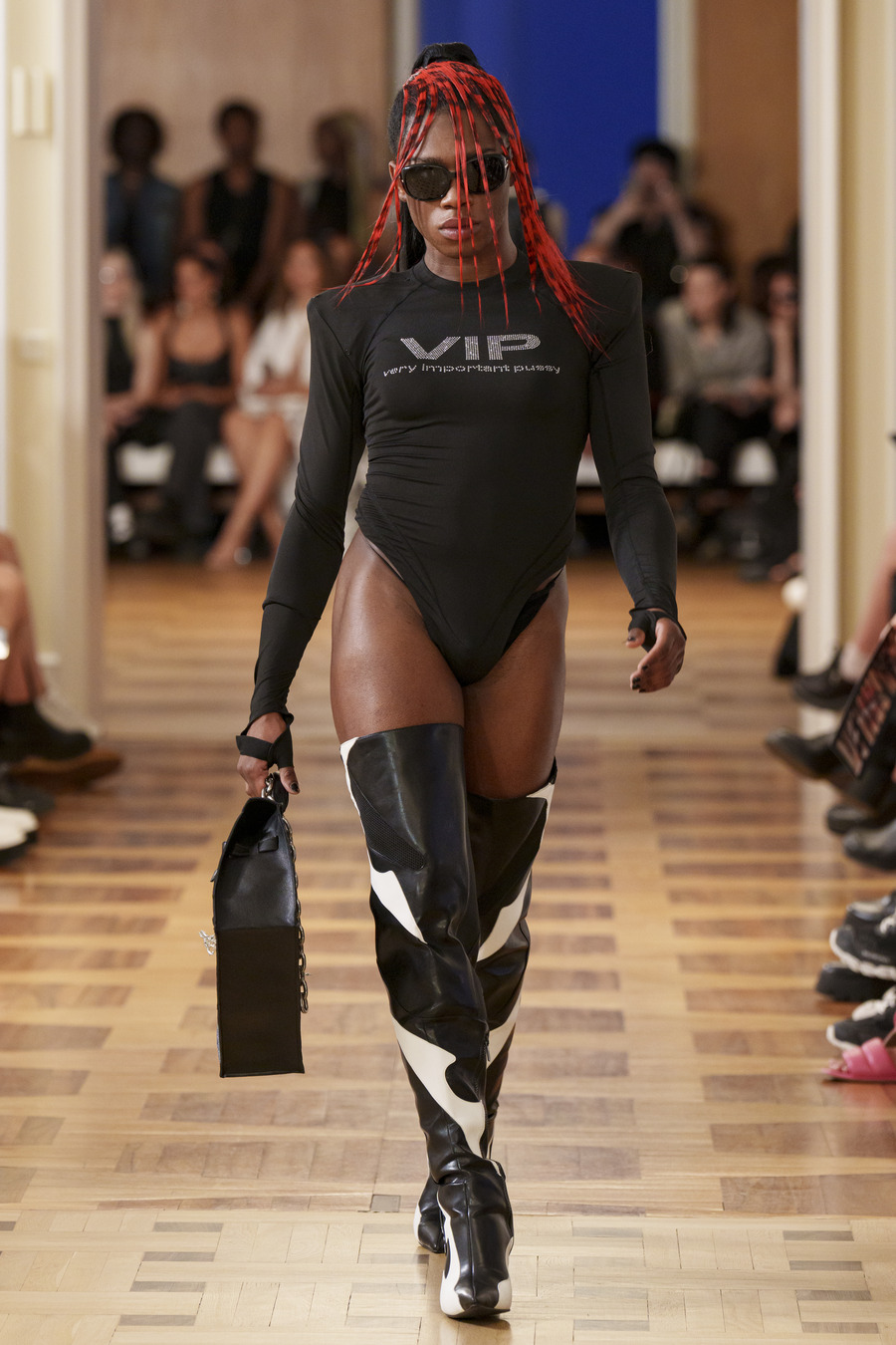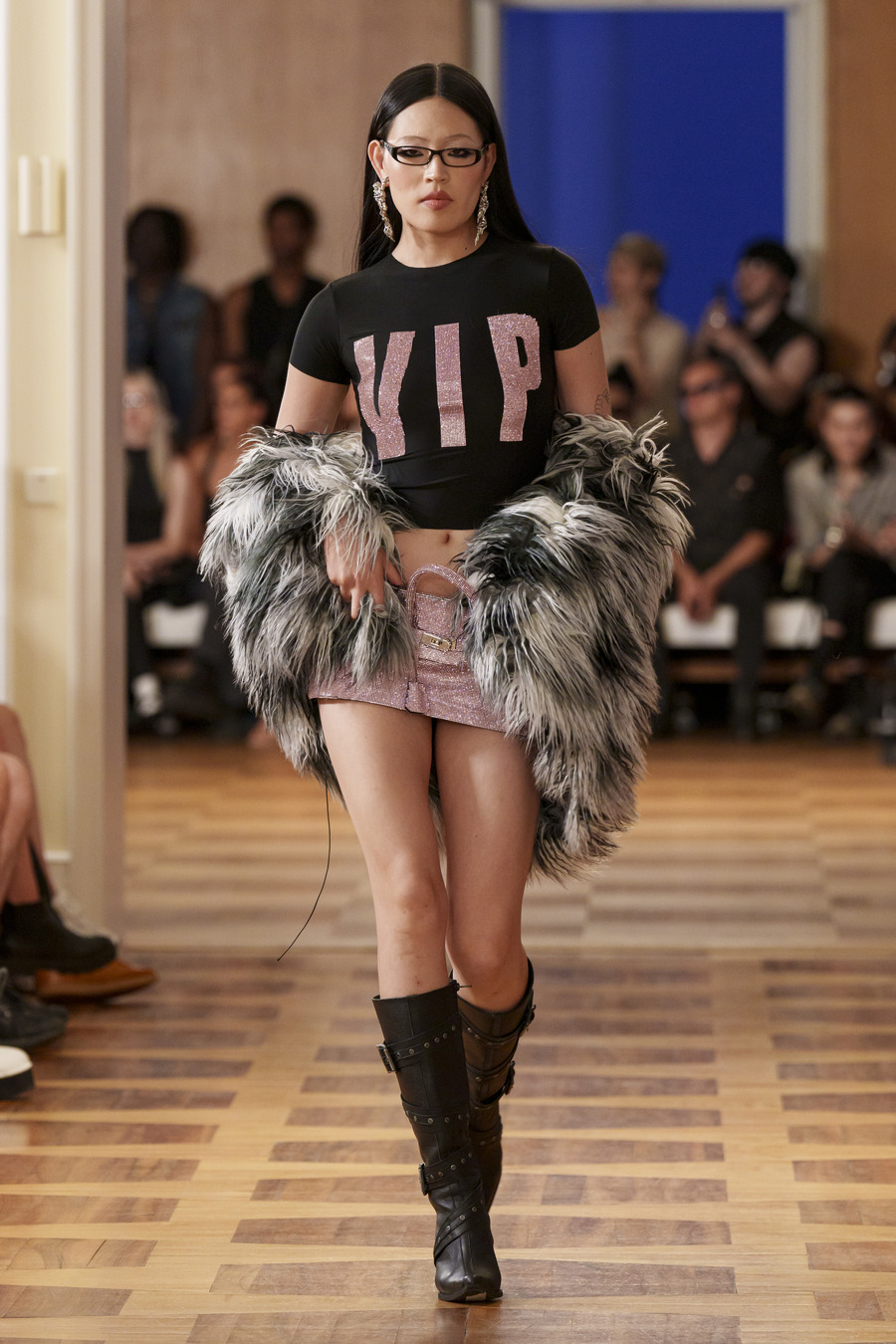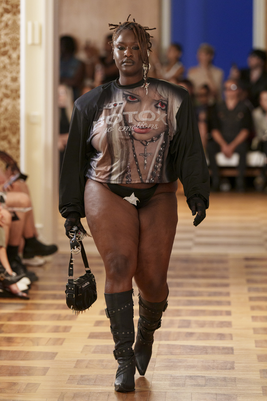 One standout design, reminiscent of 90s goth and Cher from “Clueless,” features a maxi skirt and a mesh cardigan adorned with silver crosses. Another captivating ensemble consists of a bra top paired with a vibrant pink faux leather skirt embossed with a crocodile pattern, reminiscent of a luxurious handbag. However, the absolute showstopper is a red patent leather mermaid skirt, flawlessly styled with a bra and edgy motorcycle gloves.