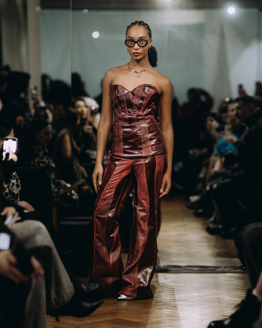 The collection’s showstopper, a quilted scarlet taffeta coat, started as a toile before being reimagined into a runway masterpiece—symbolizing Hart’s sustainable craftsmanship and ever-evolving vision. She treats fashion as an evolving art form, where each garment is sculpted with precision and personal expression.
