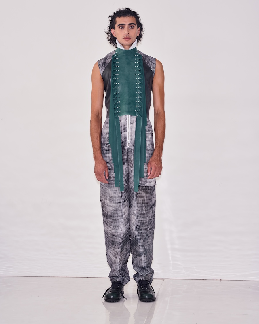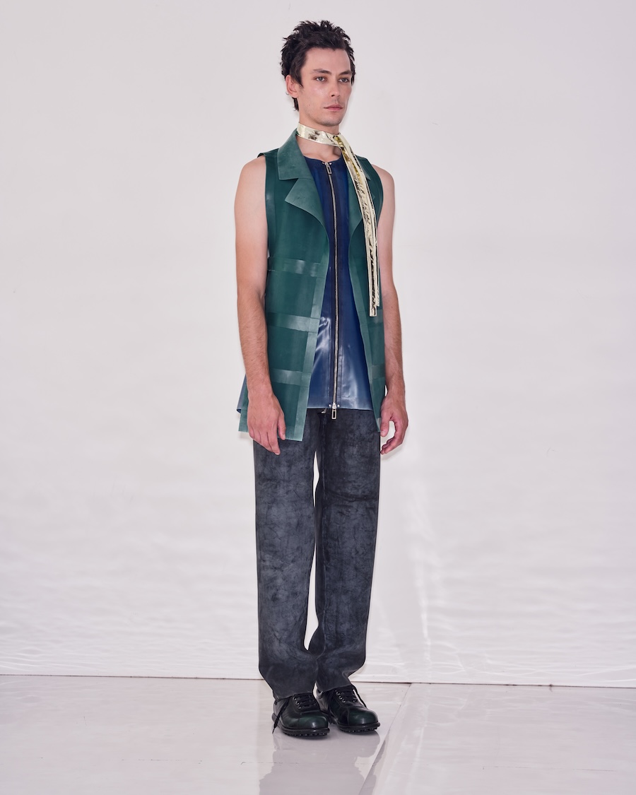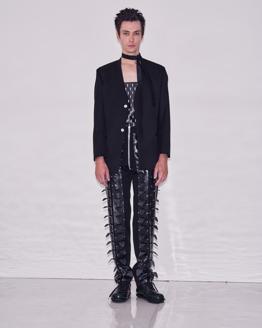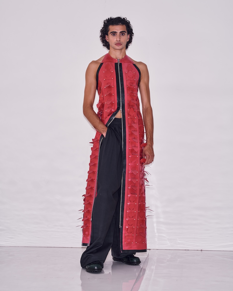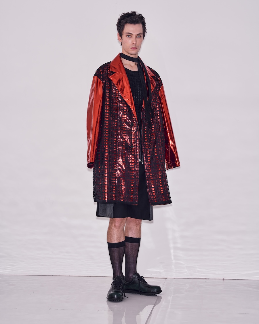 Pushing the boundaries of material innovation, the collection flaunts experimental techniques that marry form with function. Delicate lace and knitwear intertwine with latex ribbons, crafting a tension that balances fragility with resilience. Riveted seams, glistening metal chains, and cleverly placed zippers infuse movement, allowing garments to evolve into fresh dimensions. Meanwhile, technical woven fabrics are adorned with scanned prints of architectural materials, embellished with transparent beads to elevate their dimensionality. Scuba stretch fabrics and patchwork surfaces mimic the layered beauty of architectural elements, while double-faced, hand-finished textiles take on forms reminiscent of captivating edifices.