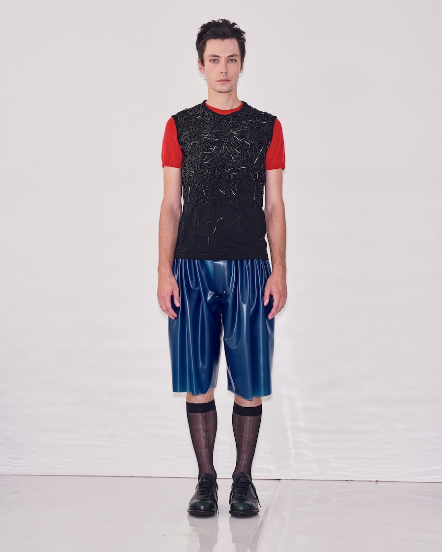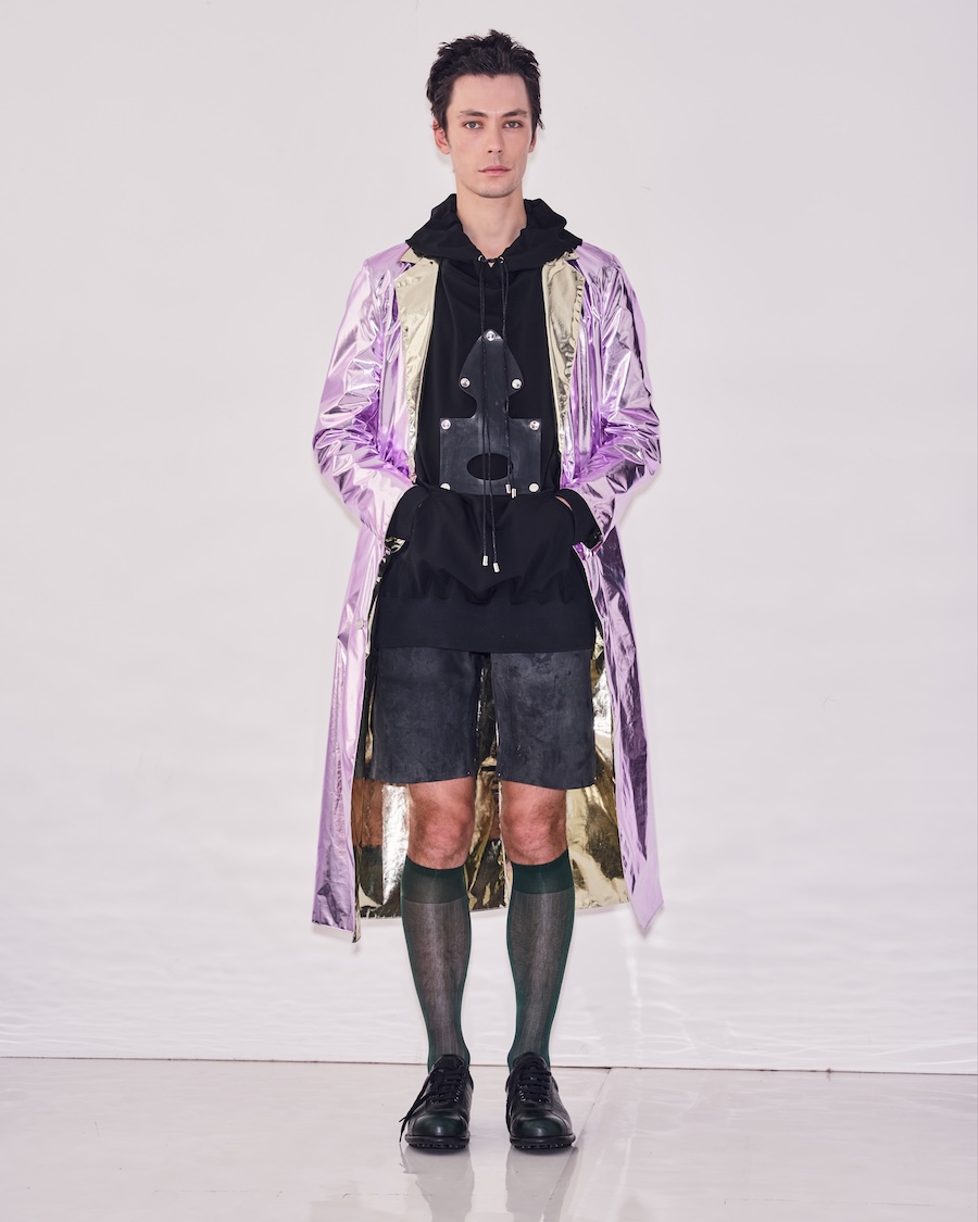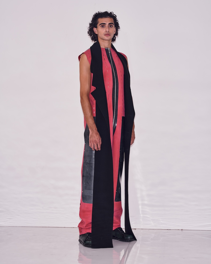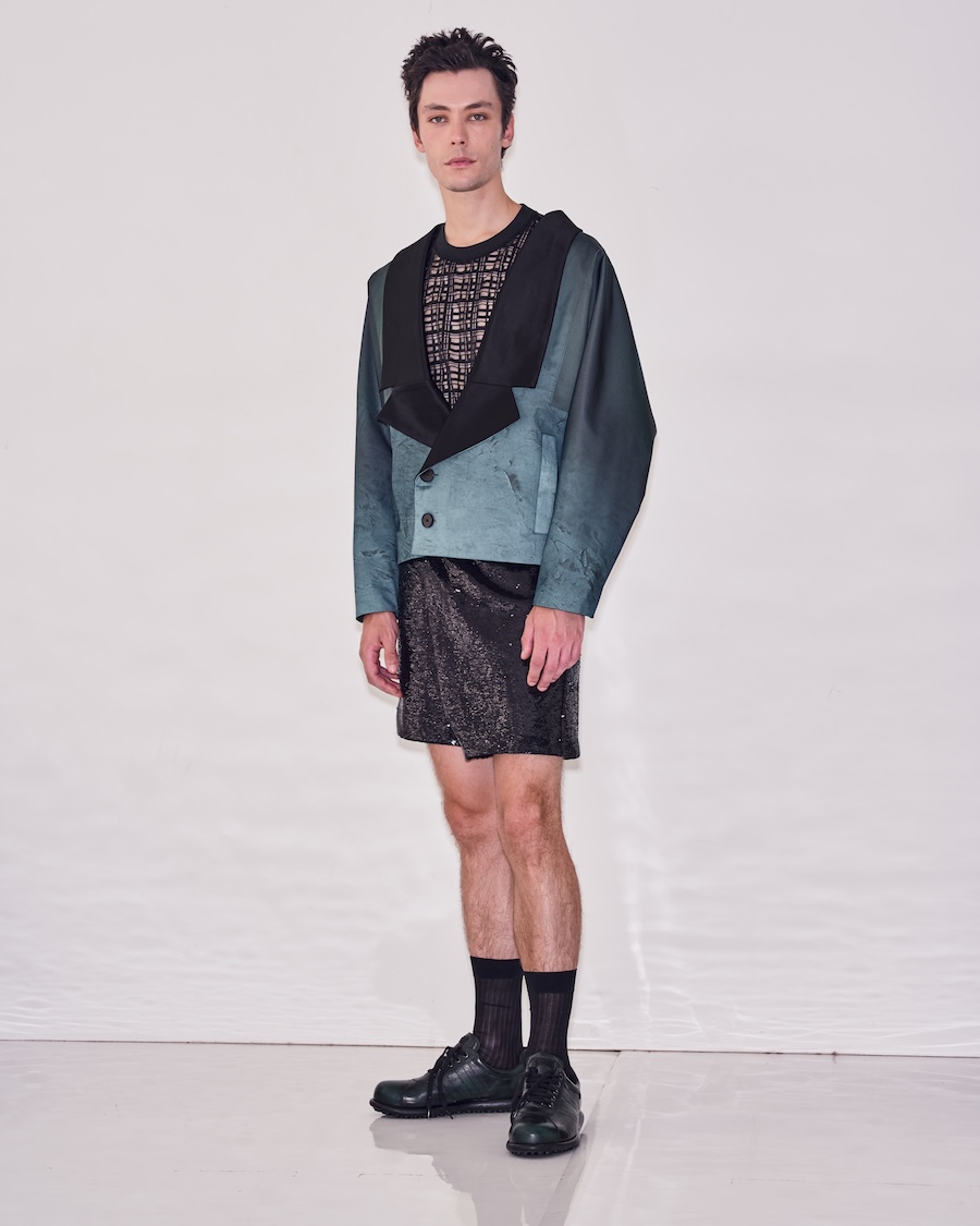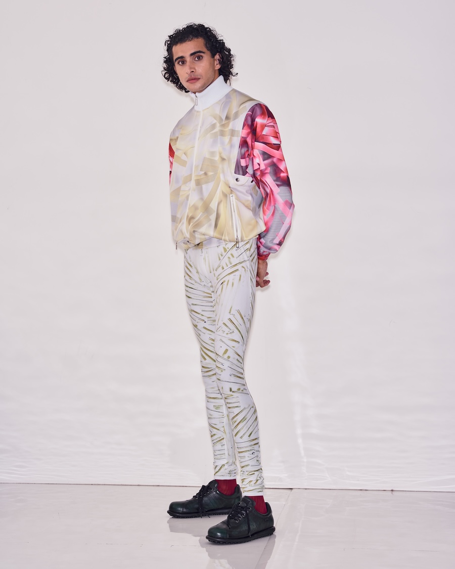 Pushing the boundaries of material innovation, the collection flaunts experimental techniques that marry form with function. Delicate lace and knitwear intertwine with latex ribbons, crafting a tension that balances fragility with resilience. Riveted seams, glistening metal chains, and cleverly placed zippers infuse movement, allowing garments to evolve into fresh dimensions. Meanwhile, technical woven fabrics are adorned with scanned prints of architectural materials, embellished with transparent beads to elevate their dimensionality. Scuba stretch fabrics and patchwork surfaces mimic the layered beauty of architectural elements, while double-faced, hand-finished textiles take on forms reminiscent of captivating edifices.