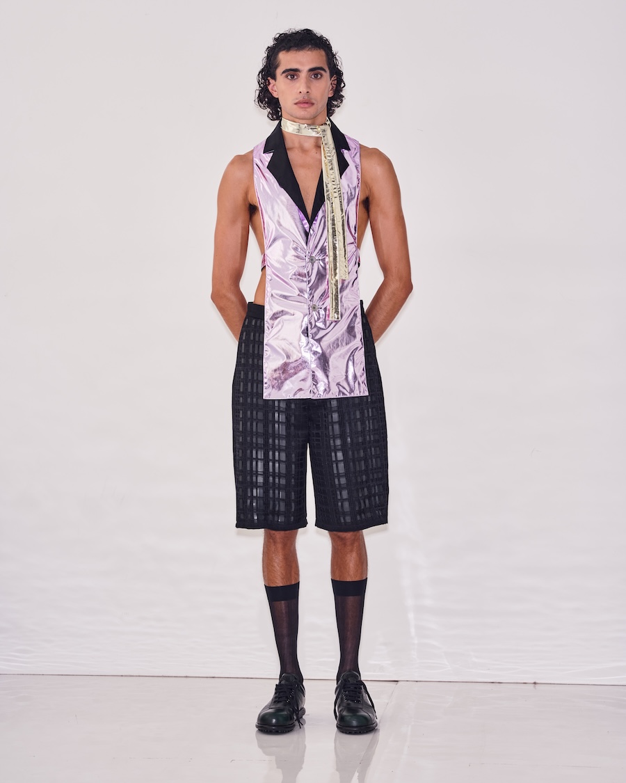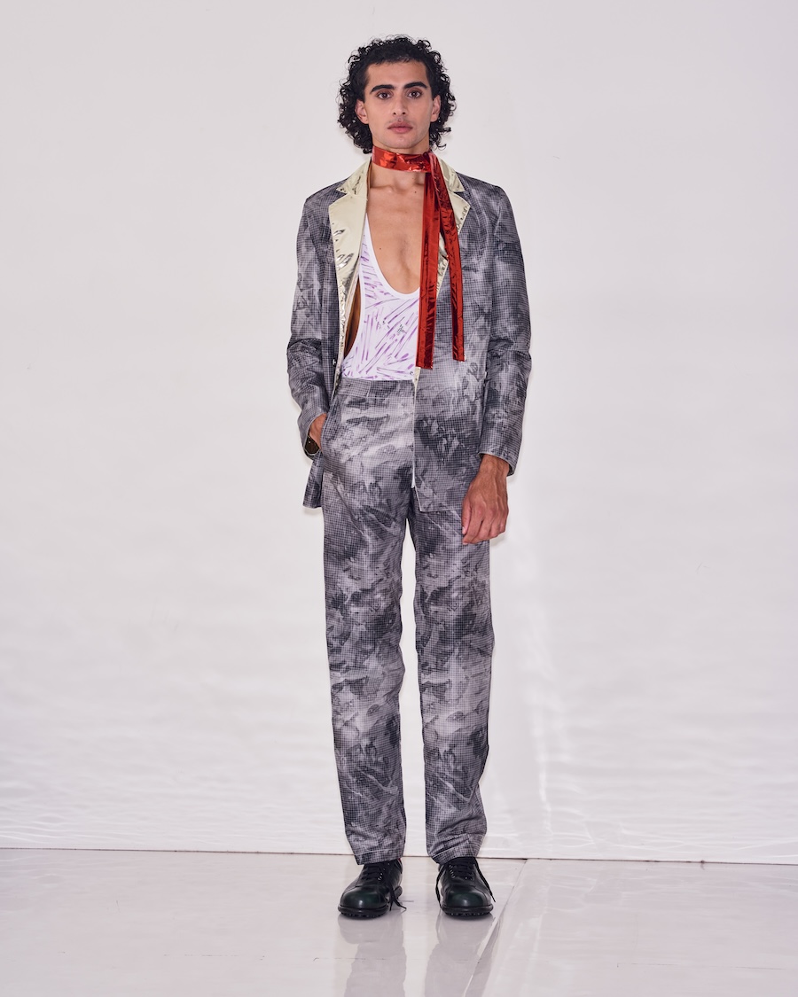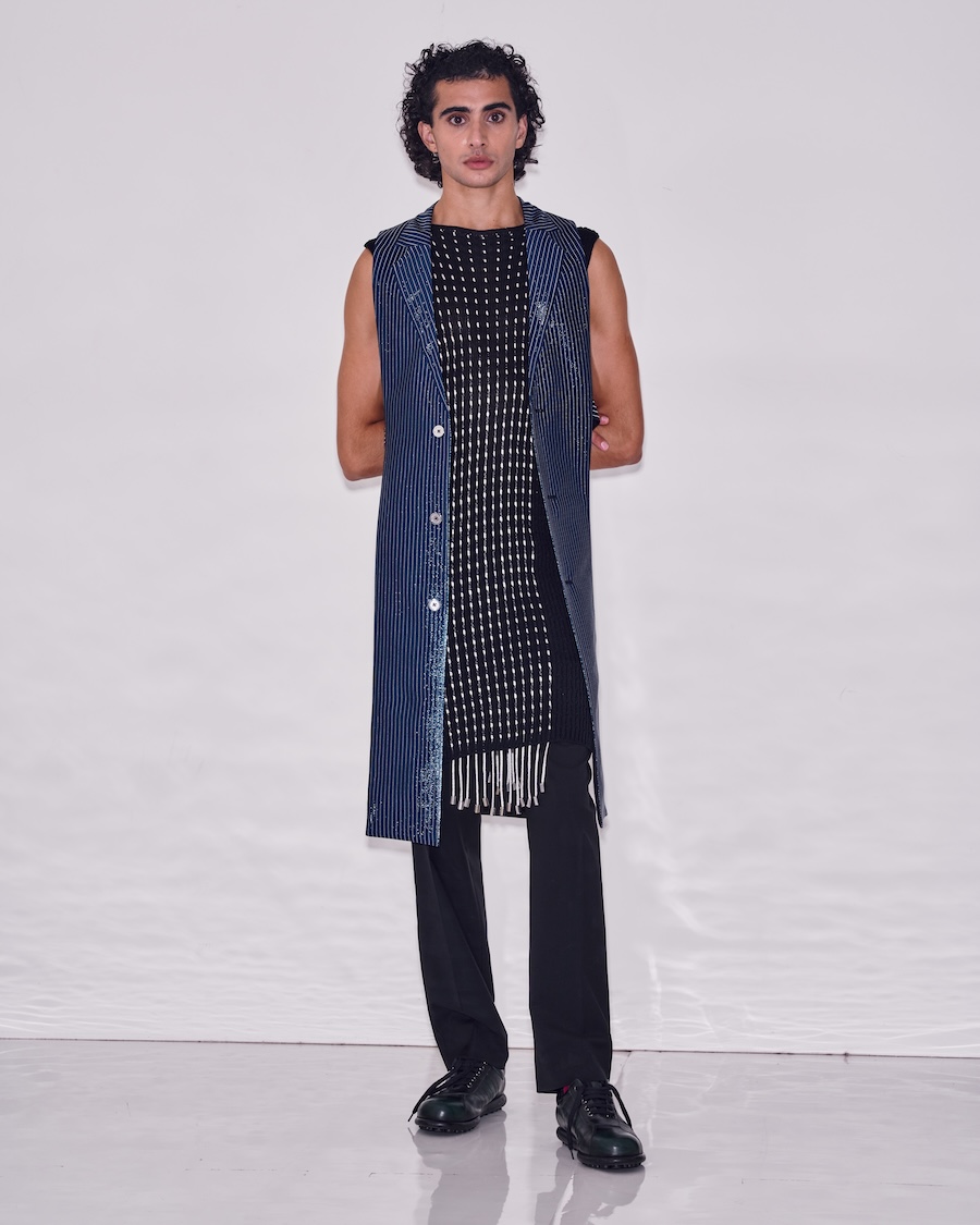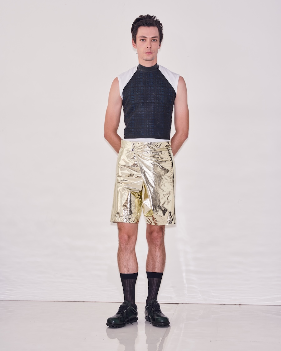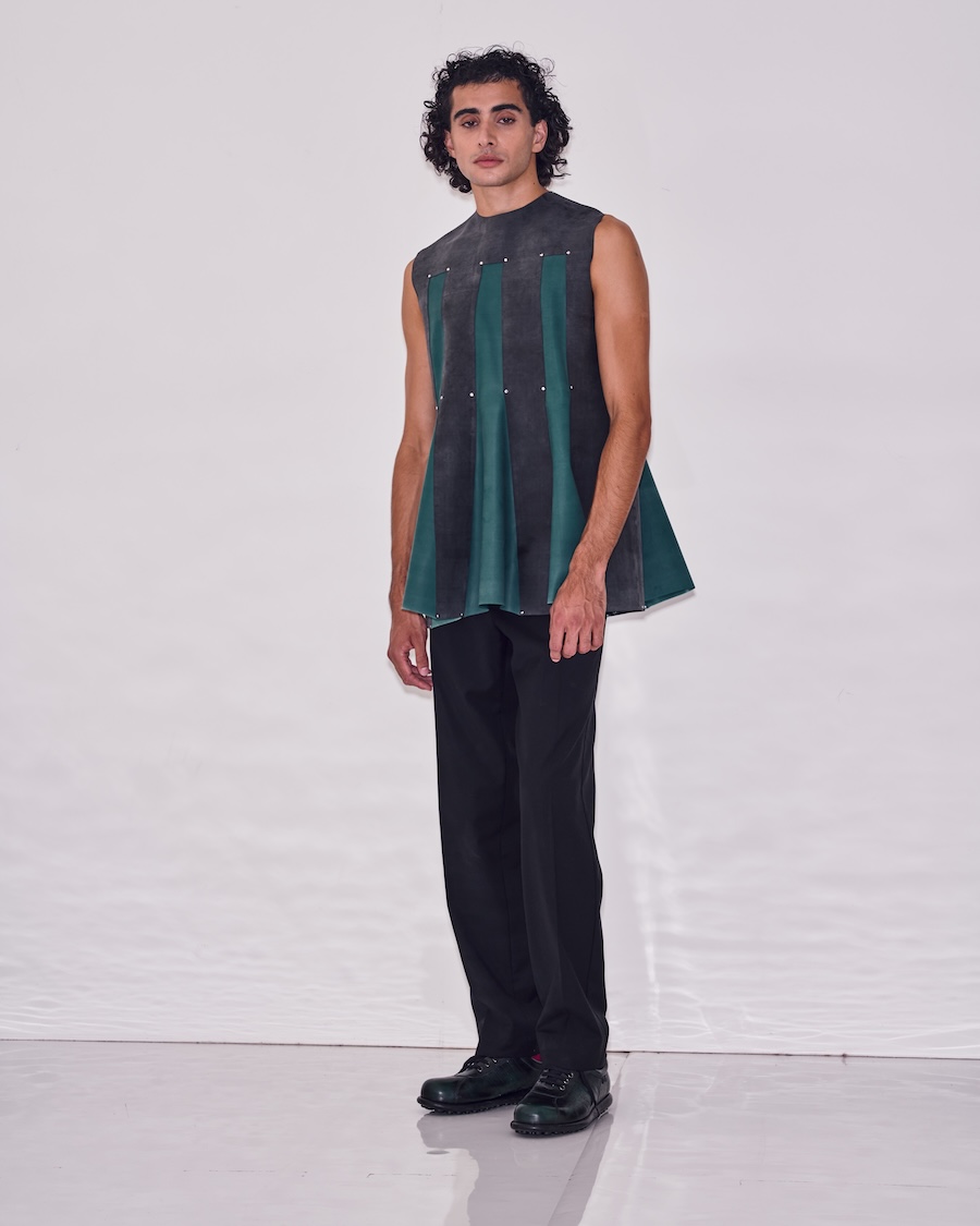 Pushing the boundaries of material innovation, the collection flaunts experimental techniques that marry form with function. Delicate lace and knitwear intertwine with latex ribbons, crafting a tension that balances fragility with resilience. Riveted seams, glistening metal chains, and cleverly placed zippers infuse movement, allowing garments to evolve into fresh dimensions. Meanwhile, technical woven fabrics are adorned with scanned prints of architectural materials, embellished with transparent beads to elevate their dimensionality. Scuba stretch fabrics and patchwork surfaces mimic the layered beauty of architectural elements, while double-faced, hand-finished textiles take on forms reminiscent of captivating edifices.