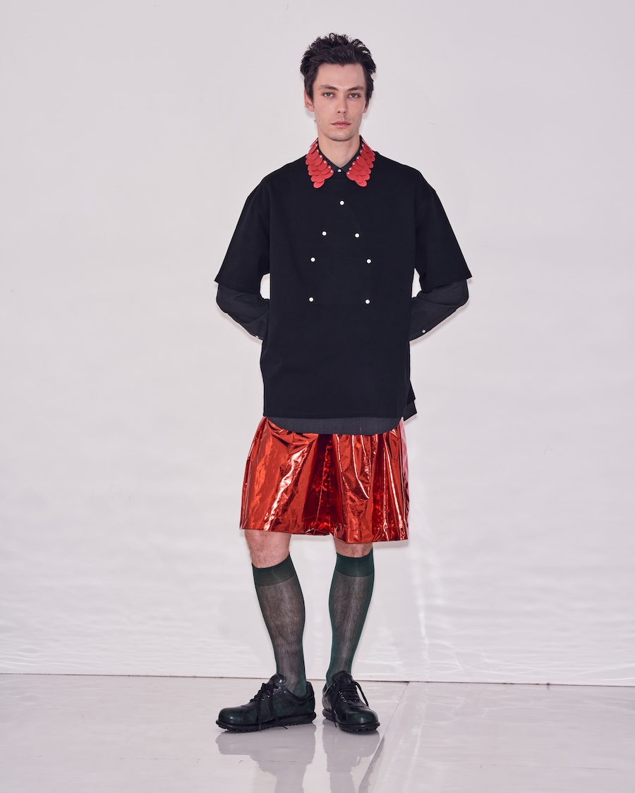 The silhouettes we encounter here exemplify a beautiful duality, both static and fluid, exuding an alluring mix of strength and softness. The collection deftly balances straight, boxy fits that provide a sculptural foundation with intricate cut-outs and panelling that invite dimension and airiness. Voluminous, symmetric shapes playfully engage with the body’s natural proportions; sometimes they exaggerate, while at other times they reinvent our expectations.