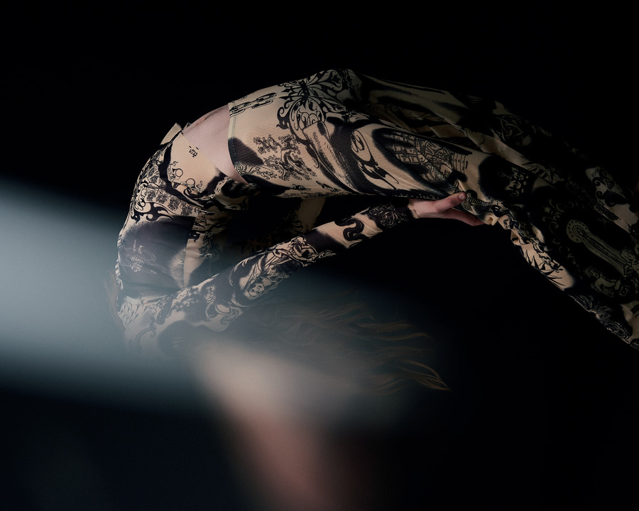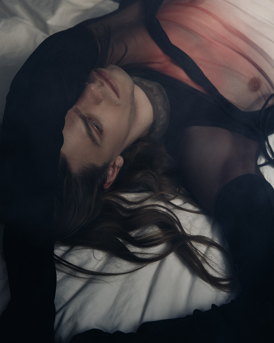 A KALTBLUT exclusive. Photography by Lavina Solomonova. Creative Direction & Model is Caleb Budd at Crawford Models. Art Direction & Styling by Iryna Li. Hair & Make up by Dana Arcidy. Fashion Brands used are Ottolinger, Diesel, Jean Paul Gaultier, Corban Harper, Comme Des Garçons. This visual story delves into themes of vulnerability and entrapment, offering an introspective lens on the duality of dreams and nightmares.