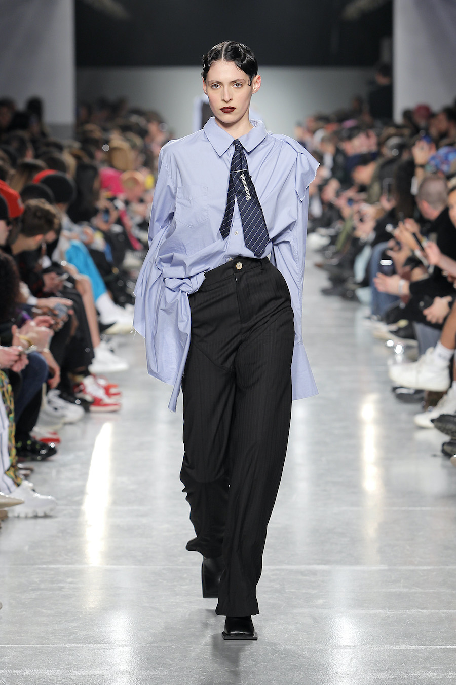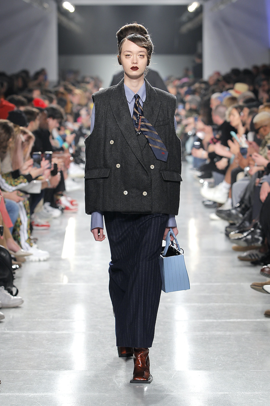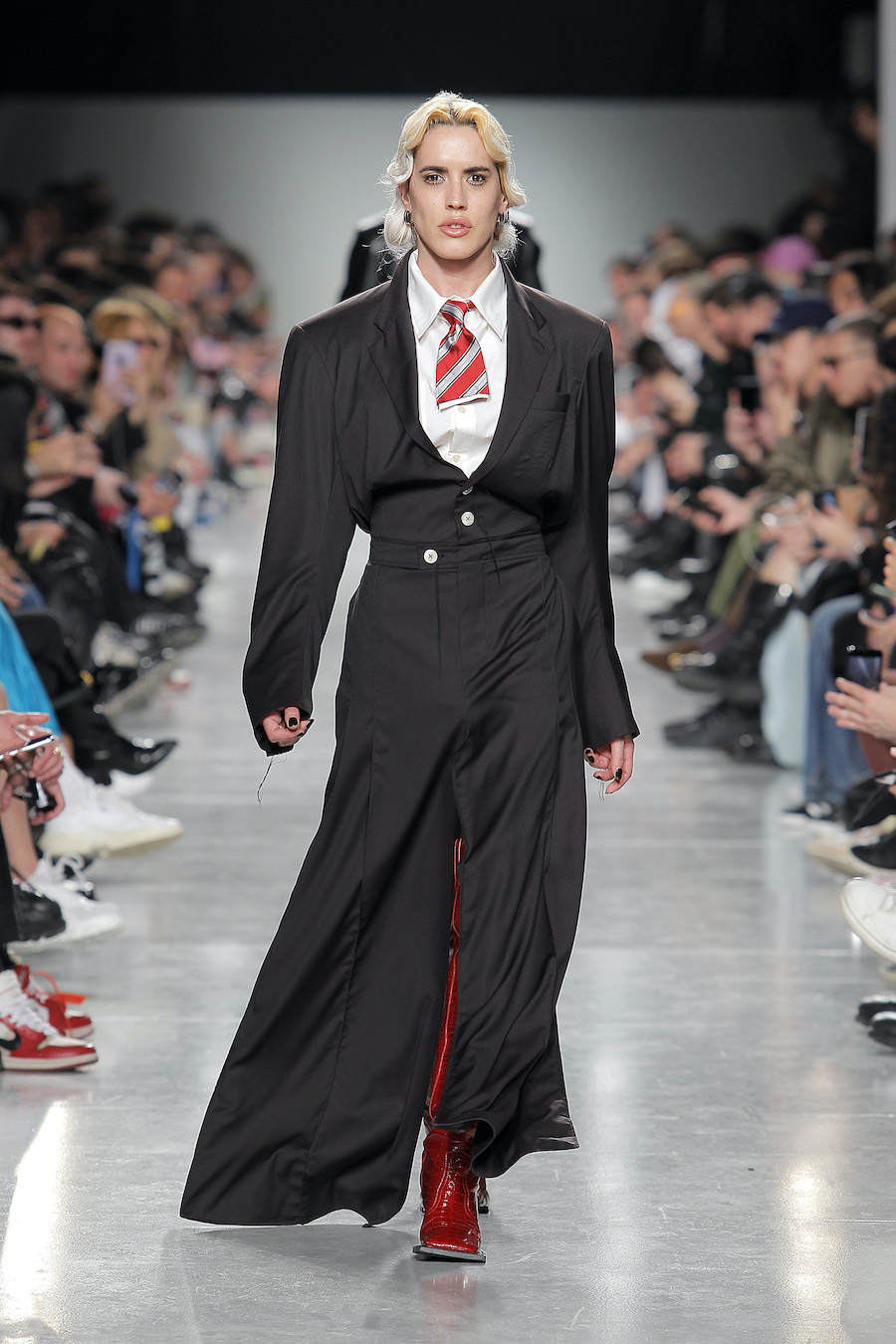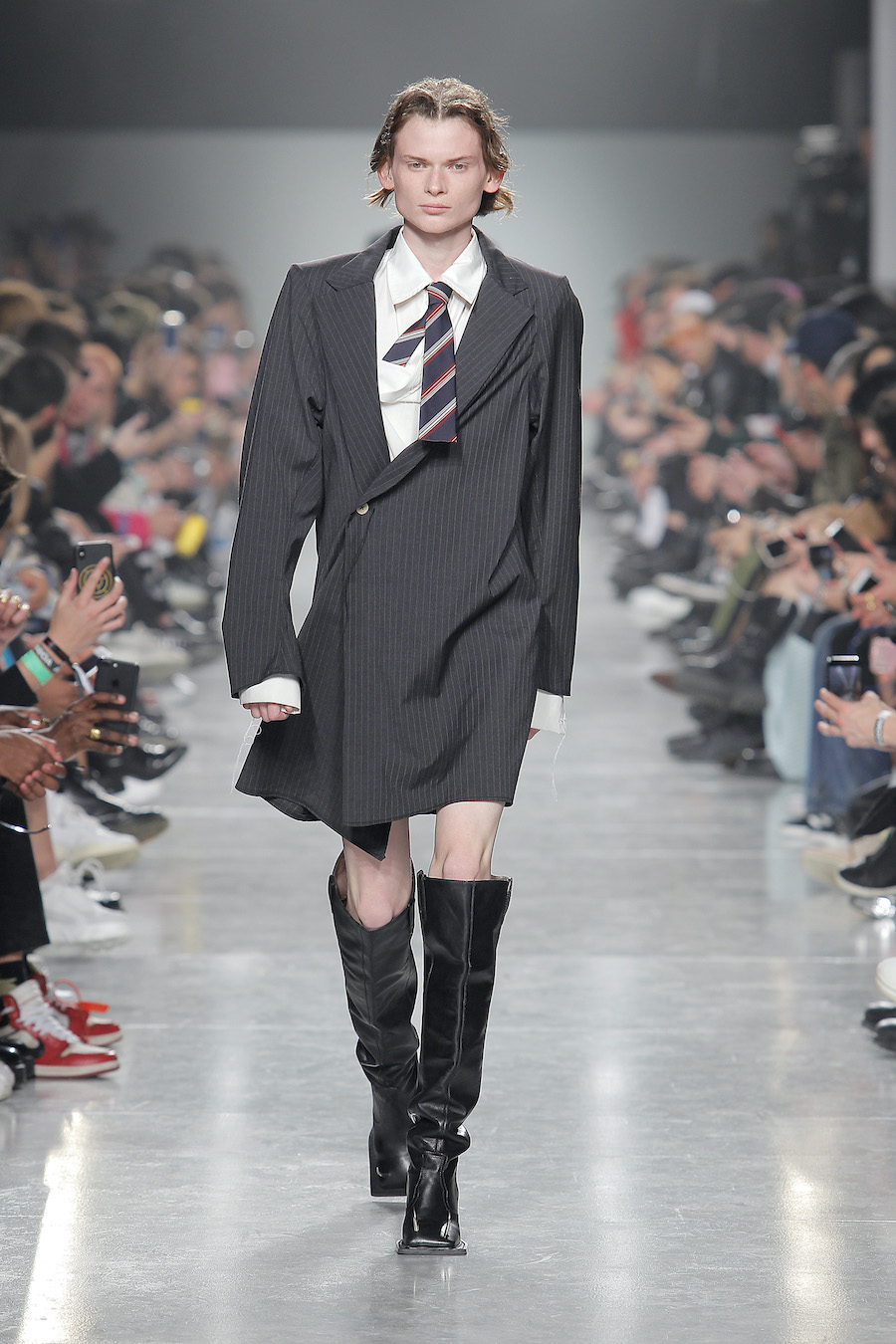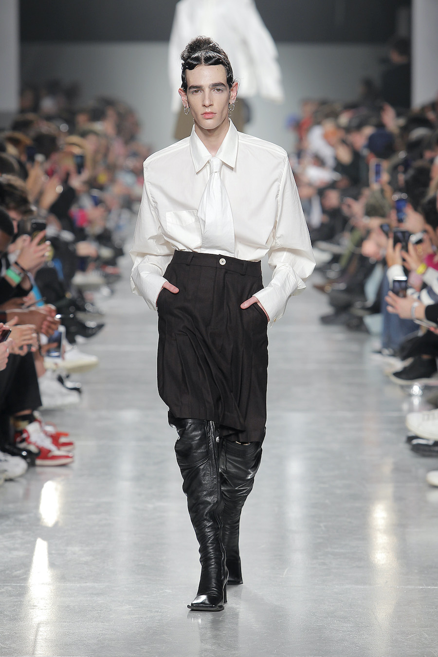 Traditional shirting and tailoring comes with an exoskeleton of boning, creating dominant silhouettes and strong shoulders. A layered suit and a sleeveless puffer coat reference a protective shell still in the process of growth. Capturing a freedom of spirit, stereotypical staples are reinterpreted with a luxurious punk attitude. A matching shirt and tie combo paired with a hybrid of a pleated skirt and tailored trousers.