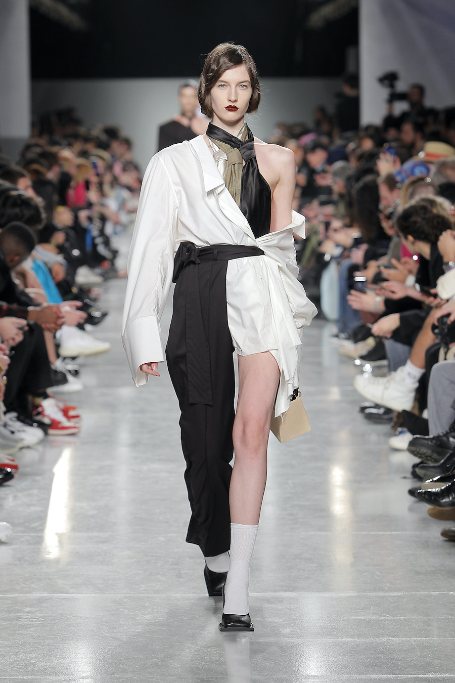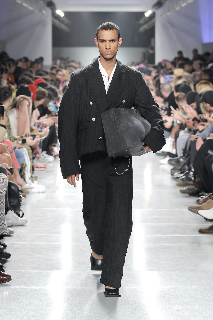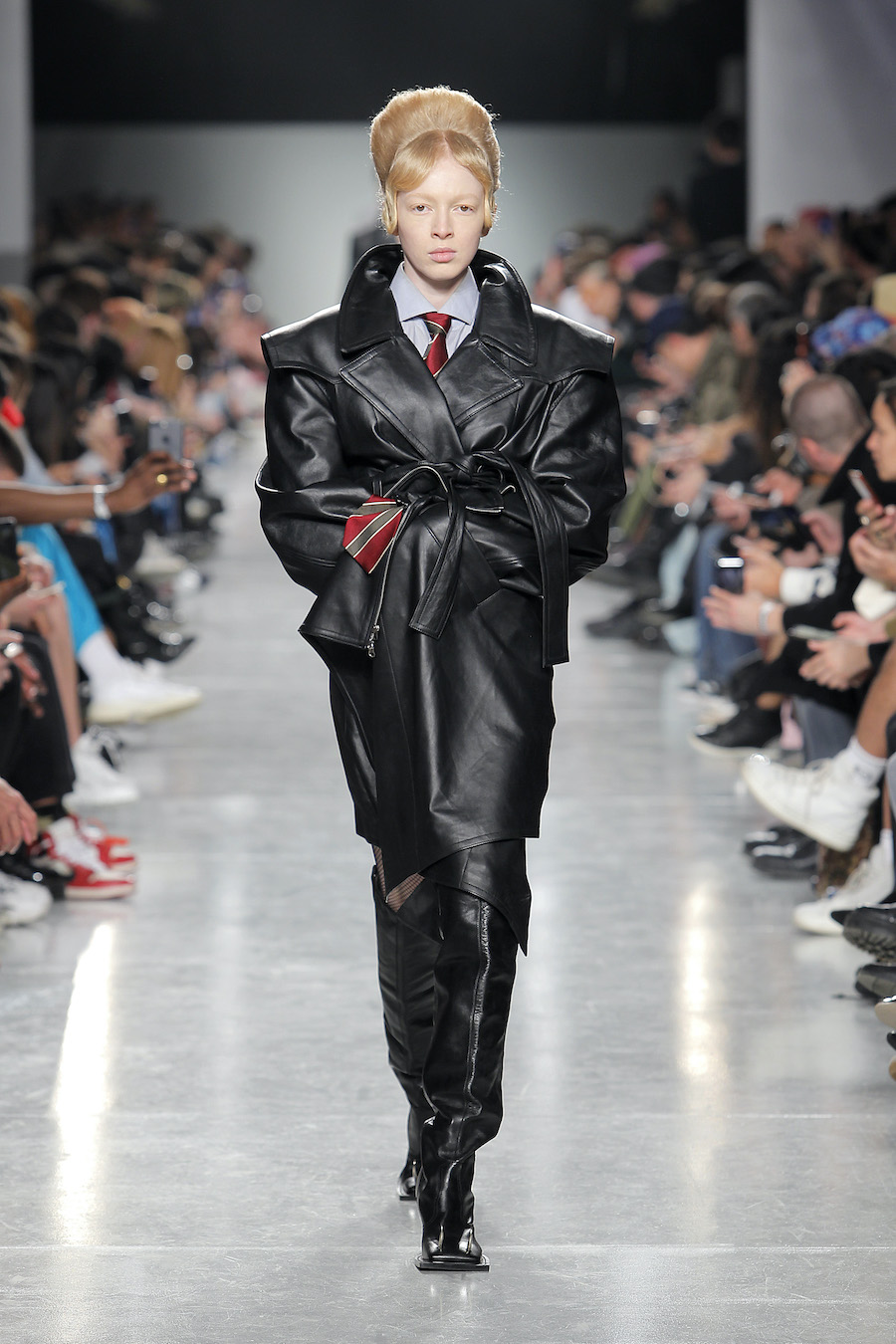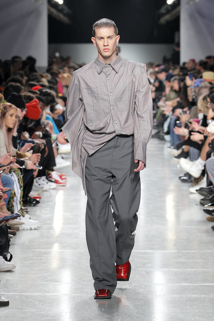 Traditional shirting and tailoring comes with an exoskeleton of boning, creating dominant silhouettes and strong shoulders. A layered suit and a sleeveless puffer coat reference a protective shell still in the process of growth. Capturing a freedom of spirit, stereotypical staples are reinterpreted with a luxurious punk attitude. A matching shirt and tie combo paired with a hybrid of a pleated skirt and tailored trousers.