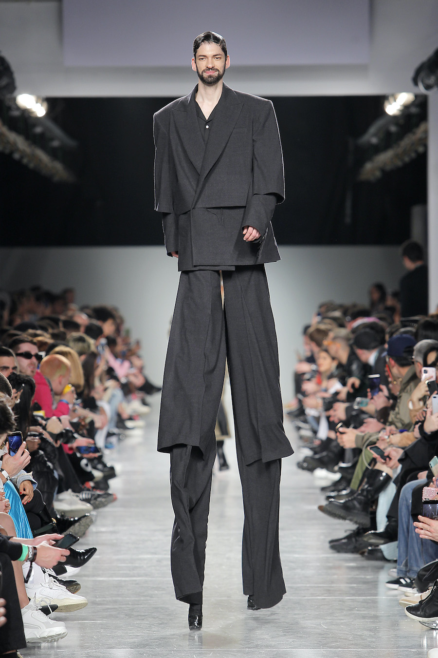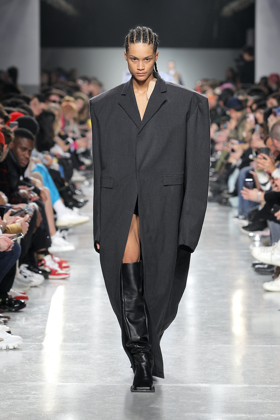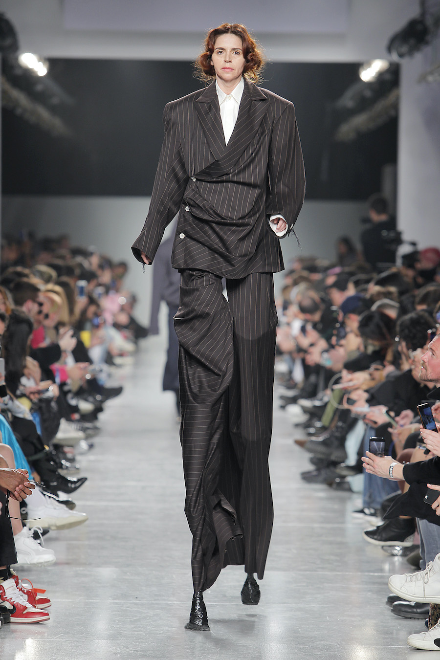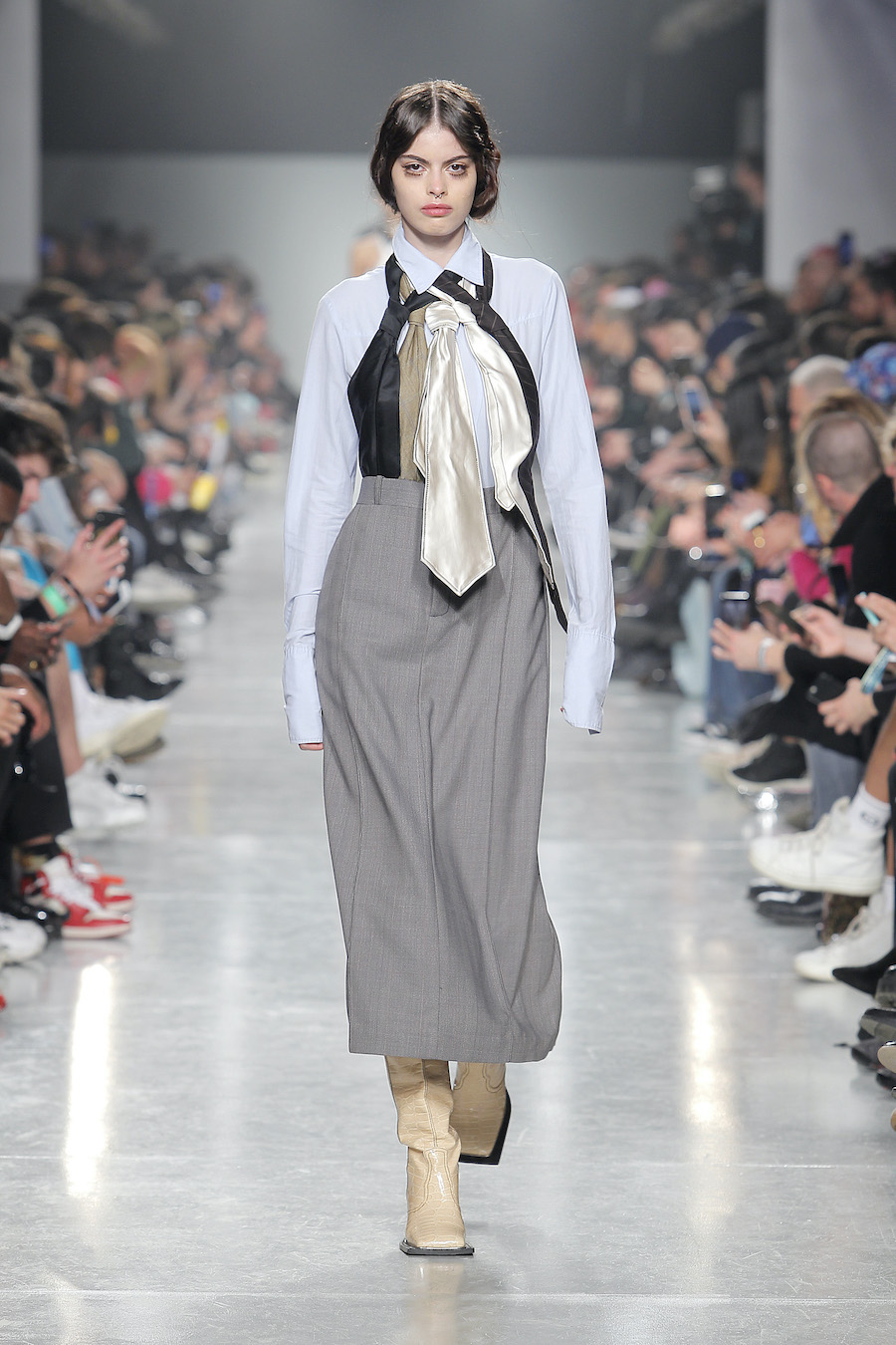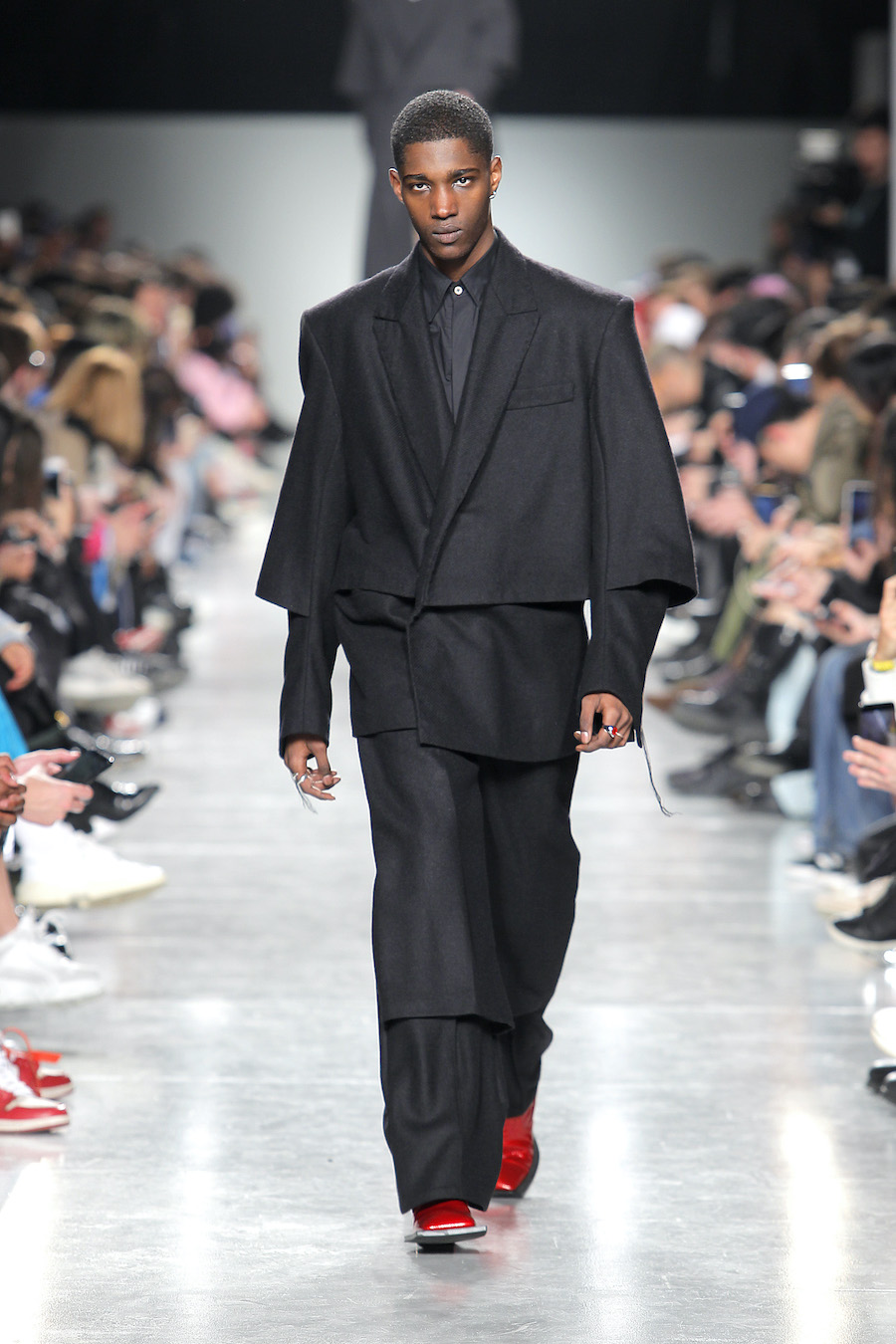 Traditional shirting and tailoring comes with an exoskeleton of boning, creating dominant silhouettes and strong shoulders. A layered suit and a sleeveless puffer coat reference a protective shell still in the process of growth. Capturing a freedom of spirit, stereotypical staples are reinterpreted with a luxurious punk attitude. A matching shirt and tie combo paired with a hybrid of a pleated skirt and tailored trousers.