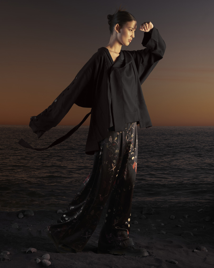 The No Grey Area F/W23 collection revisits signature Saree, Kurta and Dhoti silhouettes elevated through new fabrications, including luxury pashmina wool which is only loomed in Kashmir, and hand-looming this with suiting wools to create an innovative new contemporary luxury textile allowing greater structure. Velvet, Italian suiting, and upcycled cashmere complete this season’s textural palette.