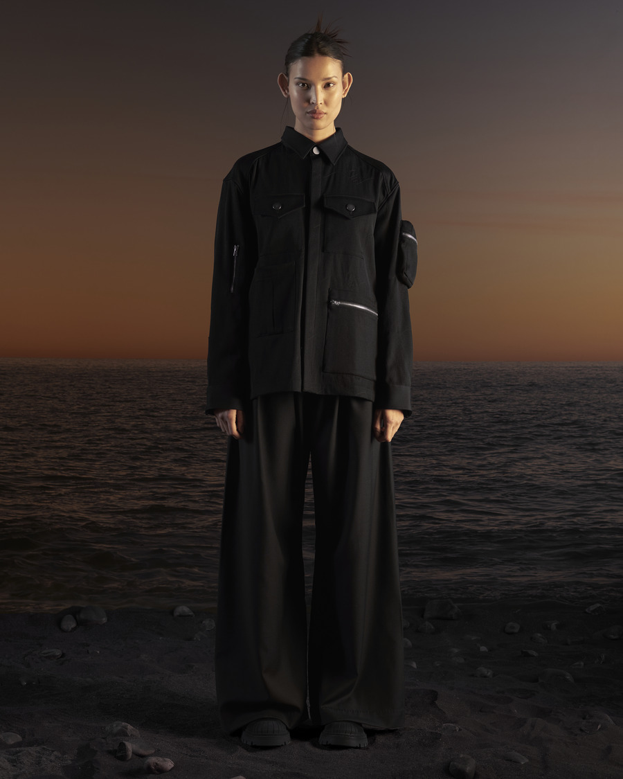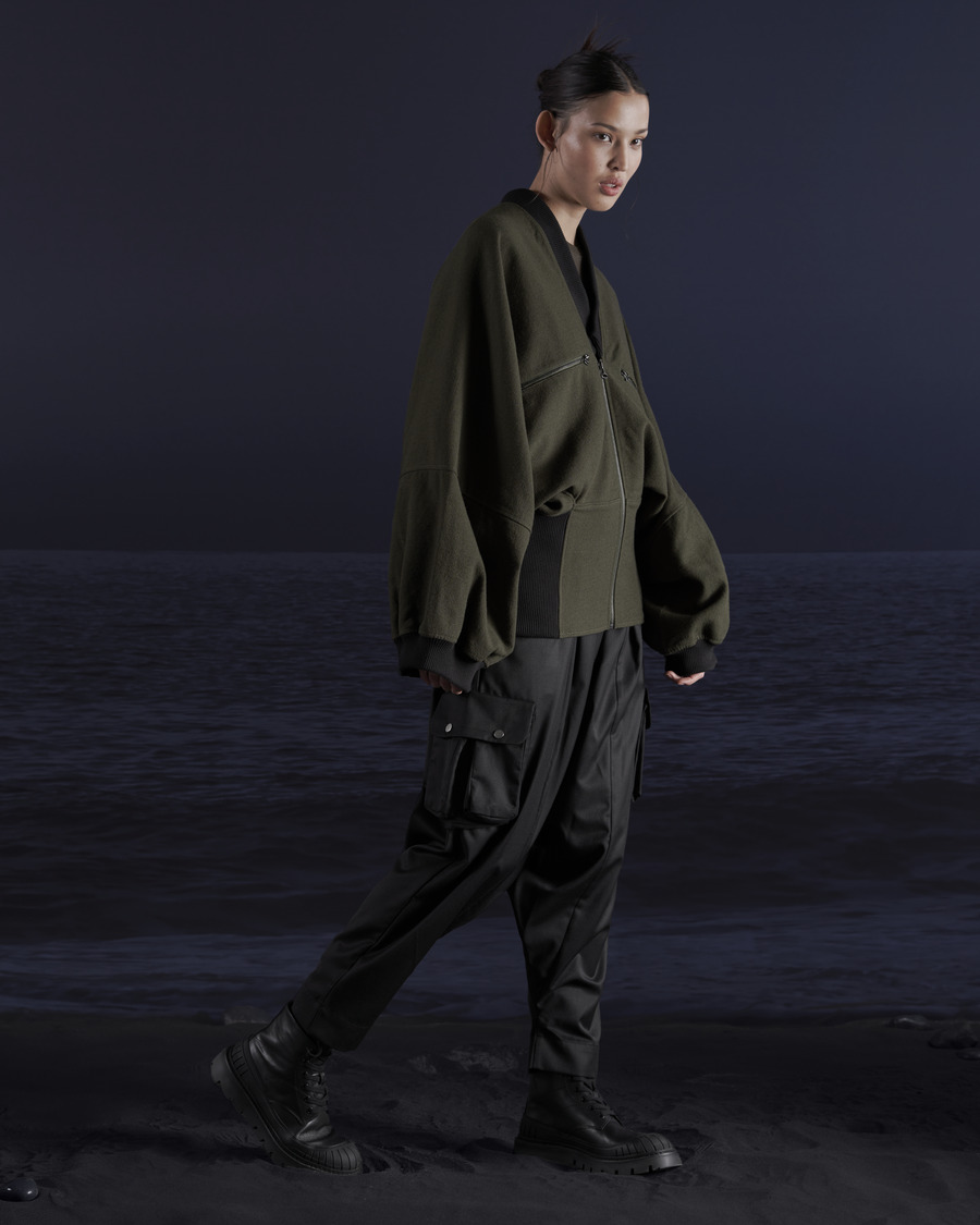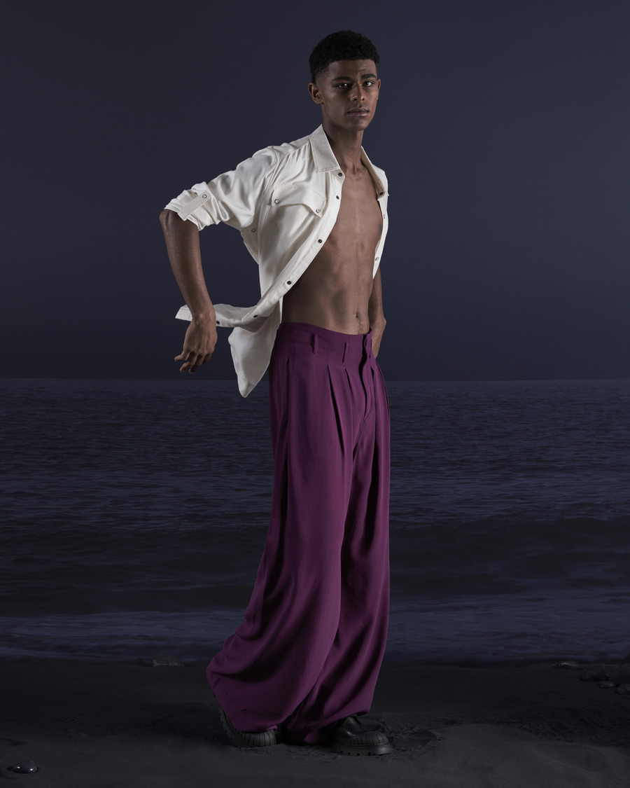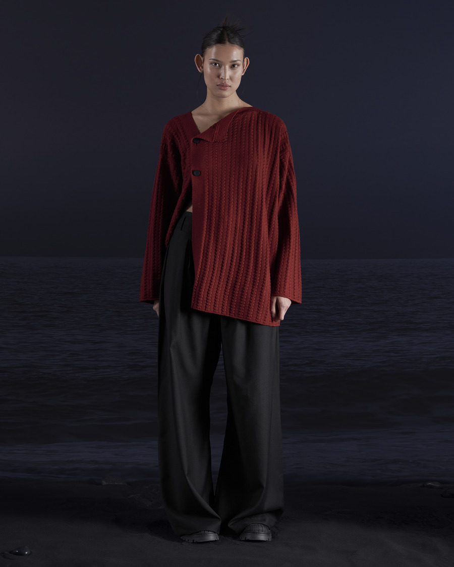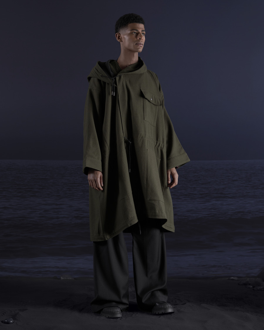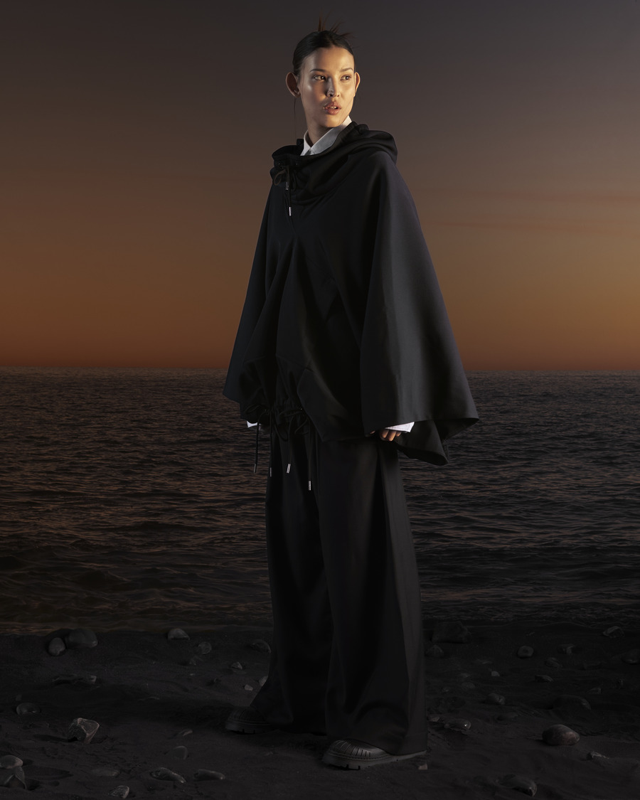 The No Grey Area F/W23 collection revisits signature Saree, Kurta and Dhoti silhouettes elevated through new fabrications, including luxury pashmina wool which is only loomed in Kashmir, and hand-looming this with suiting wools to create an innovative new contemporary luxury textile allowing greater structure. Velvet, Italian suiting, and upcycled cashmere complete this season’s textural palette.