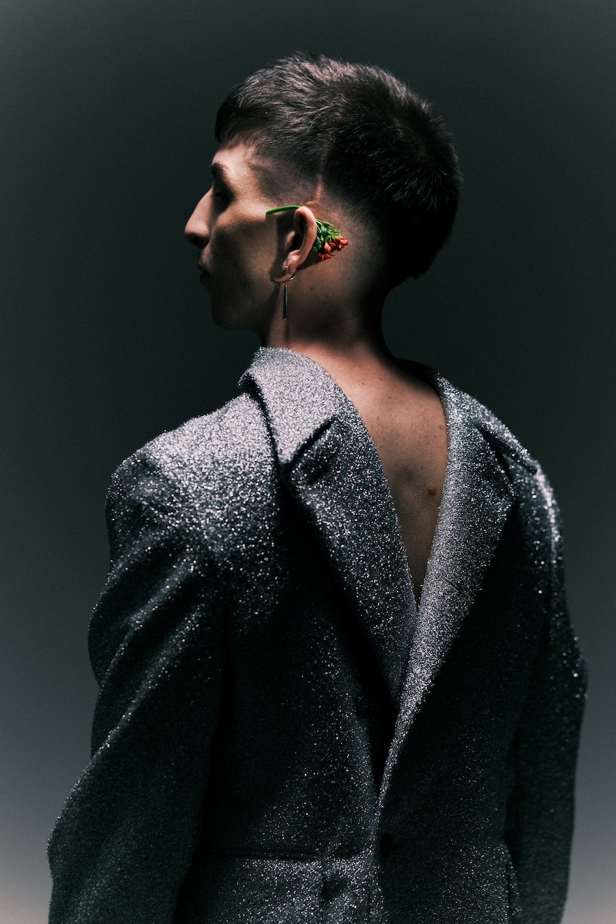 No Rain, No Flowers is a visual tale that explores vulnerability as a creative force. The aesthetics are essential and poetic, with a neutral palette and firm cuts that evoke a sense of emotional suspension. The silhouettes alternate between rigour and nudity, as if each garment were a threshold between what is held back and what is let go.