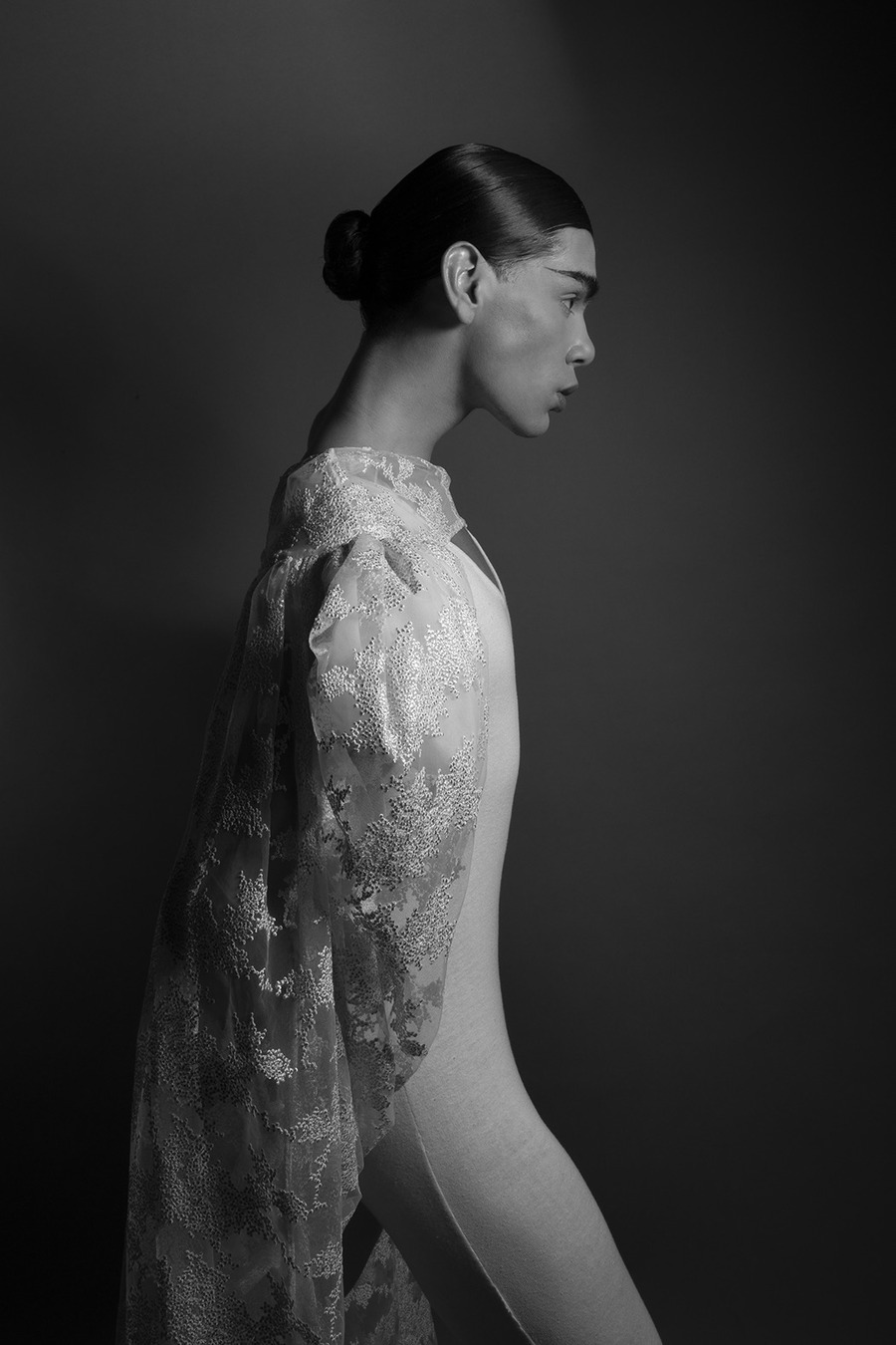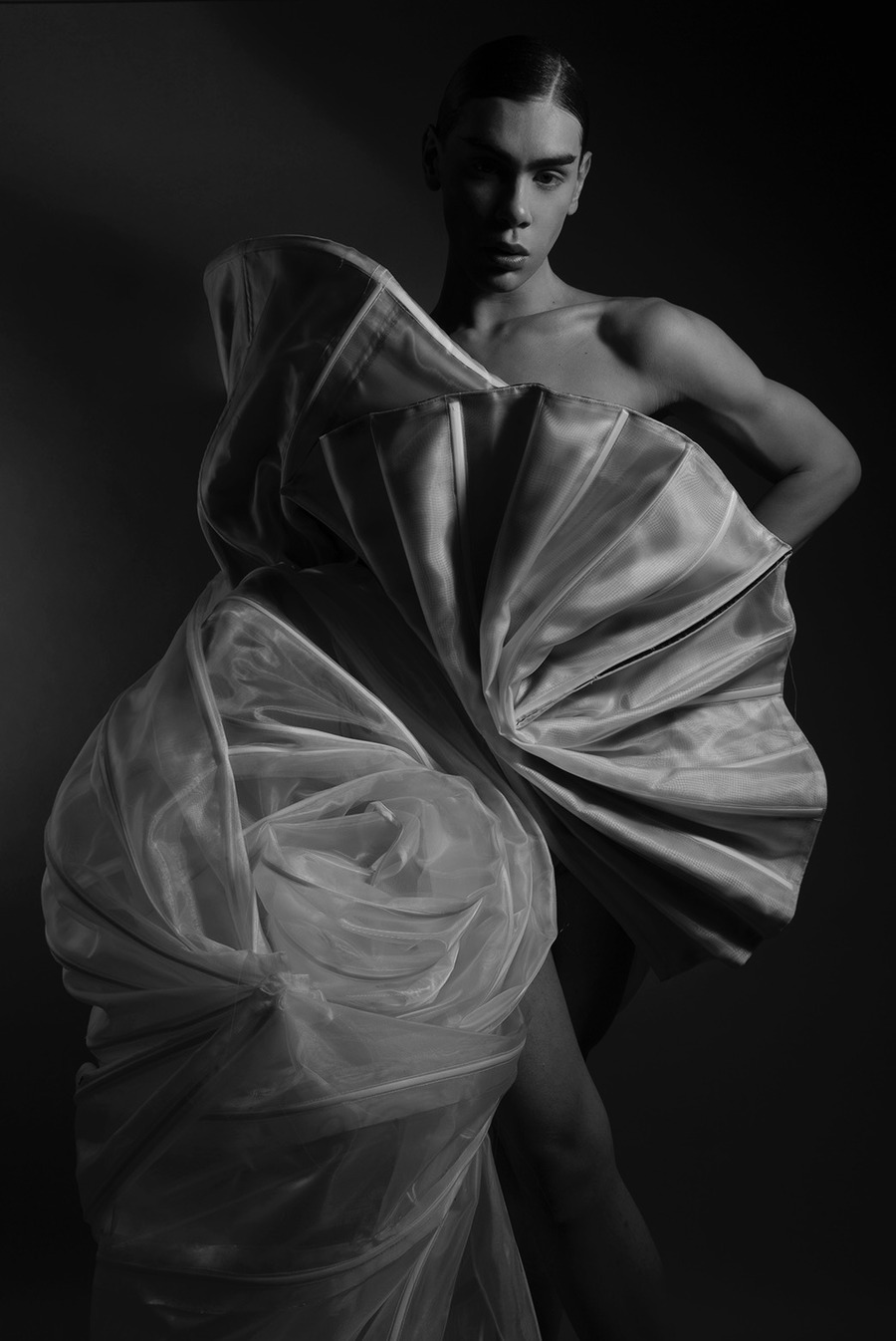 Mariano Elizalde is a model, contemporary-experimental dancer and non-binary creator deeply passionate about the arts, who, through fashion, the particular ornamental sense of dance, the spark of pose, and creativity, manifests the different nuances of their essence. The intention of this monochrome editorial, which Mariano recreated from the beauty of memory, is strongly interconnected to redirect the inflexible masculine aesthetics with a subtle classic character. From this vigorous desire to take pride in who you are, Noir Glamour was created.