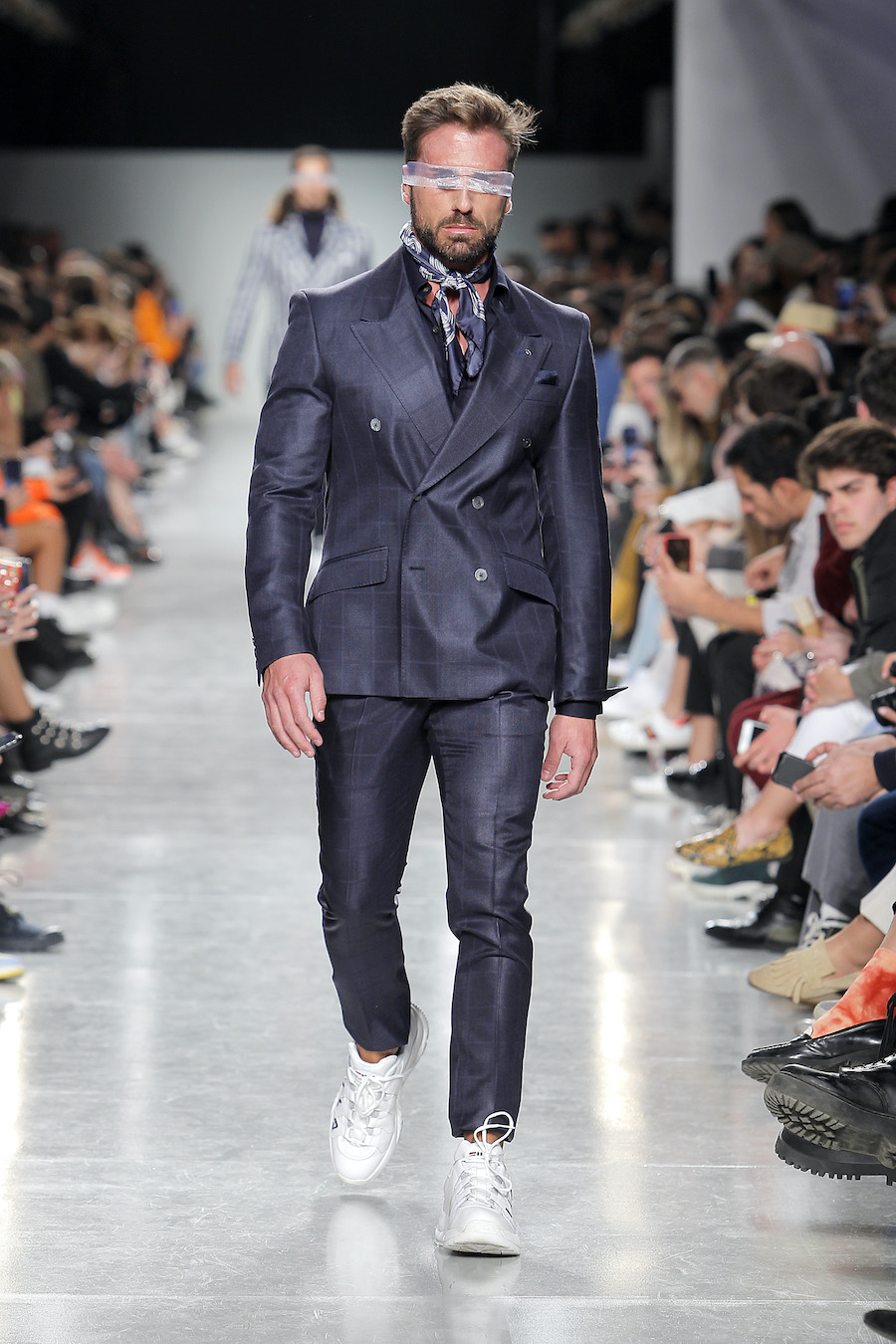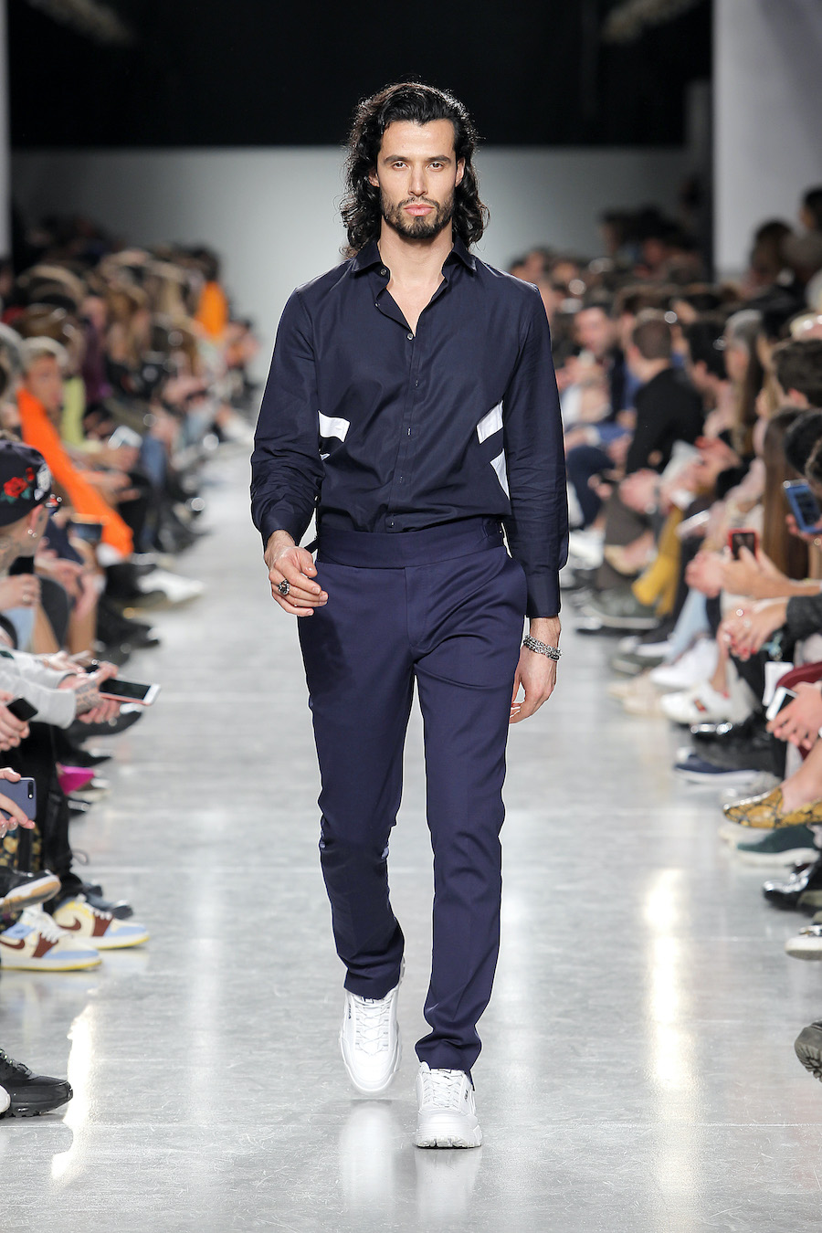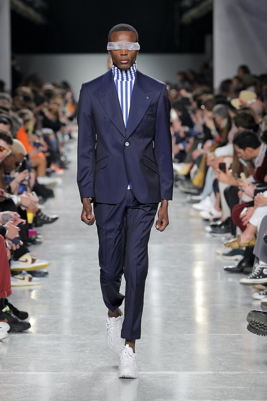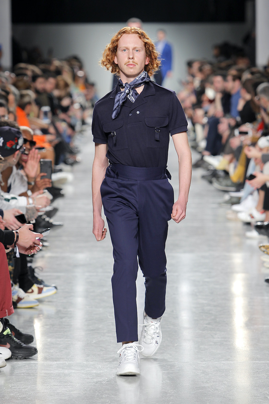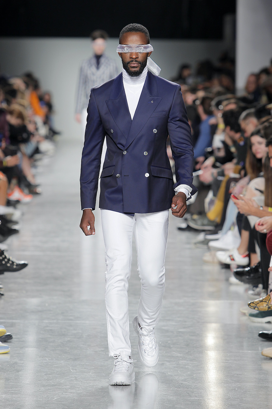 He contrasts formally with details of metropolitan clothing, between lines and silhouettes that are close to the body, with comfortable volume games, challenging scales of proportion of modern urban life. In a palette of navy blue, Sado blue and white, the designer plays with natural raw materials, from wool to cotton, animated by new technologies, guaranteed to be in balance with the world.