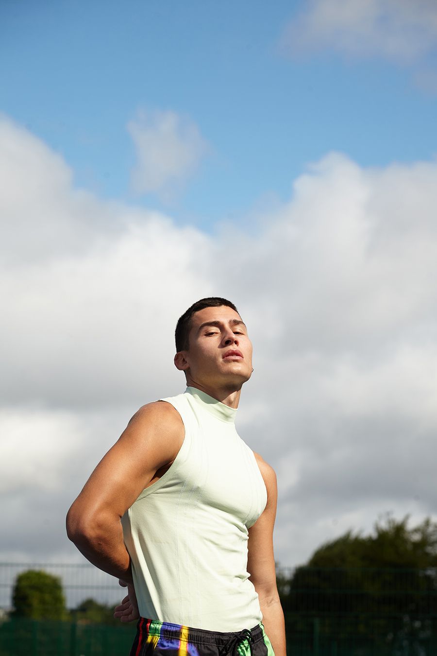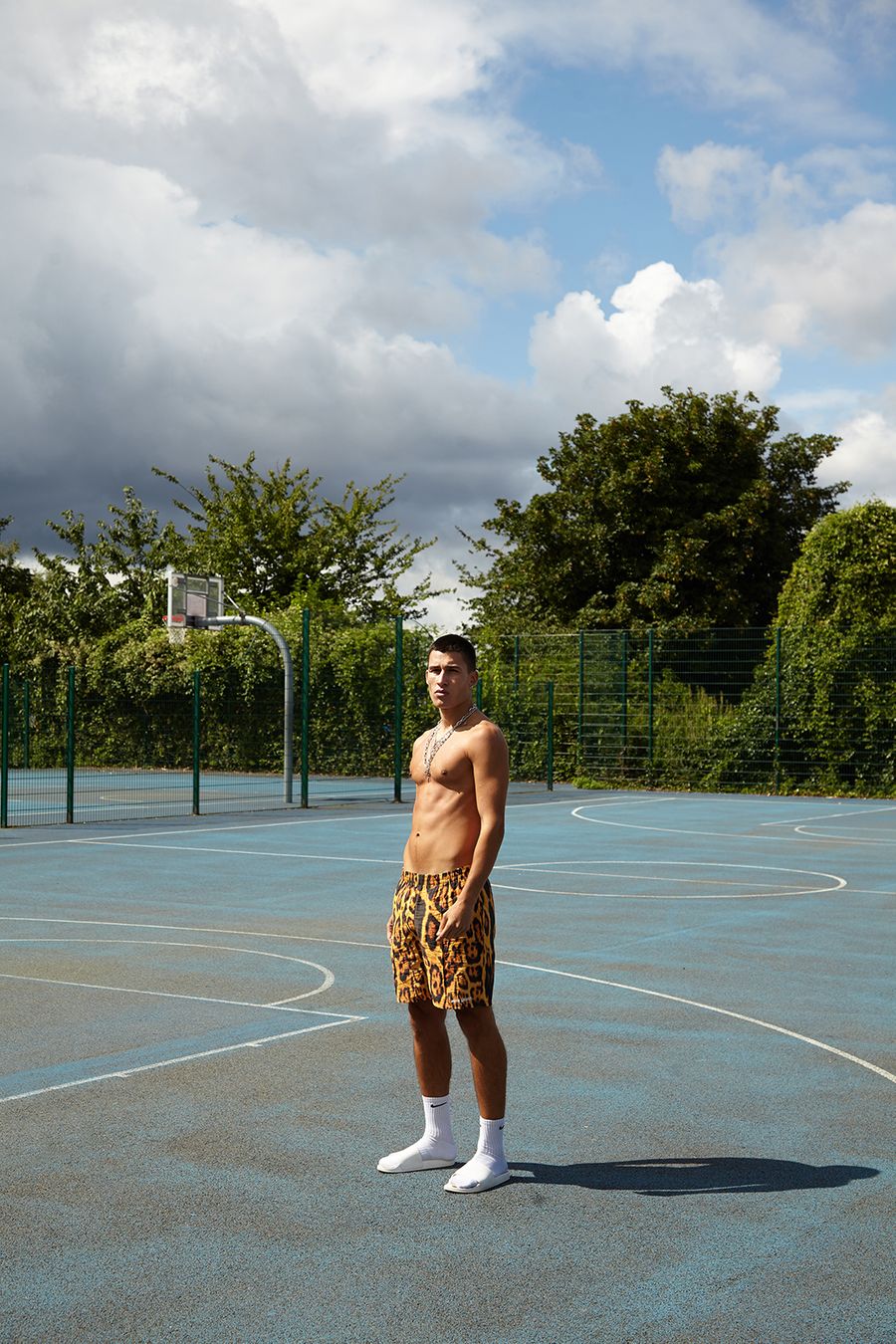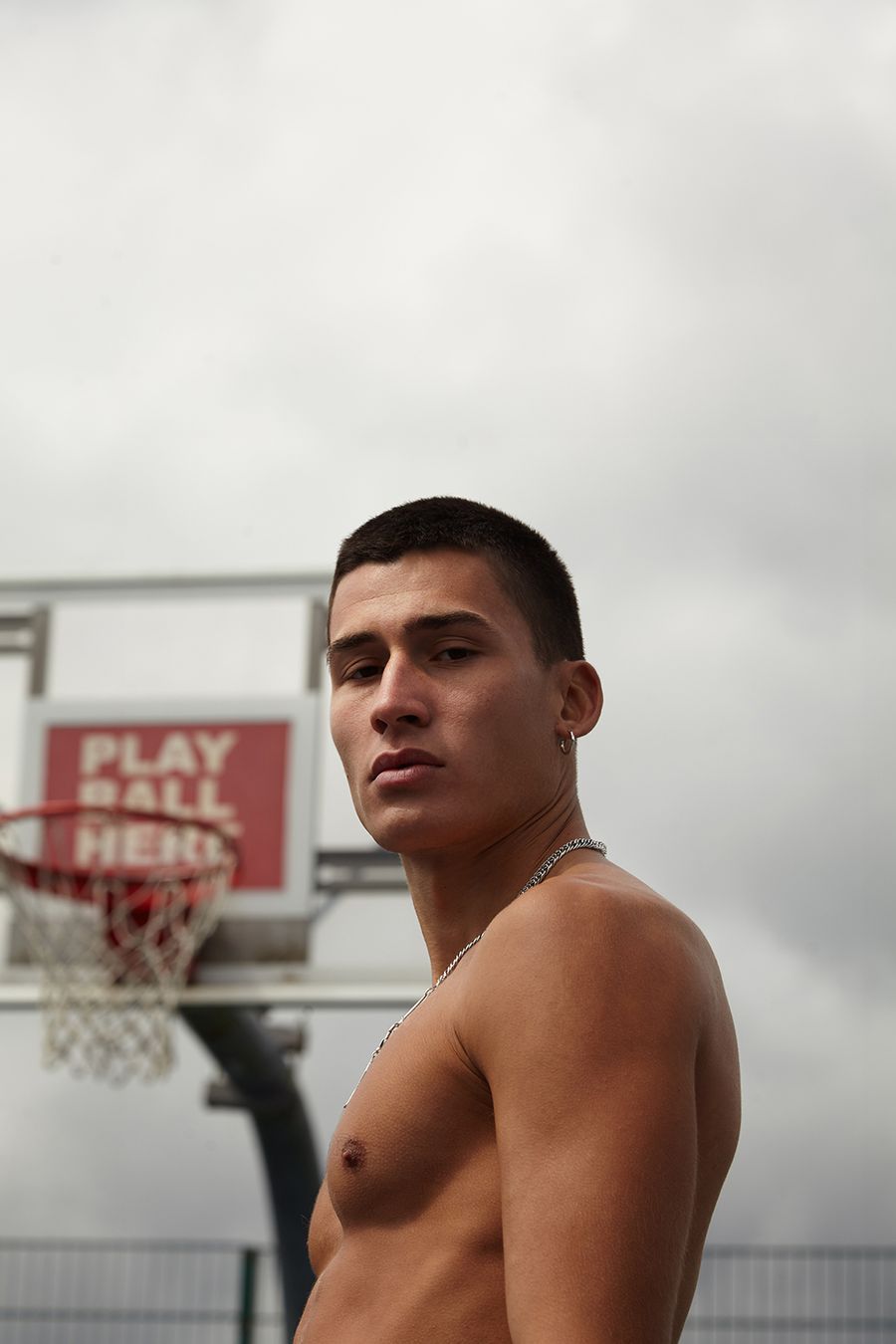 Photographer Karl Slater shoots Thanos Adamopoulos in this KALTBLUT exclusive. Shoot in the iconic North London basketball park, while taking a moment to enjoy the rare patches of sun we get in London. Thanos wears Adidas Originals, 9N1M SENSE, Puma, Nike and more.