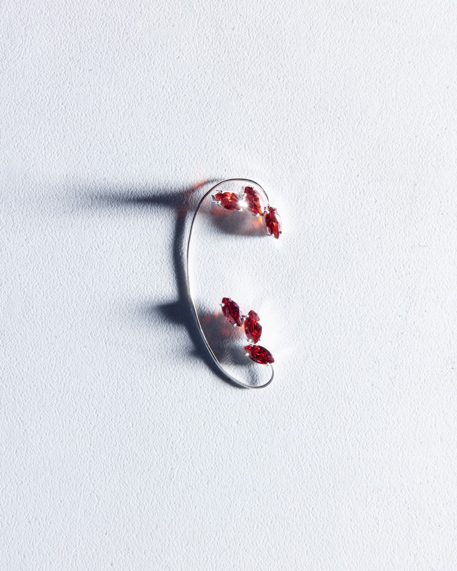 According to the designer, the inspiration for the cuff was a serendipitous amalgamation of editorial experimentation and customer demand. Initially conceived as a response to client requests stemming from an editorial photo, the cuff epitomizes the harmonious fusion of form and function. “What started as an impromptu adornment with gemstones on a whim quickly gained traction when our clients expressed interest in purchasing what they believed to be an earring. It was then that I realized the undeniable appeal of the cuff, especially in the context of Valentine’s Day,” shared Omelia.