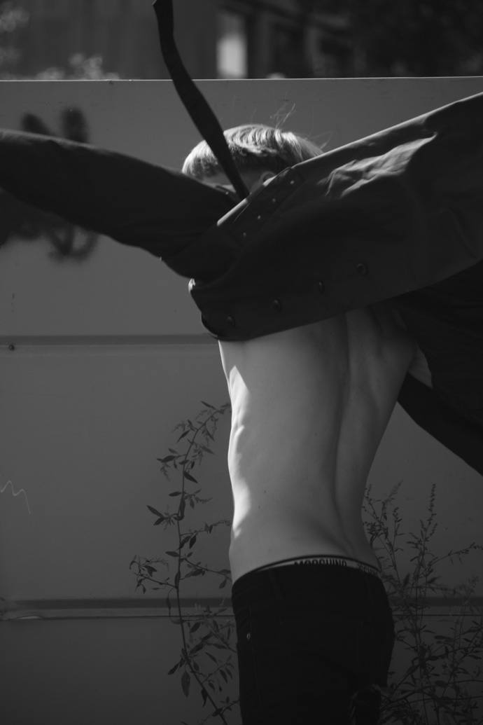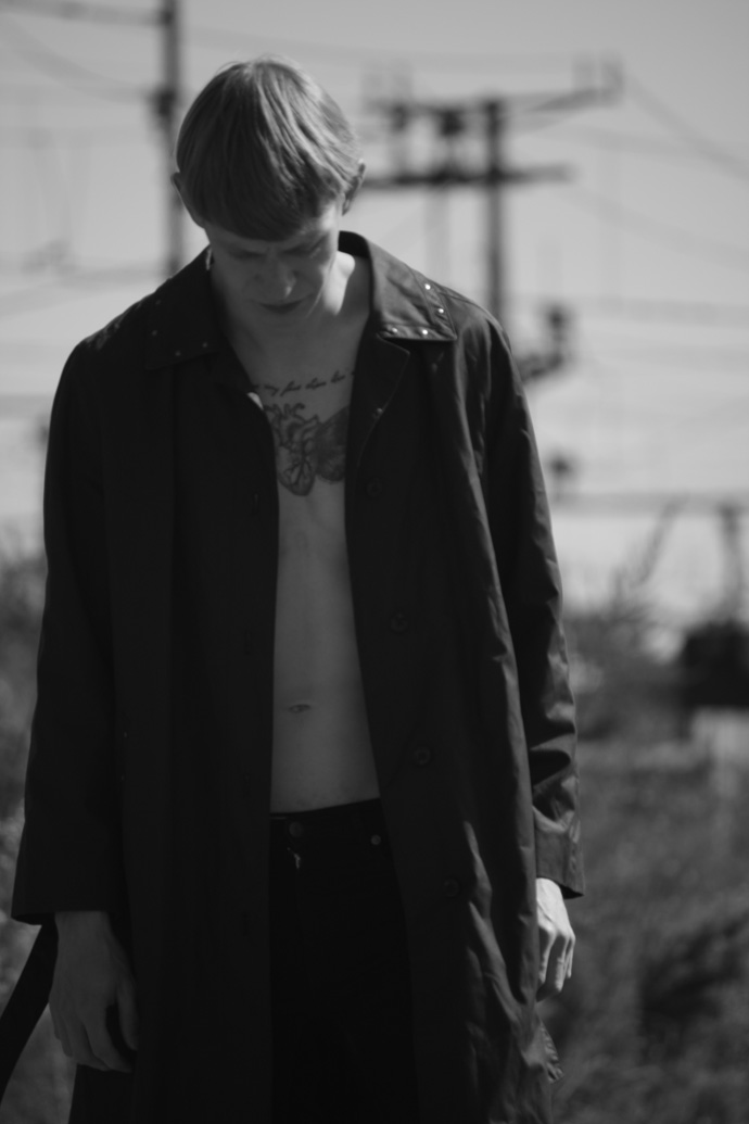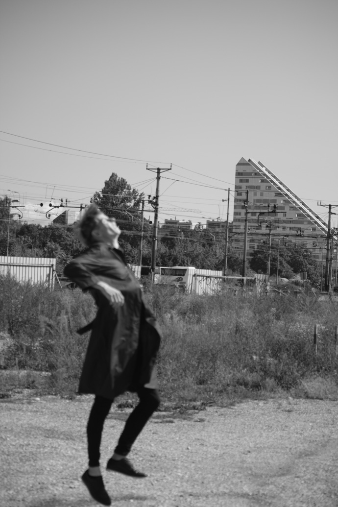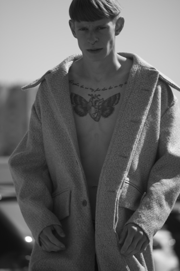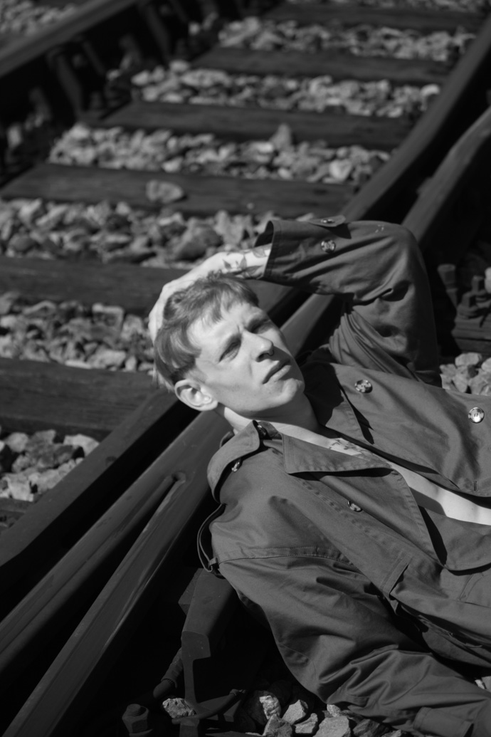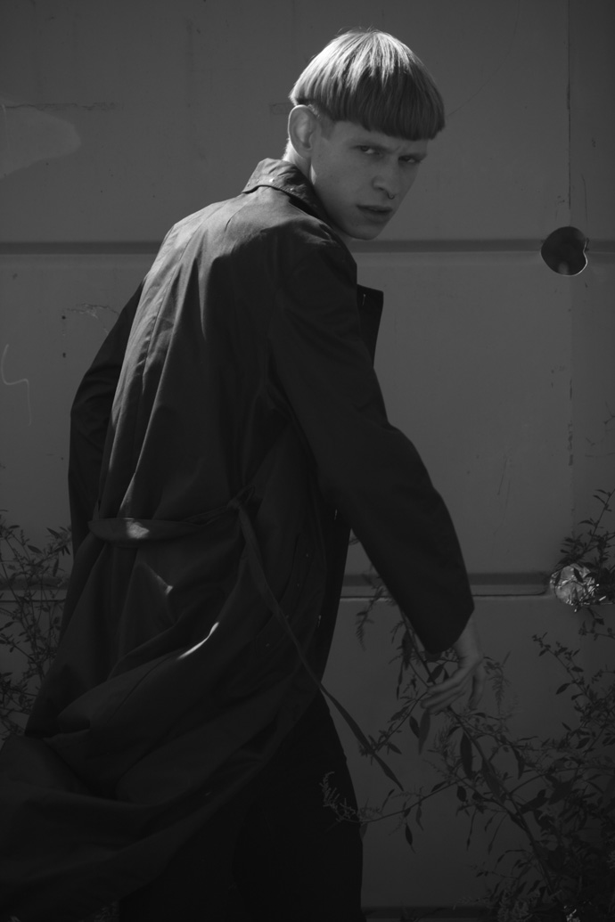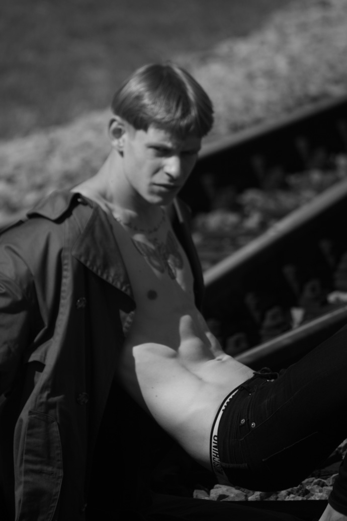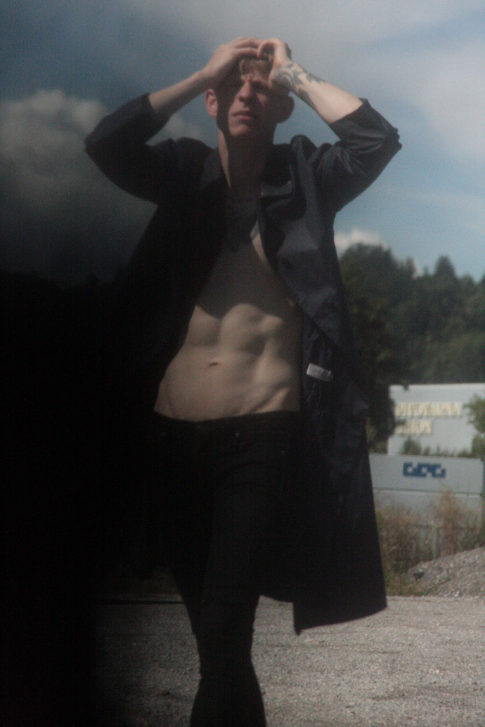 A KALTBLUT exclusive male model feature introducing Rok Vrečer signed at Haze Management and New Generation Model Management. Photography by Marijo Zupanov. Editor: Timi Letonja. Zupanov decided to do the photoshoot on this parking lot area that is placed right next to the main railway station of Ljubljana city. When you come out from the railway station you are faced right away with the grey fence surrounding the parking lot all around. When you enter it without a car you can soon realise the bizarre moment that there is. Parking lot is a flat ground macadam covered with some wild life plants growing wildly on its edges. All the fancy cars and a new hotel build recently on the opposite side of the road compliment to the bizarreness. Zupanov found the rawness of the model’s look fitting perfectly to this raw place on the edge of Ljubljana’s city centre.