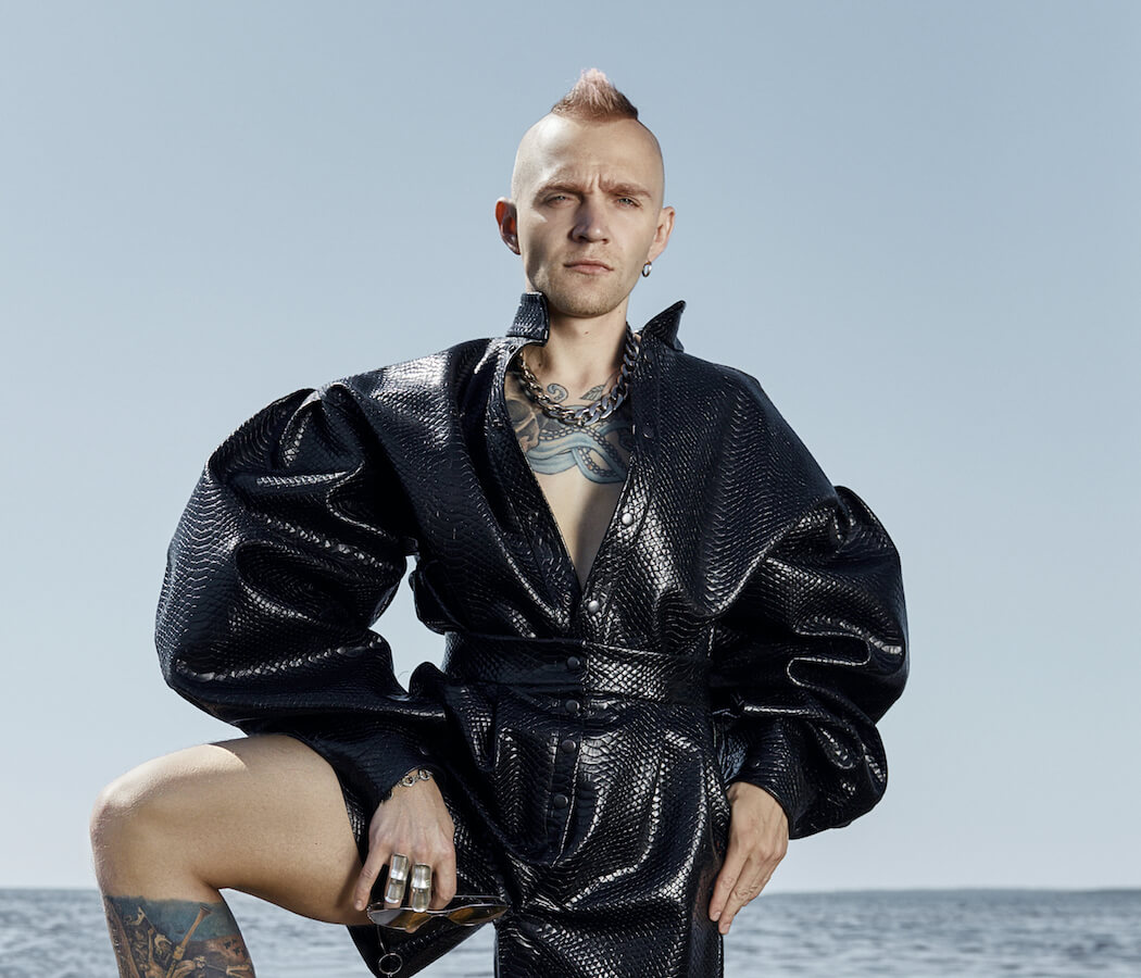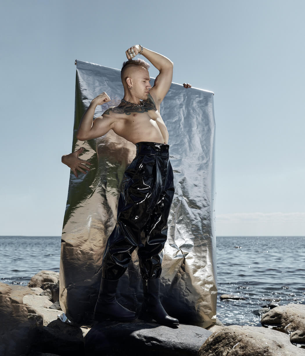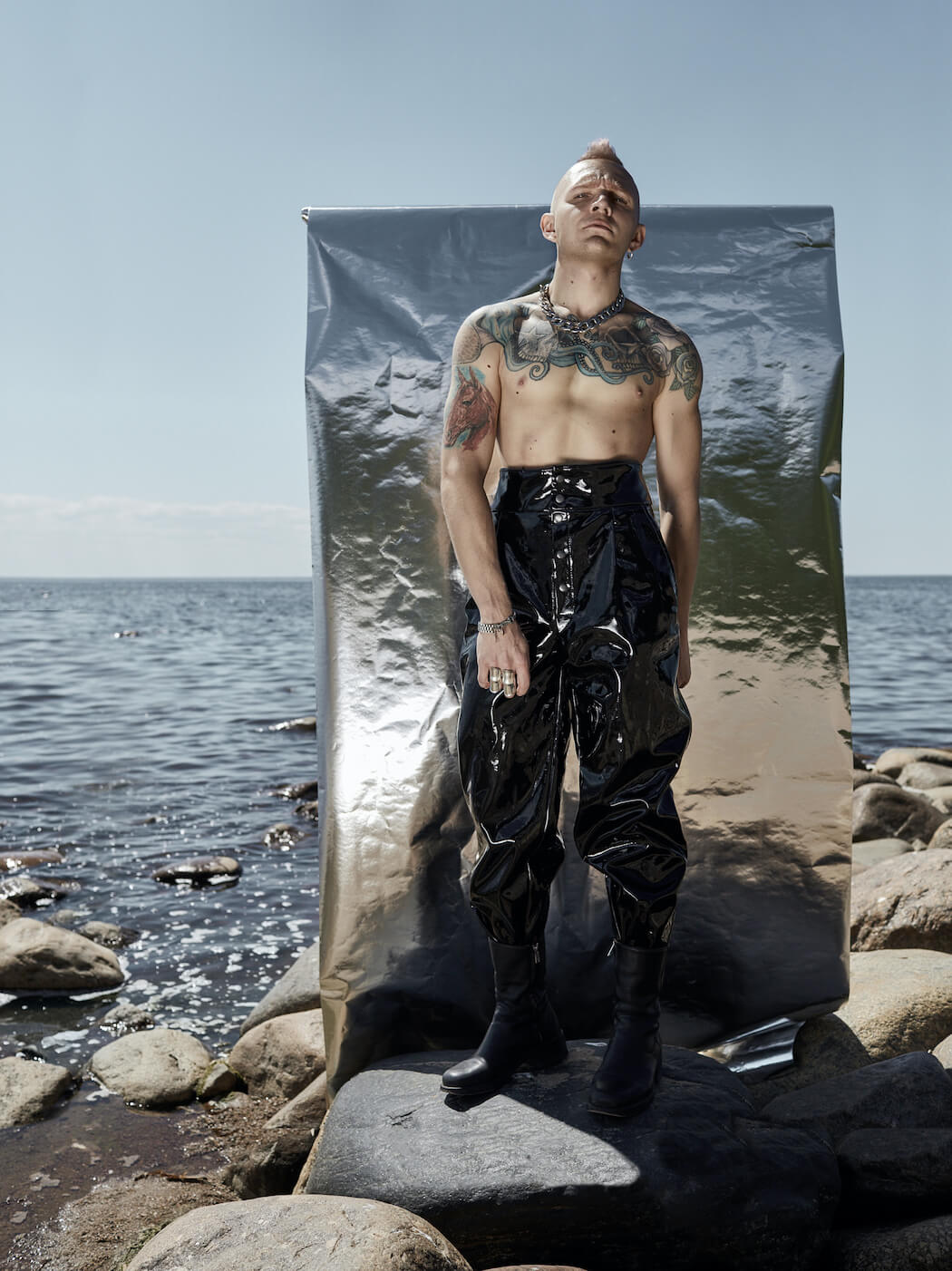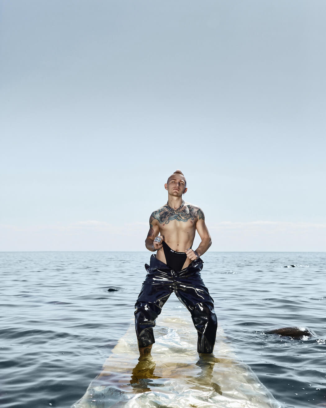 A KALTBLUT exclusive. Photography by Dima Cube. Model and Stylist is Cake. “We made this photo session on the shores of the Baltic Bay near the beautiful city of St. Petersburg. Our shooting is dedicated to the young talented fashion designer Yana Gilvichiute from St. Petersburg. Yana presents her brand GILVICHYUTE, which has released a new collection of menswear, inspired by the combination of the Renaissance and 90s. Pastel shades, ruffles, transparency combined with hard voluminous and sharp shapes, black leather, the shortest bottoms. The clash of different styles, femininity and masculinity, youth, beauty. Ugly beauty.”