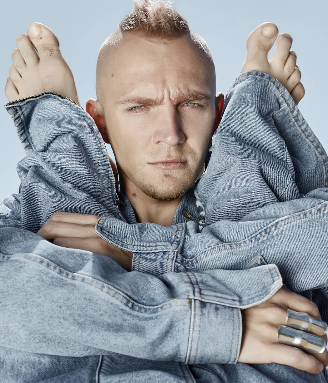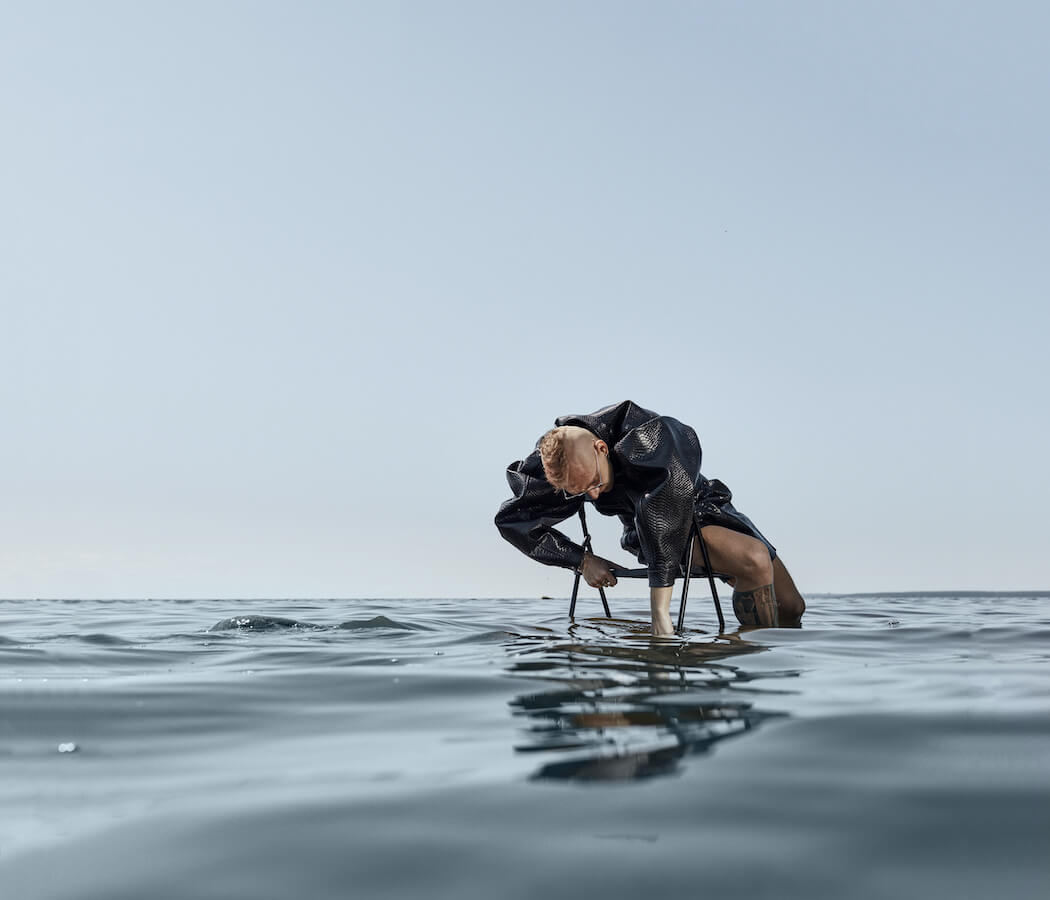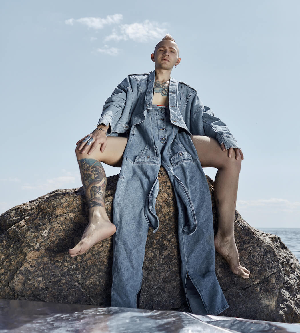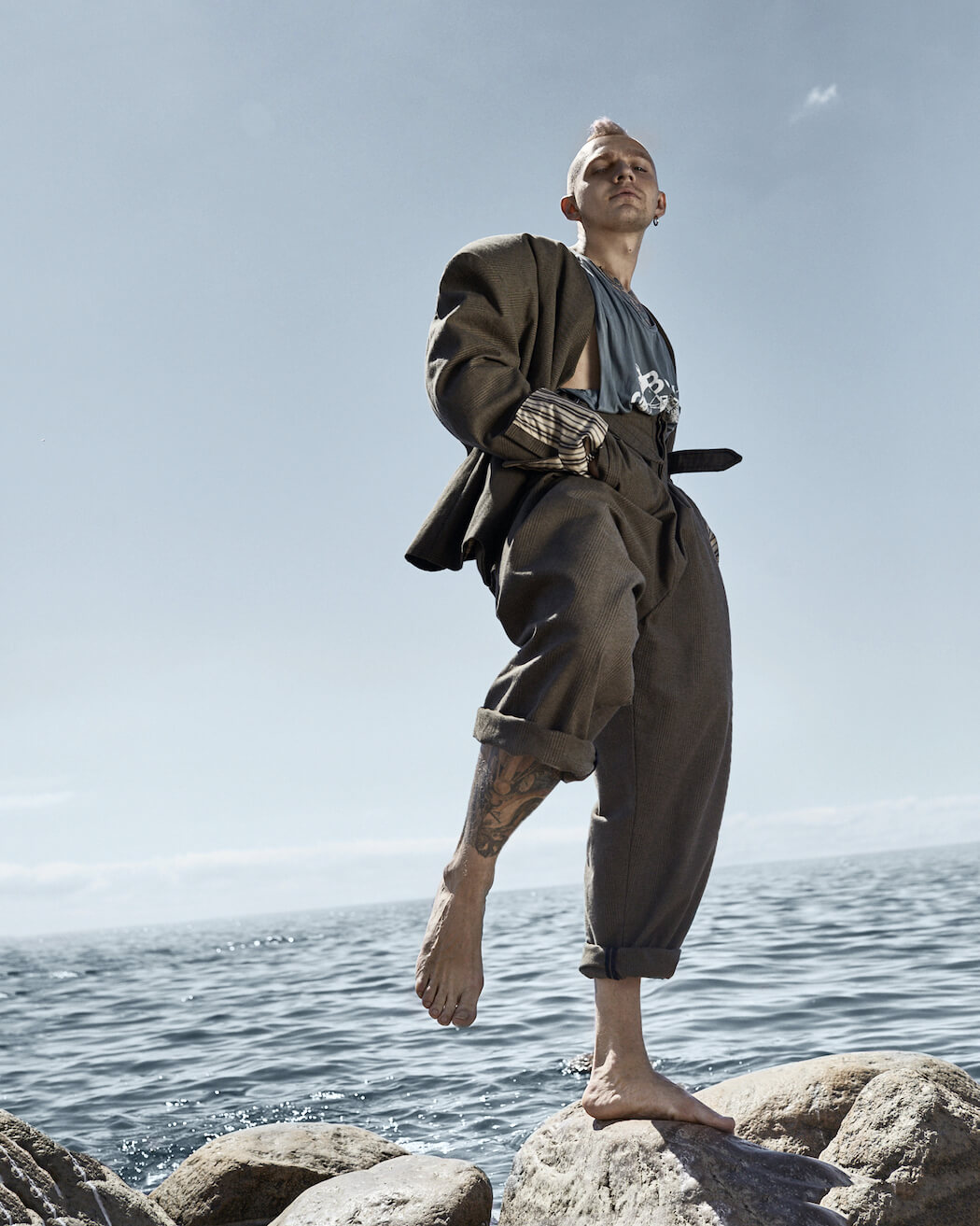 A KALTBLUT exclusive. Photography by Dima Cube. Model and Stylist is Cake. “We made this photo session on the shores of the Baltic Bay near the beautiful city of St. Petersburg. Our shooting is dedicated to the young talented fashion designer Yana Gilvichiute from St. Petersburg. Yana presents her brand GILVICHYUTE, which has released a new collection of menswear, inspired by the combination of the Renaissance and 90s. Pastel shades, ruffles, transparency combined with hard voluminous and sharp shapes, black leather, the shortest bottoms. The clash of different styles, femininity and masculinity, youth, beauty. Ugly beauty.”