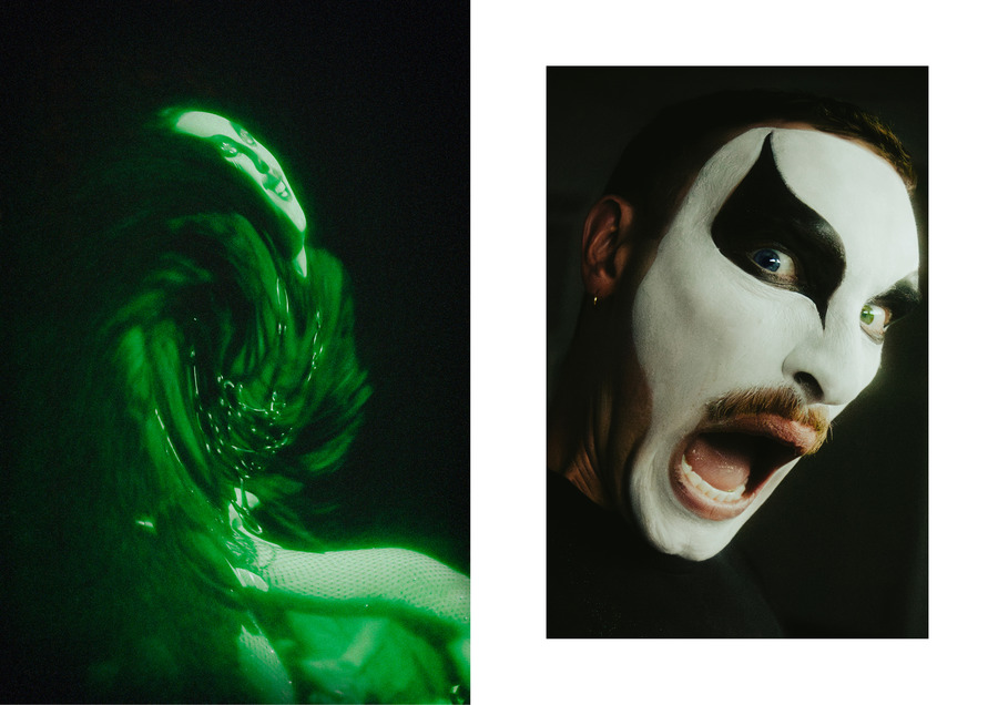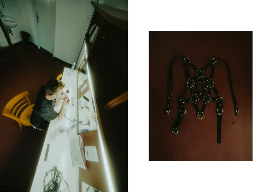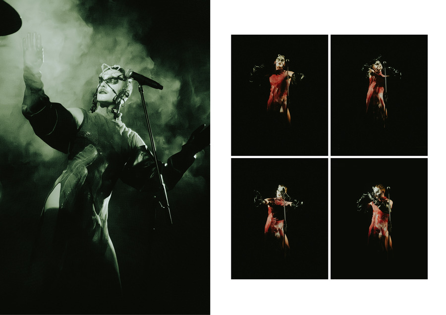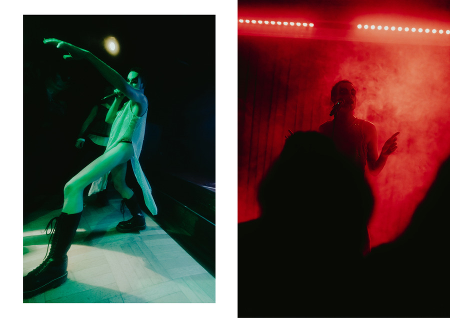 Most of the songs were from Oyer’s unreleased album VENUS; a project that Oyer generated at the Rupert Residency Program in Vilnius in 2021. Is this a performance or a concert? Oyer is a multi-talented artist; they paint, make sculptures, perform and produce music. They studied opera and performed in clubs. The presence of the artist, and all the the words in their rich vocal pattern combined with the vigorous performative abilities, as well as the visual aspect (costumes as worn sculptures), recalls Leos Carax’s fantasy film Holy Motors (2012), in which the protagonist’s job is to perform as a variety of freaks. Similarly, Oyer’s performance is like a fruit with layers, diligently peeled off. They create an absurdity, chanting in a holy manner, turning the stage into a masquerade with a tight red dress, long black latex gloves and a headpiece; black leather harness and a black bodysuit; shiny see-through dress, and the make up accompanying (the face covered in white, big black wing-like shape around the eyes). Well, say, each character is a sculpture, singing.