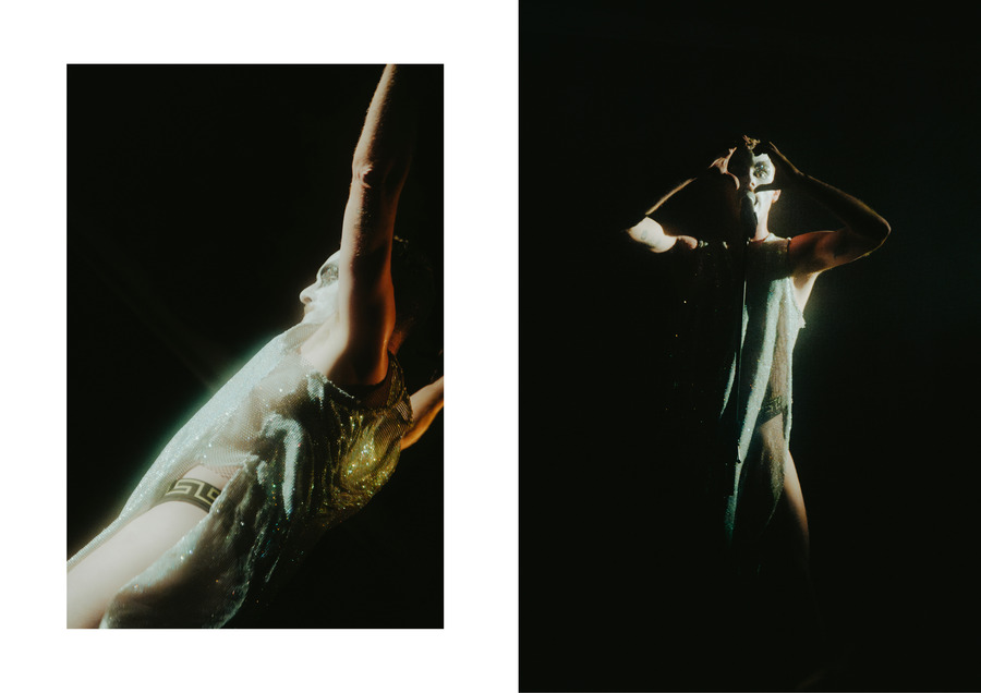 On stage, a sculpture turns into the costume of the artist. A stiff black shiny material, reminiscent of a heavy damask, whereas it’s only the light that acts as an ornament. It is like dried petroleum, leaking. Later I learn that Tyler Matthew Oyer calls it a shroud—I don’t know what it means: “a length of cloth or an enveloping garment in which a dead person is wrapped for burial” says the dictionary. I stop for a moment. Then, I realized: that considering the shapeshifting that happened in the performance/concert VENUS in April 2023, and many characters appeared and disappeared on Tyler’s skin and presence, the name of this sculpture makes sense for the opening scene. In this entity, decay allows new becomings, and the shift of songs tell stories in fragments.