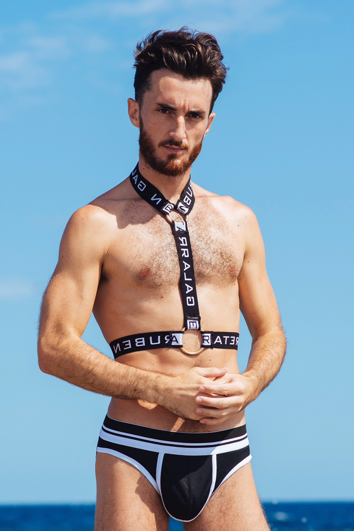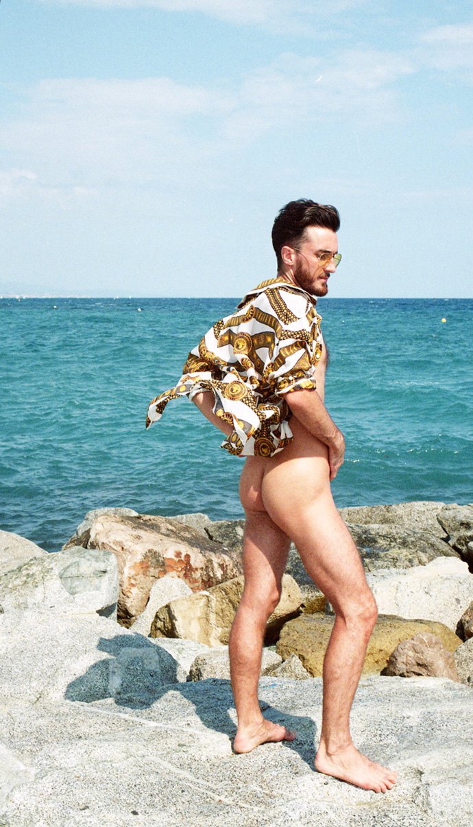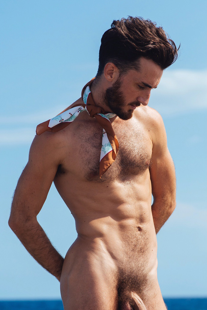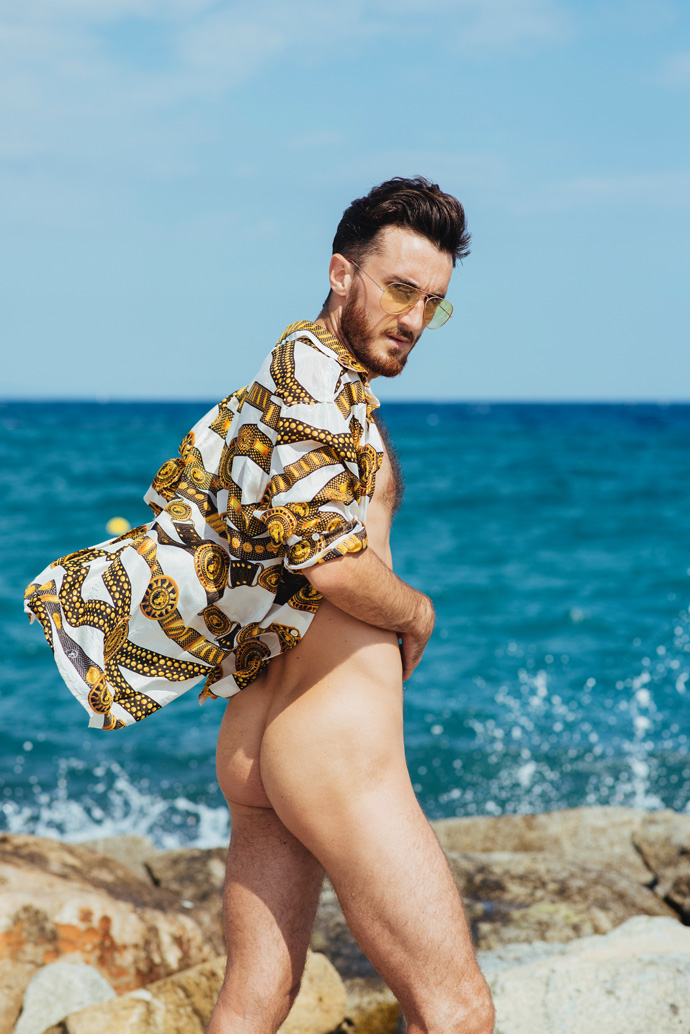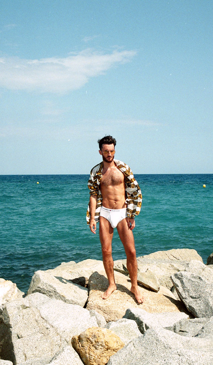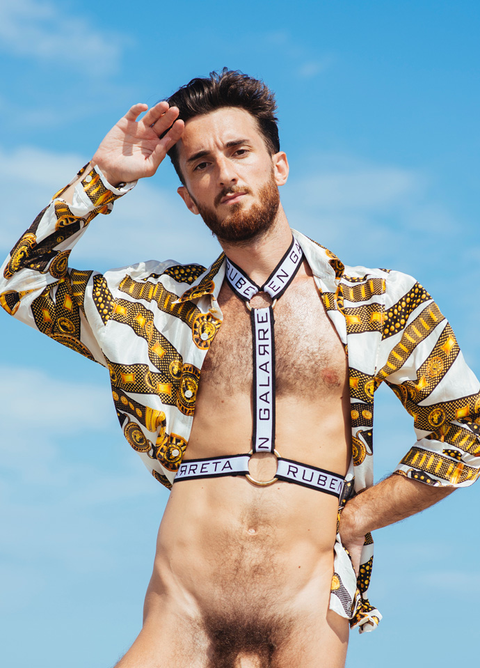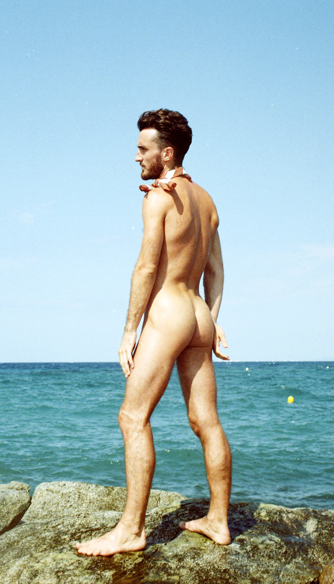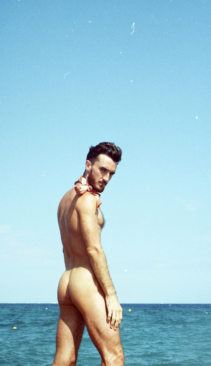 A KALTBLUT exclusive series. Starring male model and our favourite British hunk Sam Morris. Photography by Isaac Calpe. The shooting took place at Mar Bella Beach, Barcelona. Styling by Aleix Mart, Sam is wearing Shirt by Versace, Harnes by Ruben Galatarrea, Black jockstrap by Asos, Scarf by Urban Outfitters and White slip by Tommy Hilfiger.