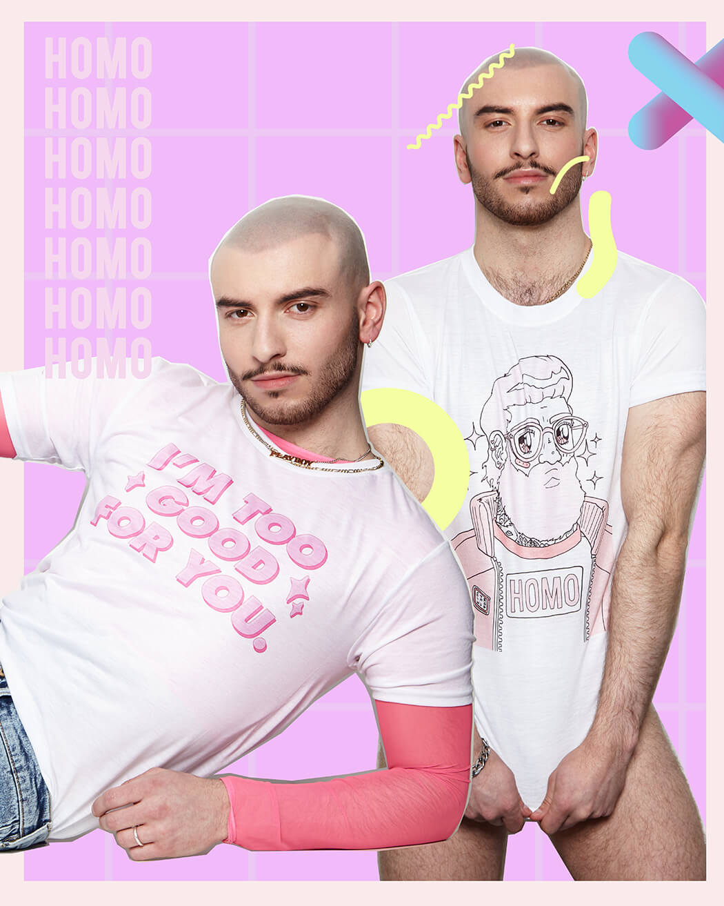 ORESTES: Individually we both had an interest in fashion, with t-shirts being the connecting element between our style. We started working with smaller queer brands promoting them through our ig accounts. After a few years we struggled to find something that truly represented us as individuals, often struggling to find brands offering something fresh and unique. After some thought and careful deliberation we decided to make our own brand, doing the things we love, taking risks and not playing by the rules. September 2018 HOMO was born.