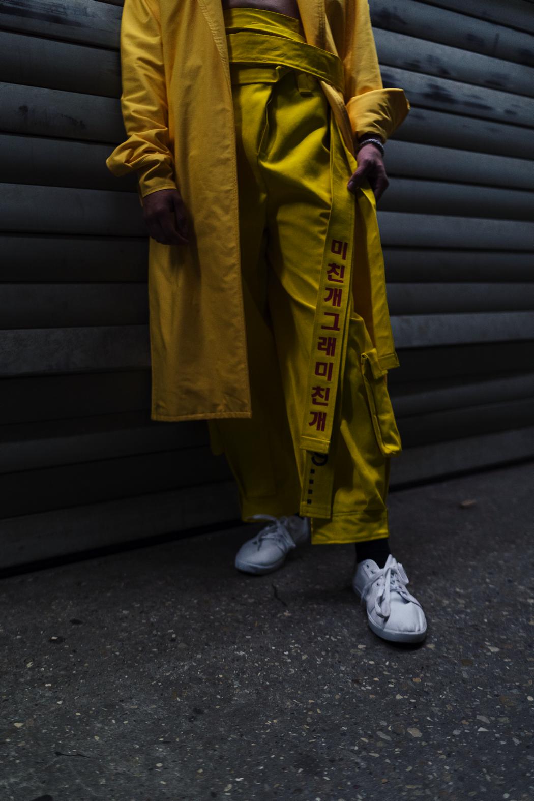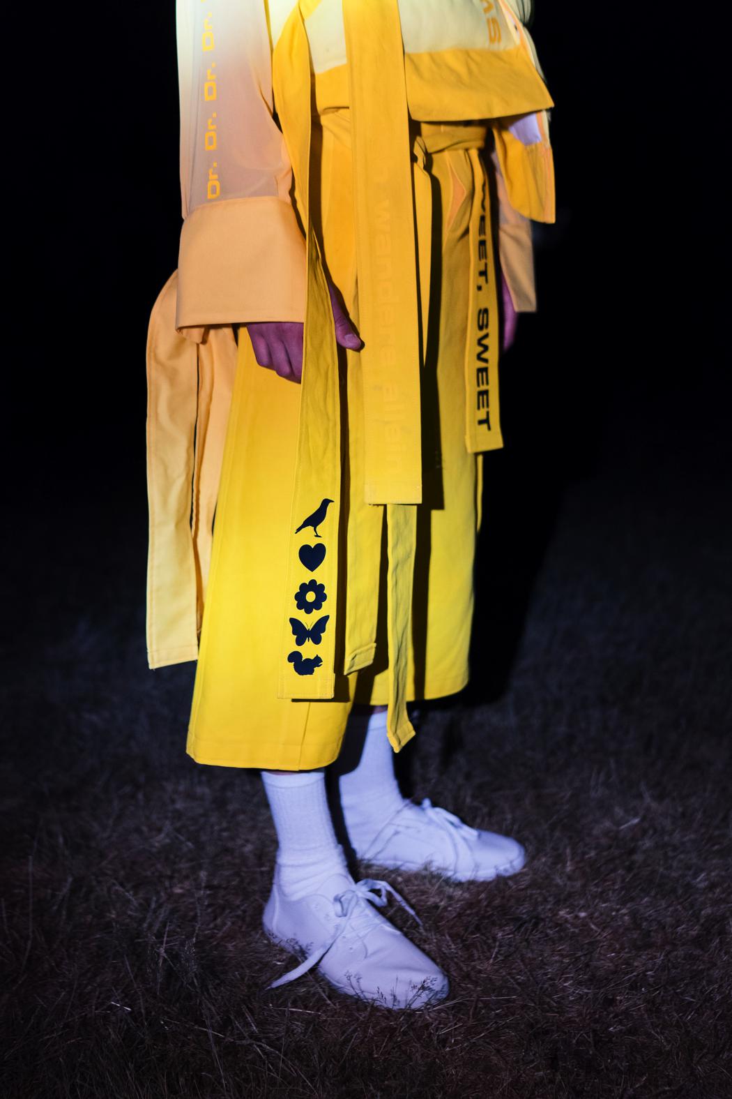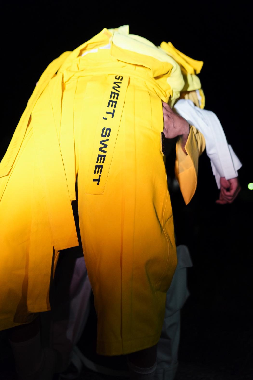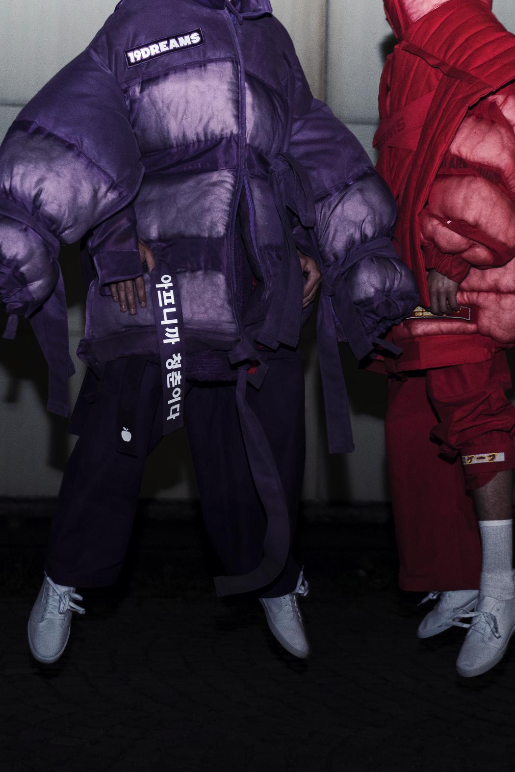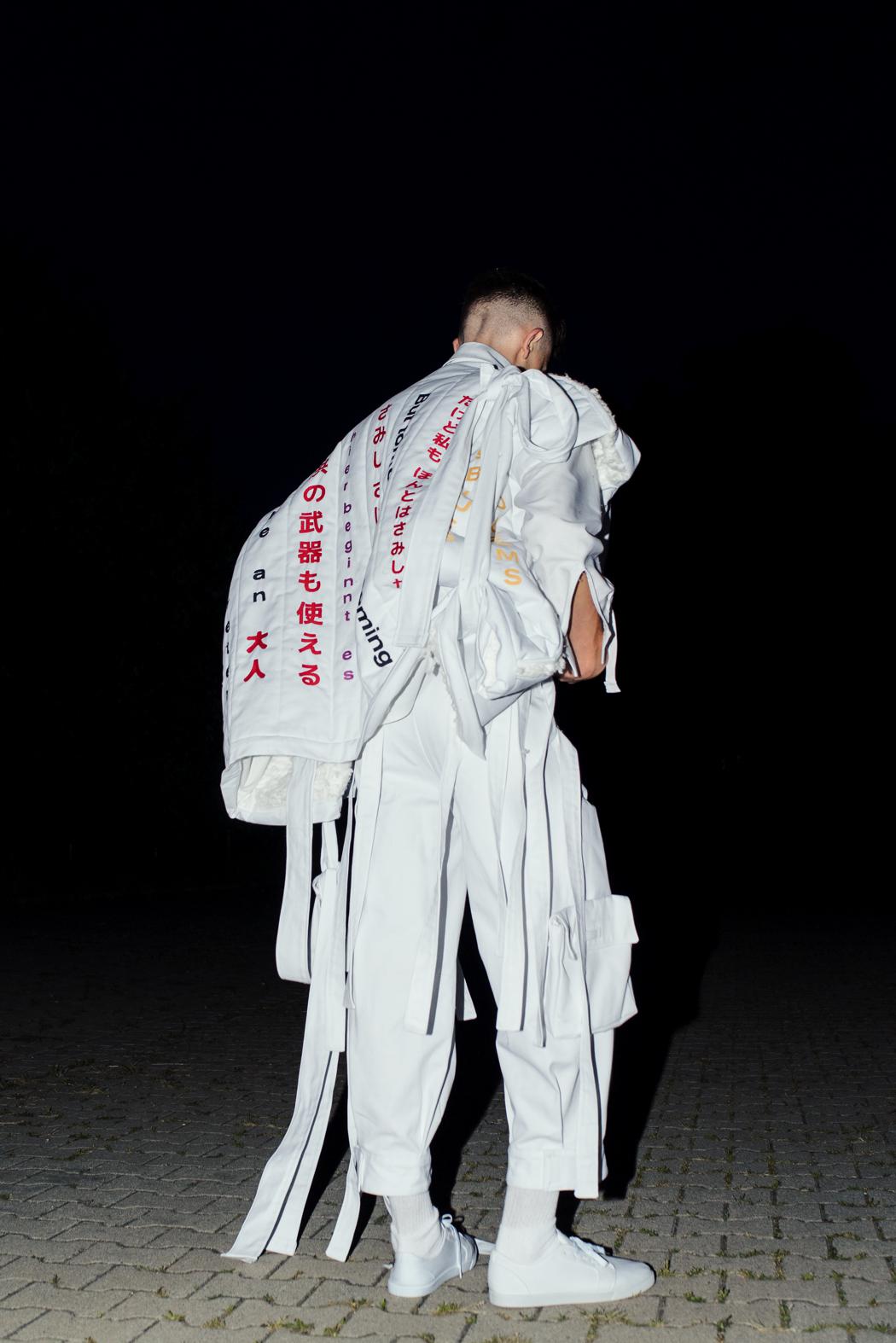 Marcel: I presented a part of my graduate Master collection. My Inspiration is „the child in ourselves“ and the decision to either suppress being a child or to let it be present in our everyday life. The psychologist Jeffrey Jensen Arnett describes the time between 18 and 30 years as „Emerging Adulthood“. The phase between youth and adulthood is extending more and more in recent years. Today, entering the youth phase begins earlier than ever before. The development of sexuality is increasingly shifting forward, young people enter this phase about the age of twelve today. The transition to adult life automatically extends itself further and further backward. In the time between the age of 18 to 30, we decide which journey we want to go. It‘s the final farewell to the childhood: the first momentous decisions will be made – the opening in a new chapter in life. The Japanese subculture of the Bosozoku, as they stand rebellious against the establishment, is something that symbolizes a standstill of youth and was a big inspiration for the style of this collection. Developmental psychological aspects and various musical pieces by some Japanese, Korean and American musicians which are dealing with the theme of growing up, serve also as a source of inspiration for my creative work.