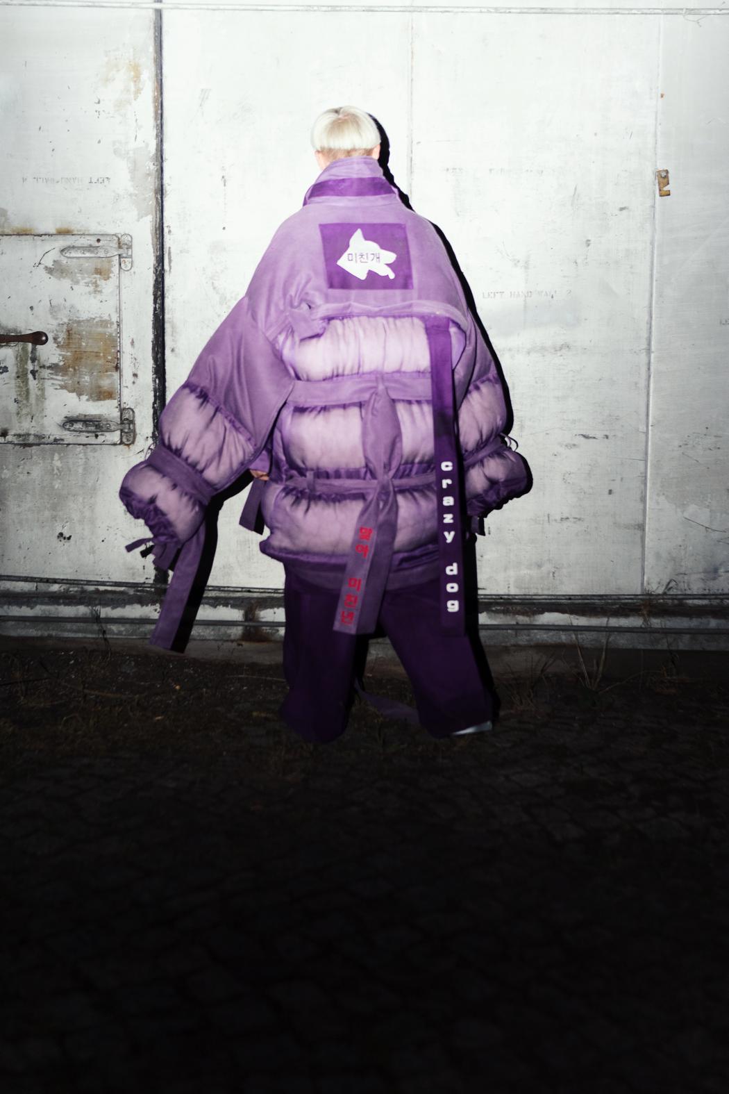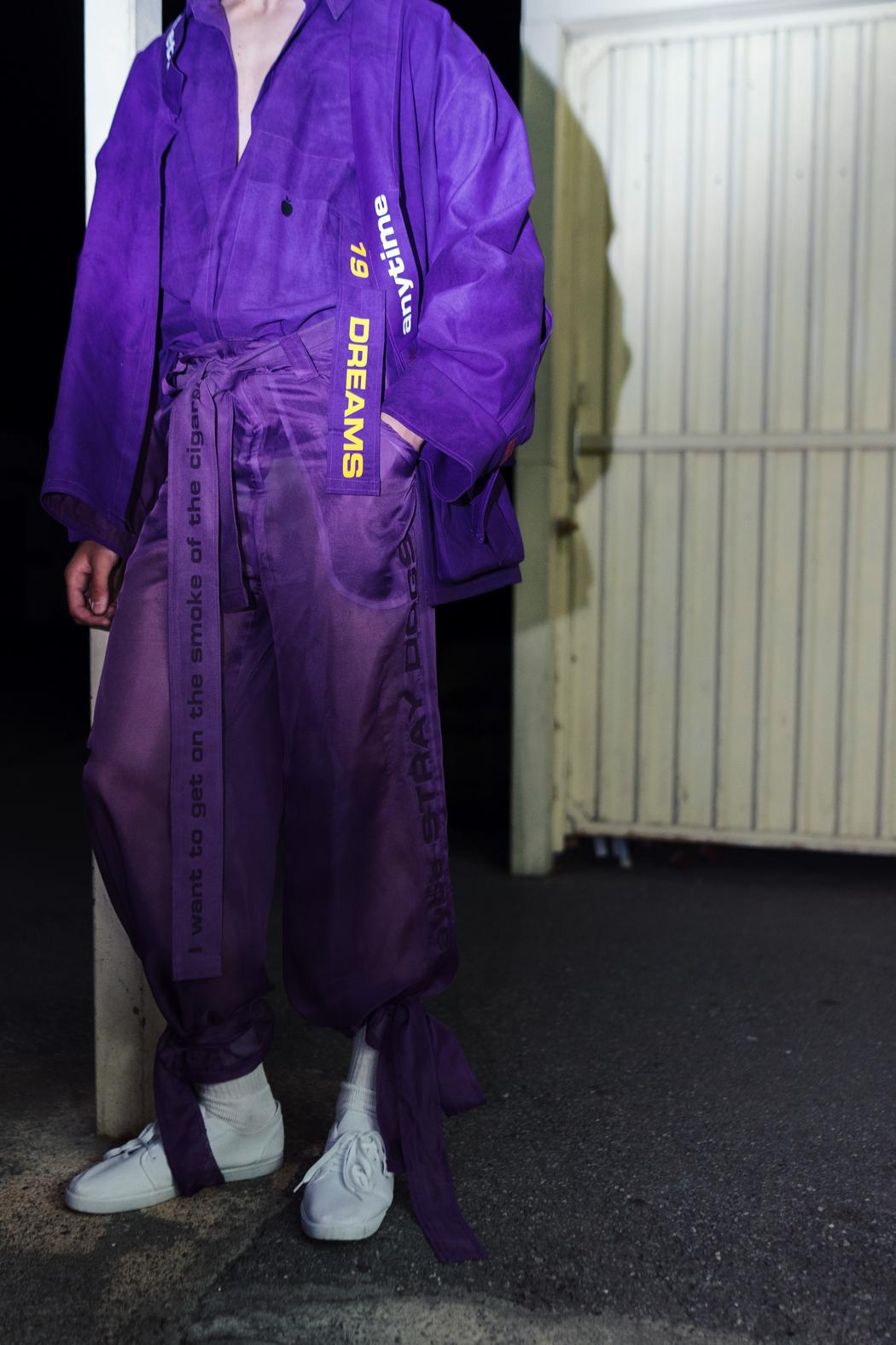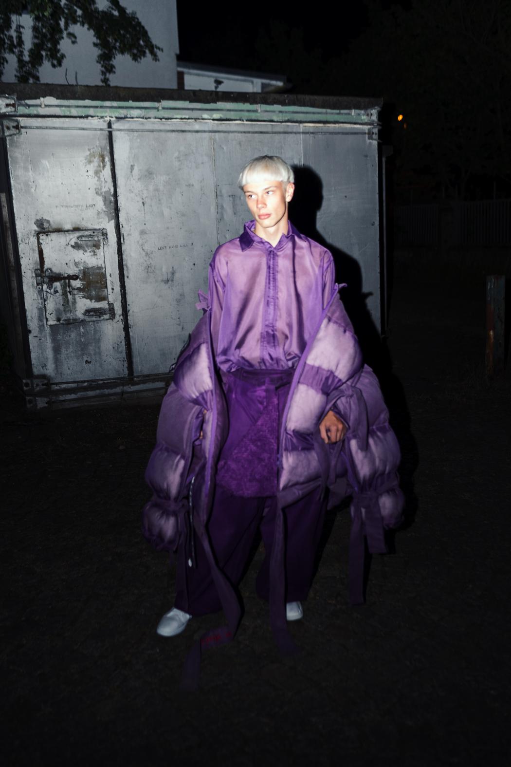 Marcel: I presented a part of my graduate Master collection. My Inspiration is „the child in ourselves“ and the decision to either suppress being a child or to let it be present in our everyday life. The psychologist Jeffrey Jensen Arnett describes the time between 18 and 30 years as „Emerging Adulthood“. The phase between youth and adulthood is extending more and more in recent years. Today, entering the youth phase begins earlier than ever before. The development of sexuality is increasingly shifting forward, young people enter this phase about the age of twelve today. The transition to adult life automatically extends itself further and further backward. In the time between the age of 18 to 30, we decide which journey we want to go. It‘s the final farewell to the childhood: the first momentous decisions will be made – the opening in a new chapter in life. The Japanese subculture of the Bosozoku, as they stand rebellious against the establishment, is something that symbolizes a standstill of youth and was a big inspiration for the style of this collection. Developmental psychological aspects and various musical pieces by some Japanese, Korean and American musicians which are dealing with the theme of growing up, serve also as a source of inspiration for my creative work.