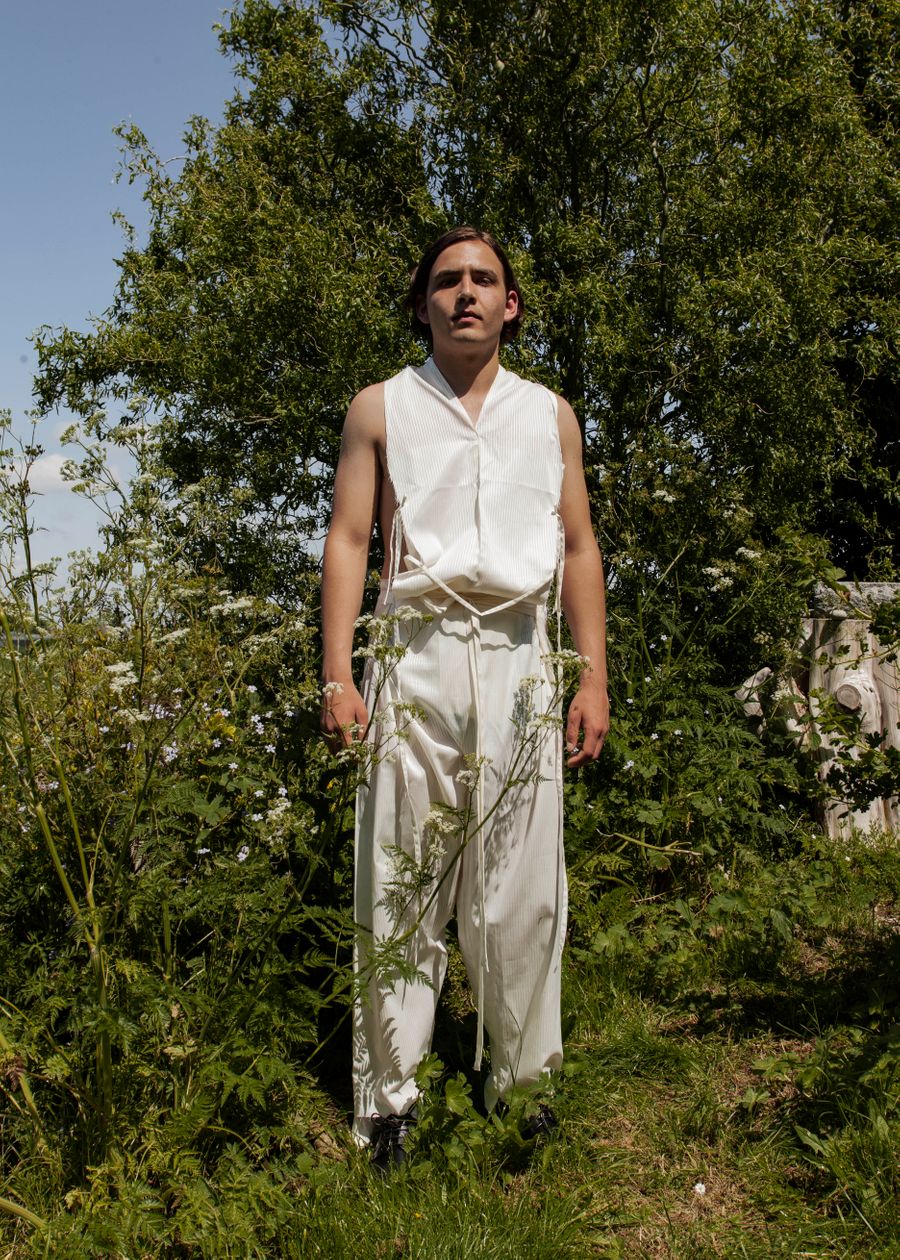 The green apron with the draped sleeves and burnout technique. Next to that one, I love the long white shirt with all waste material folded into the front piece.