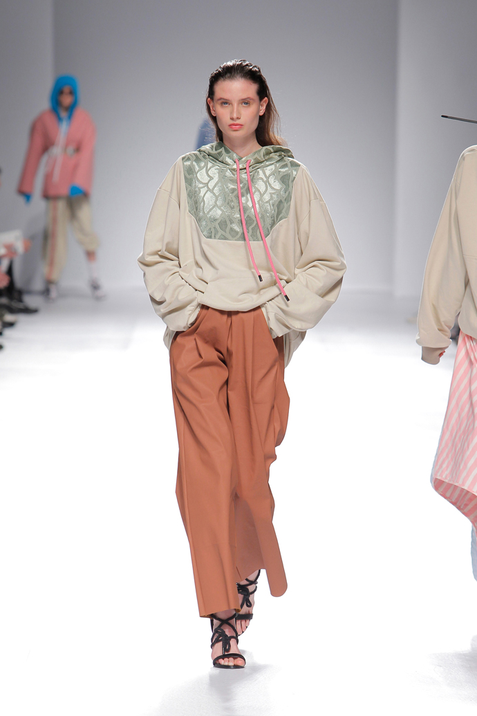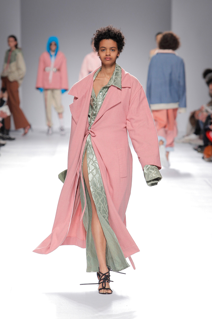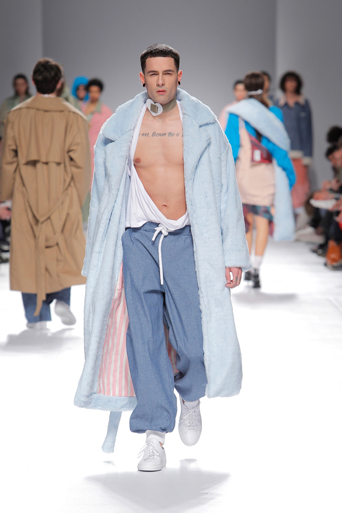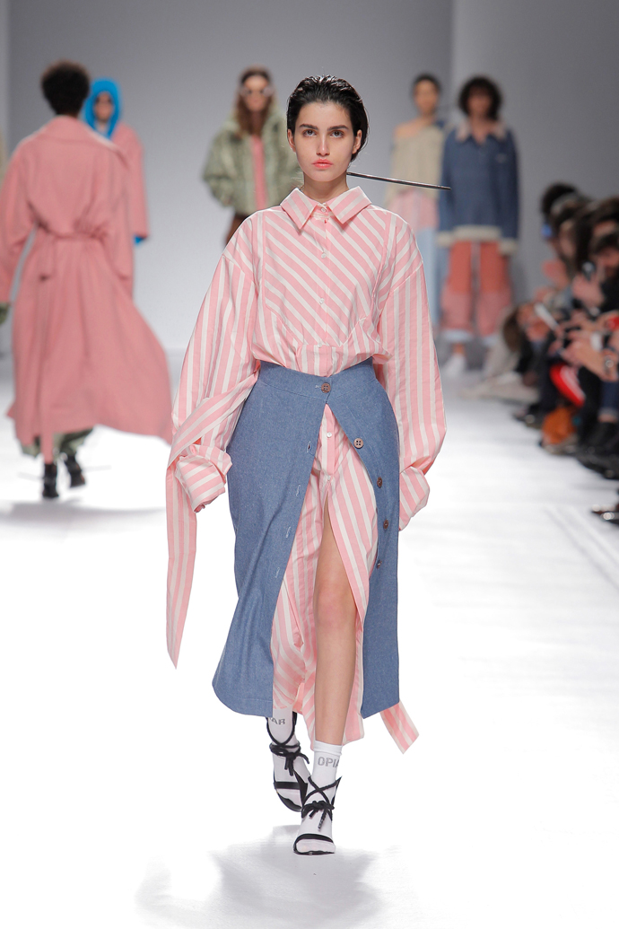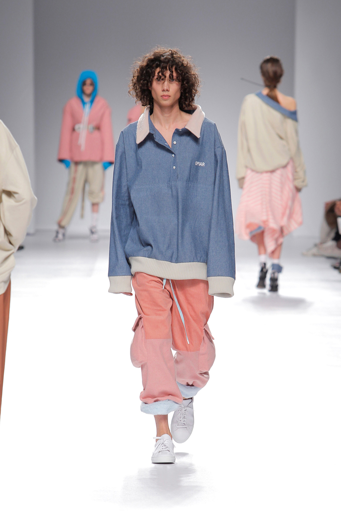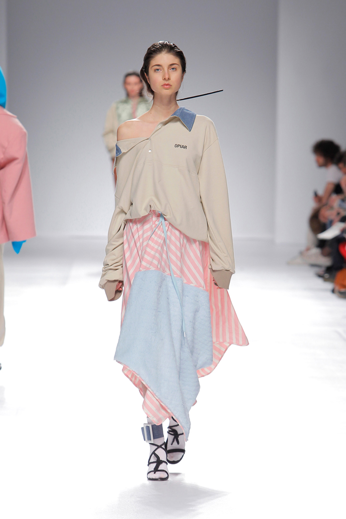 #ModaLisboa – One To Watch from the Sangue Novo section at the fashion fest in Portugal. OPIAR is an unisex clothing brand that focuses on providing new life to classic garments foundations by utilizing different finishing details, volumes, shapes and fabrics. This brand escapes to the clothing forced by society to settled sex/age, breaking this thought with an undefined or socially not acceptable aesthetic. The focus will be on the fabrics and aesthetic approach, turning a simple concept into interesting and innovative pieces. All photos by Ugo Camera.