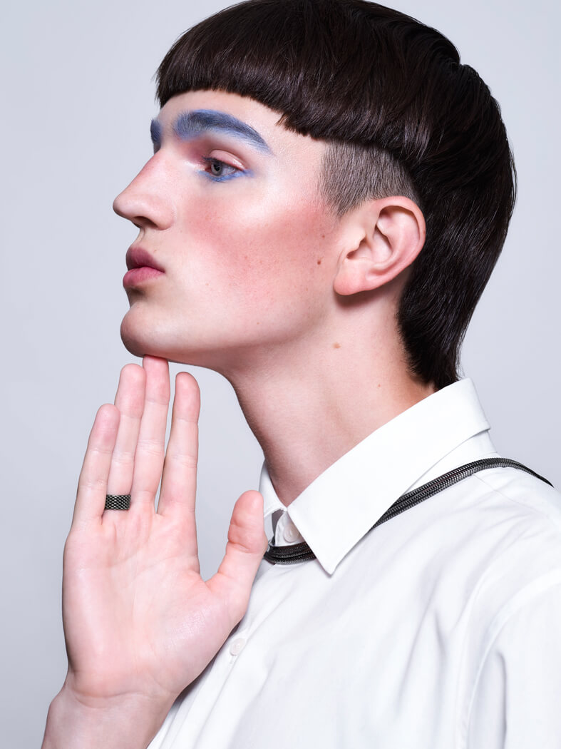 A KALTBLUT exclusive male beauty story. Photography by Julia Keltsch c/o Avenger Photographers. Model is Oskar Knickelbein from OM Management. Hair & Make-Up by Melanie Hoppe c/o Blossom Management. Styling by Lisa Maria Lohmann c/o Bigoudi. Fashion brands are DRKSHDW by Rick Owens, Jasmina Jovy, Levi’s, Maison Margiela. Make-Up brands are Nui Cosmetics und JACKS Beautyline.