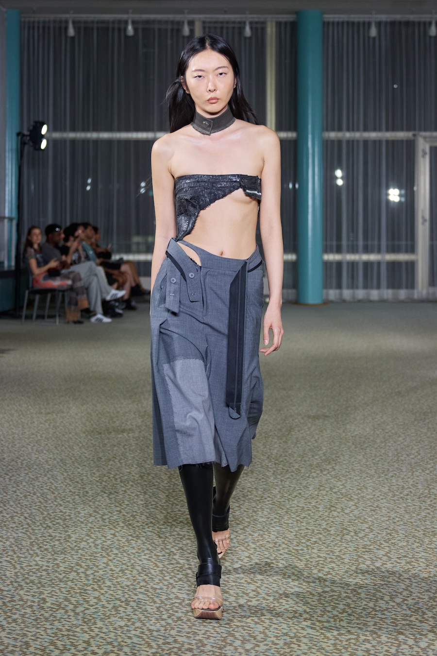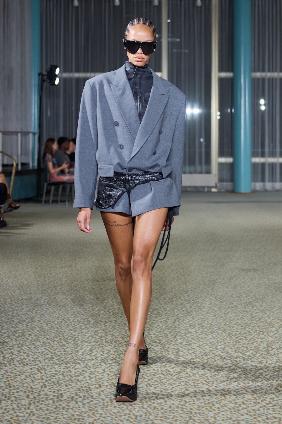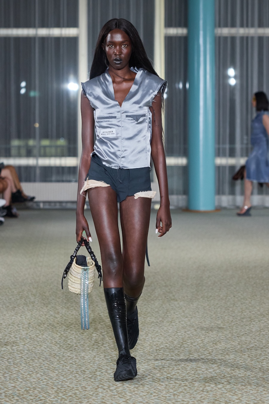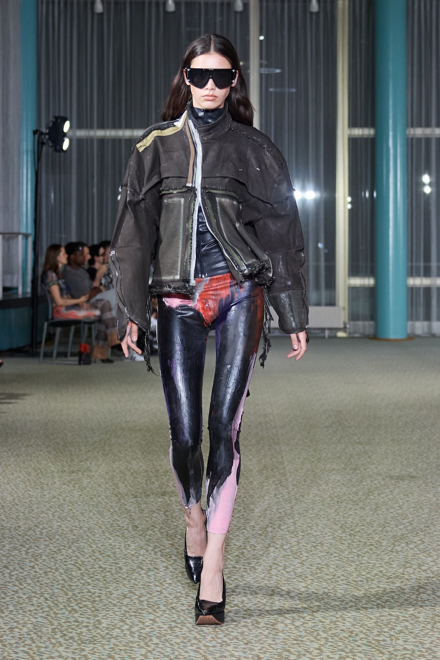 “Heidi” dazzles with an array of skin-tight silhouettes, weaving together bold blacks and electrifying colours. The collection features beloved jersey pieces and printed mesh dresses and tops that have defined the Ottolinger aesthetic. It also ventures into an exciting exploration of tailoring, presenting deconstructed, reworked, and layered garments that challenge conventional shape and form. Head-to-toe denim ensembles gleamed with a shine that could easily be mistaken for wax while striking painted latex dresses and leggings rounded out the lineup with flair.
