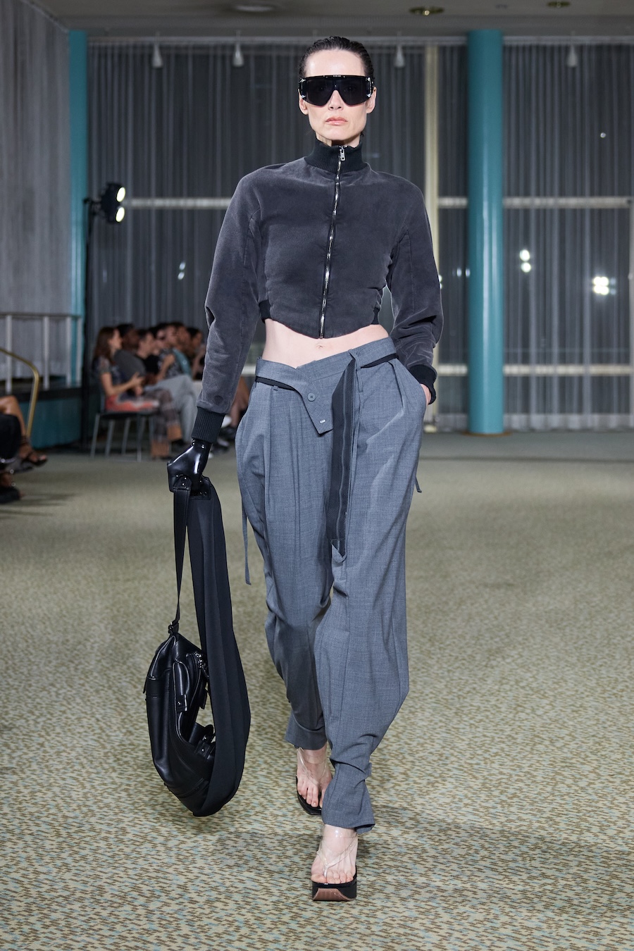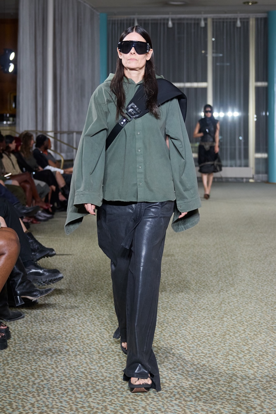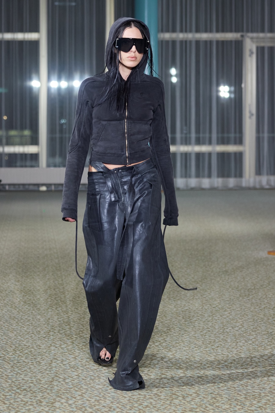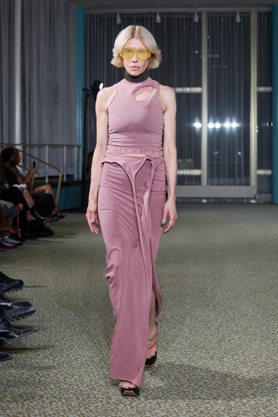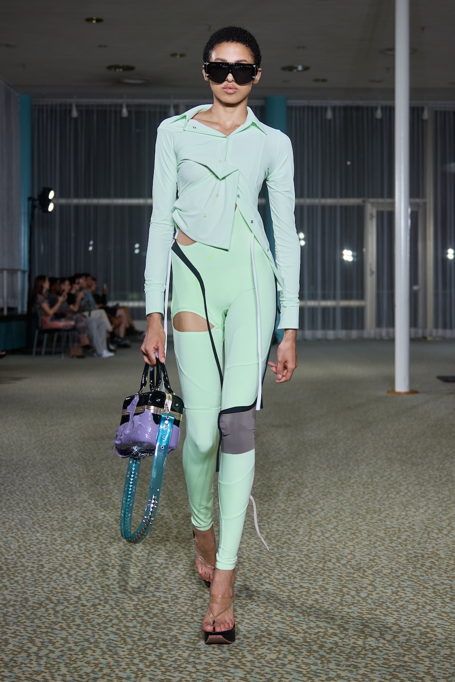 “Heidi” dazzles with an array of skin-tight silhouettes, weaving together bold blacks and electrifying colours. The collection features beloved jersey pieces and printed mesh dresses and tops that have defined the Ottolinger aesthetic. It also ventures into an exciting exploration of tailoring, presenting deconstructed, reworked, and layered garments that challenge conventional shape and form. Head-to-toe denim ensembles gleamed with a shine that could easily be mistaken for wax while striking painted latex dresses and leggings rounded out the lineup with flair.