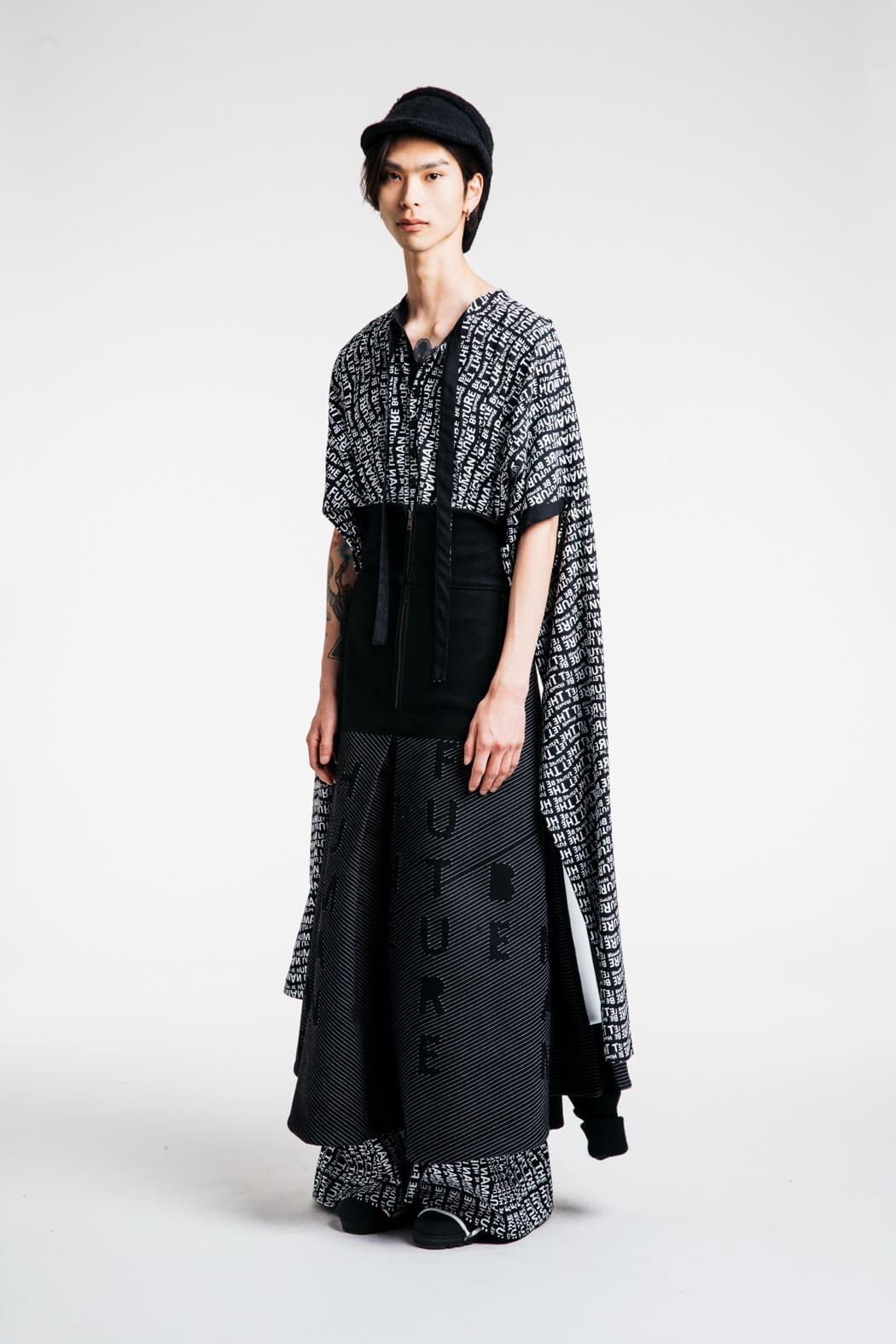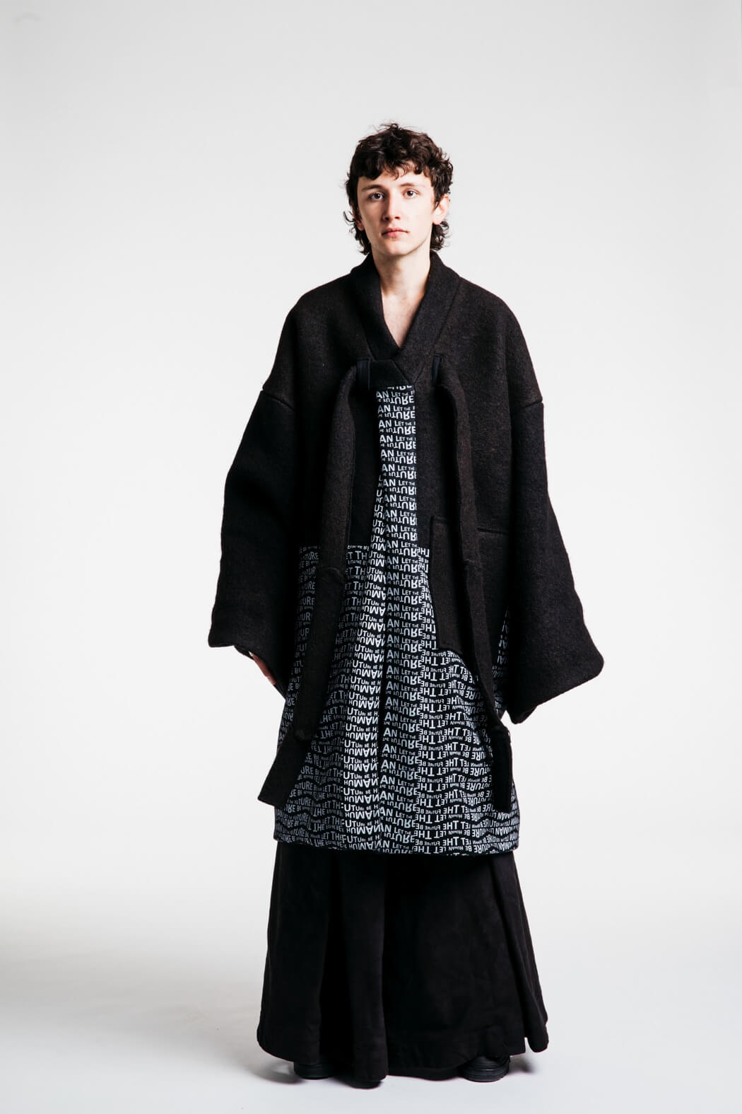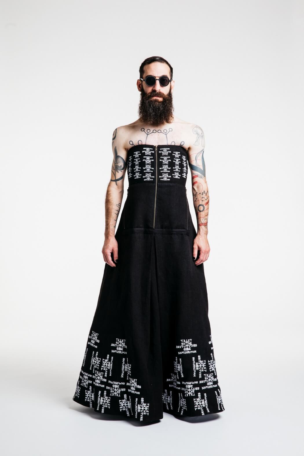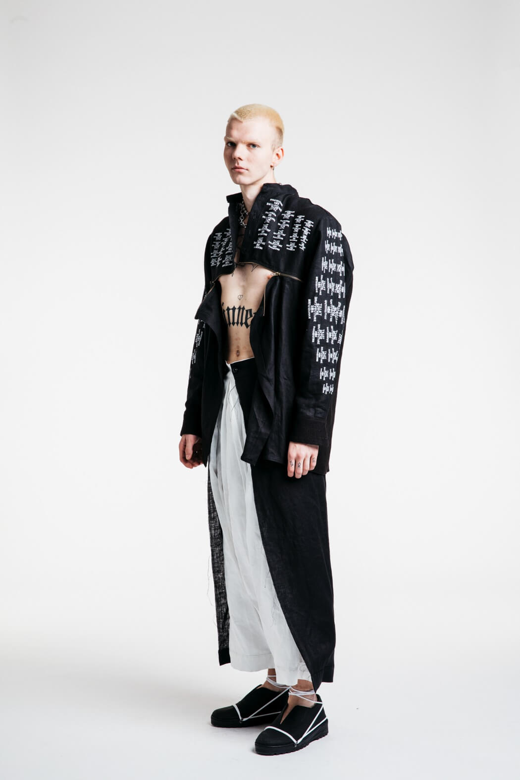 The young menswear designer showed a collection that focused on the detachment of stereotypical gender roles. With his collection “Let the Future be Human”, he presented an unconventional collection for men. Among other things, his models presented elegant evening robes, floor-length coats and co. The colour palette of the MA graduate remained reduced black and white. www.instagram.com/kaigerhardt_official