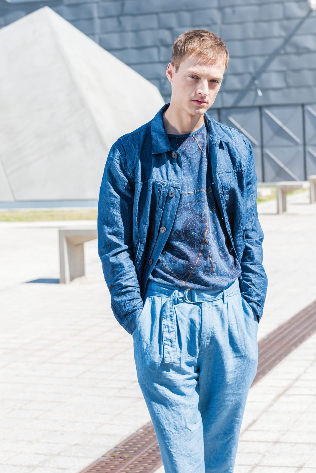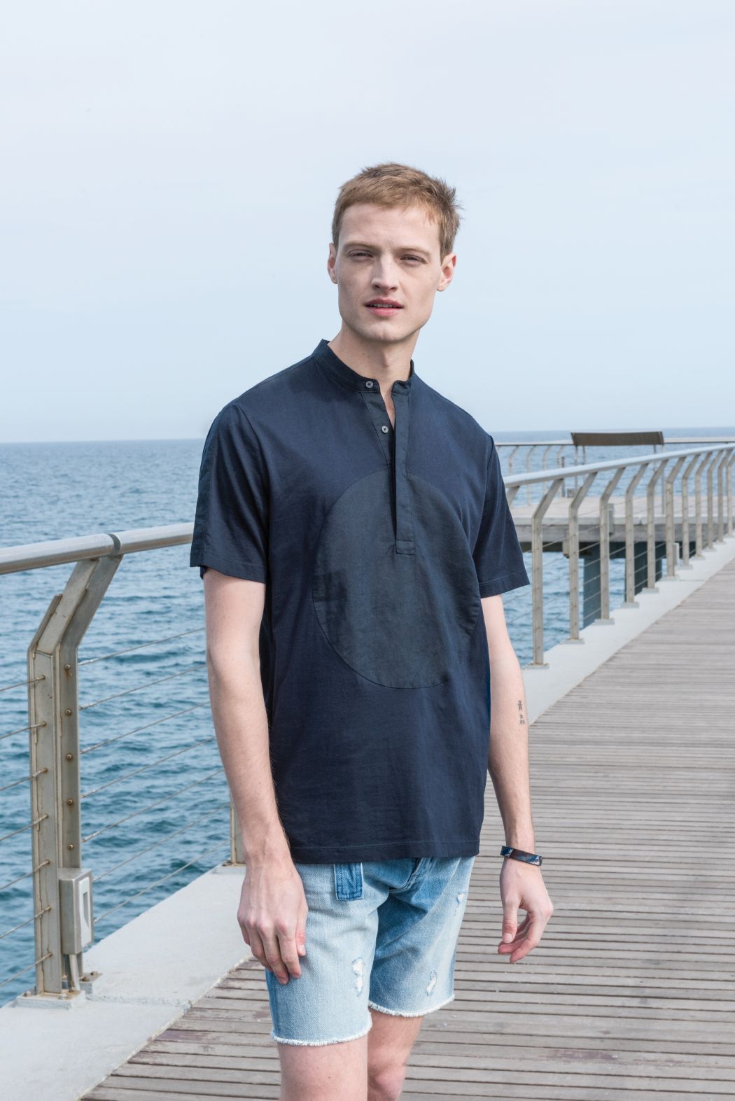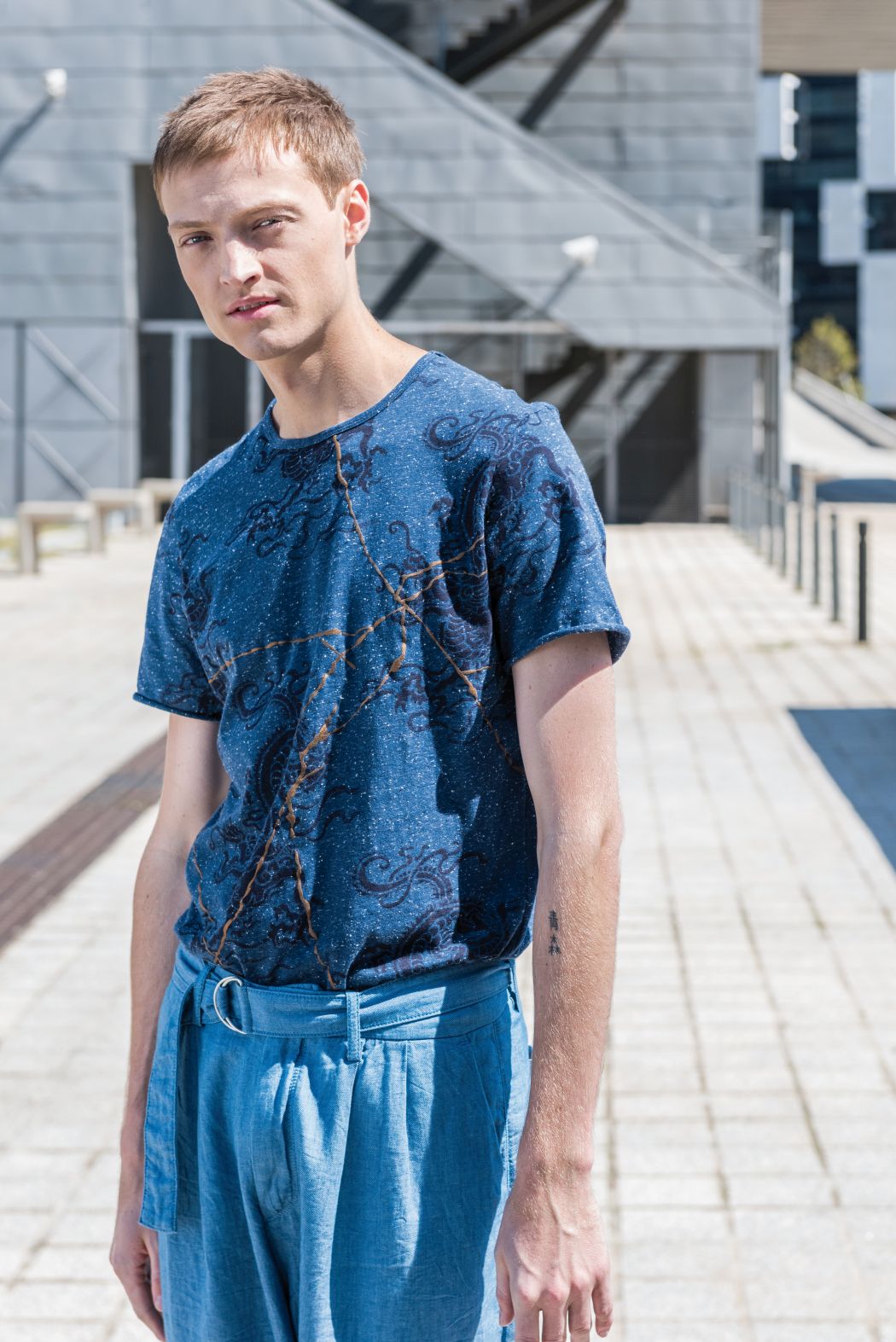 Inspired by the contrast between modern architecture and the element water, denim and the colour blue determine the collection. The collection consists of several shirts, partly simple or printed with dragon prints and gold elements. Furthermore, there are shorts and airy denim trousers, as well as a cotton poplin jacket with an asymmetrical back.