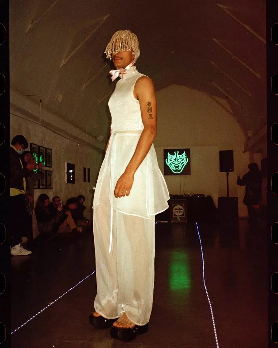 “A Fluid Demi Couture collection made all by hand. Using up-cycled materials and 100 year old upholstery fabric …...