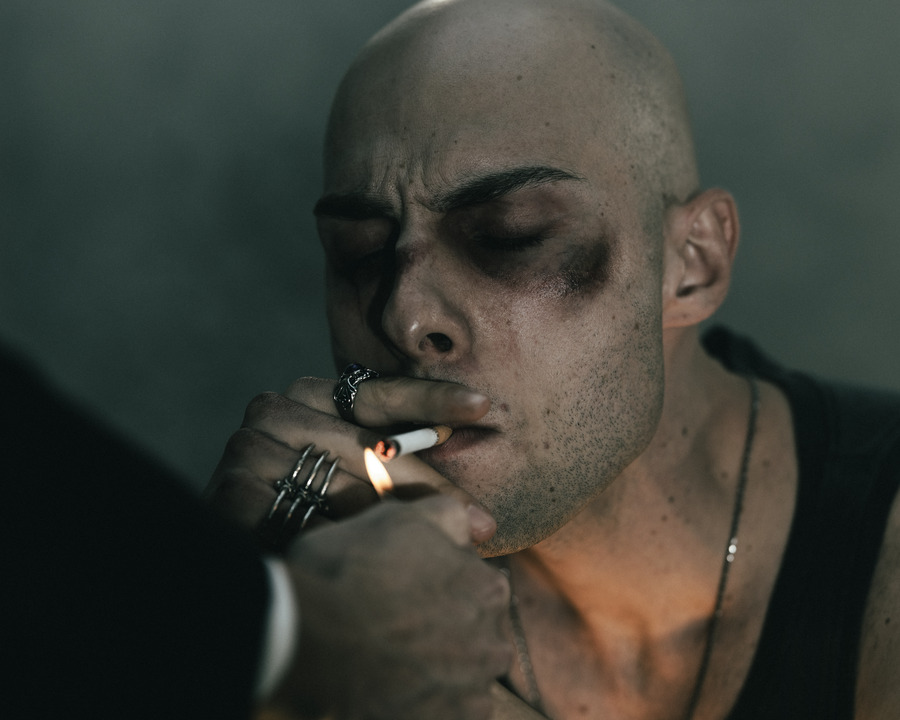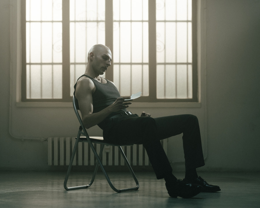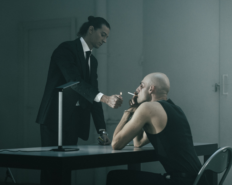 A KALTBLUT exclusive . Photography by Alessandro Fabi. Art direction by Nicola Minotti. Production by Glami Inside Fashion. The models are Flavio Zebri and Federico Ceccarini. MUA by Simona Salvagni. Styling by Brenda Riccio. “The interrogation begins with the usual clash of wills: the cop, solid, unwavering, tries to bend the criminal, described as fragile and confused, ready to crack under pressure. But, little by little, the scene turns into a disturbing psychological game. The policeman’s questions, harsh and precise, seem to touch intimate chords, revealing a vulnerability not expected of a lawman.”