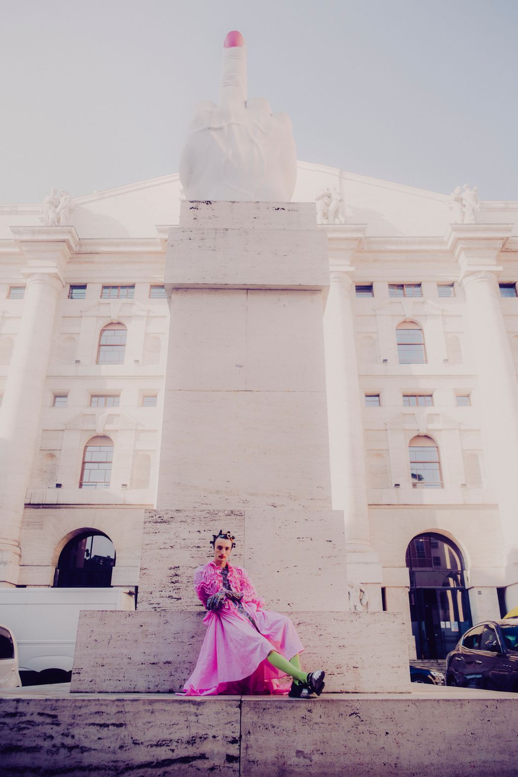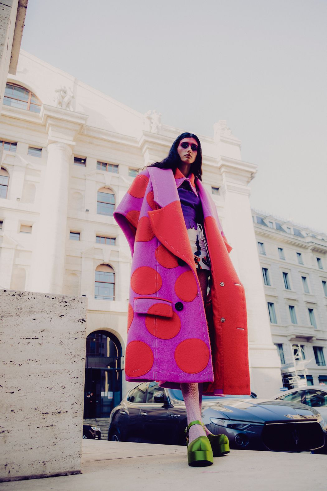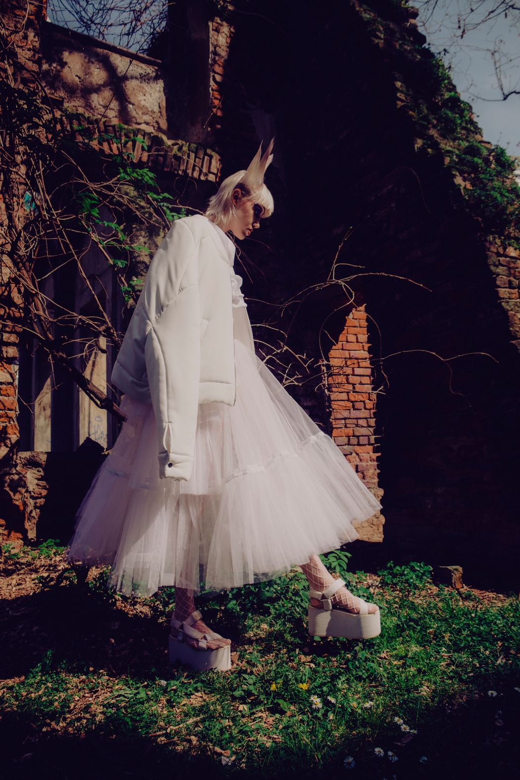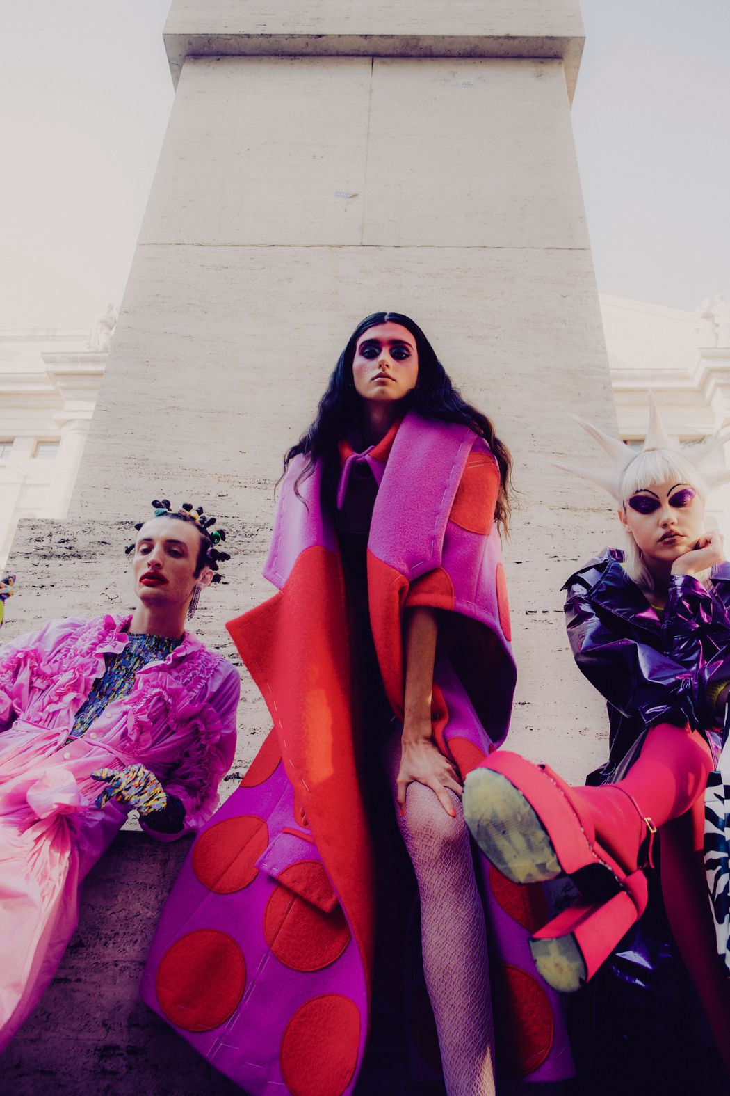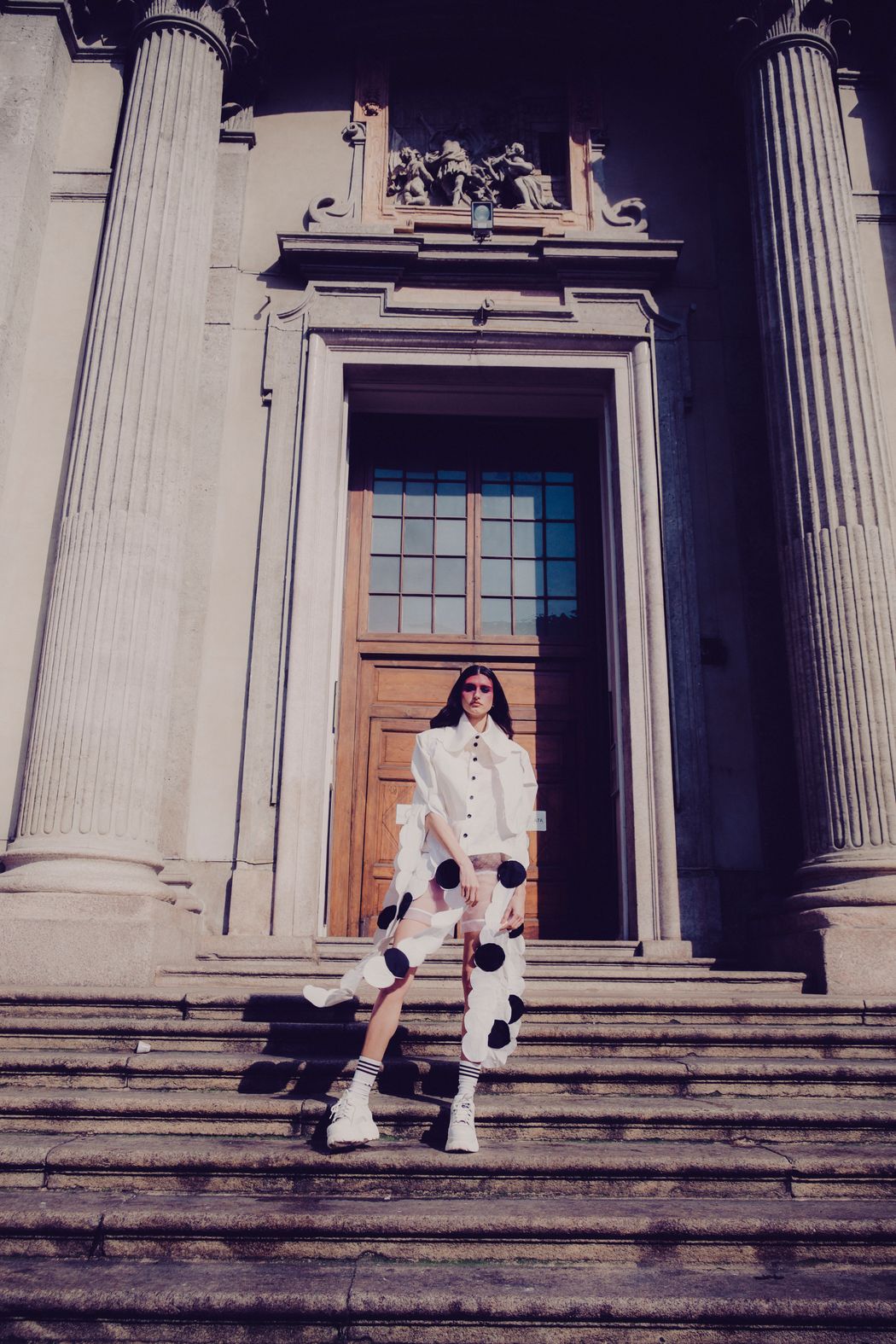 The inspiration of this was the club kids from the 90s and their vision, but reinterpreted in this pandemic times were the young people can’t party anymore and they walk in the street dressed in club clothes and showing their will to go back to the party and be free.