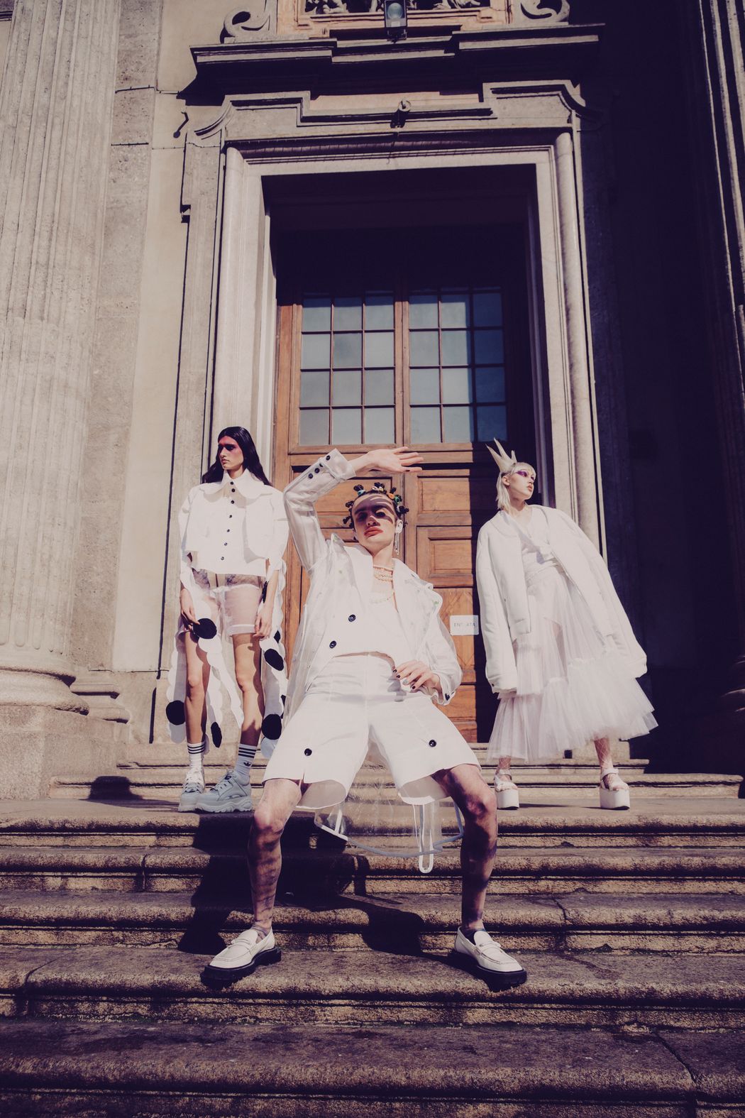 A KALTBLUT exclusive. Photography by Miriam Tisbo. Models are Nicolas Sartorte and Margot Hubac signed at The Lab Agency, Aleksandra Grains signed at Nologowomen. Art direction and styling by Chiara Franco. Makeup and hair by Alice Maggioni.