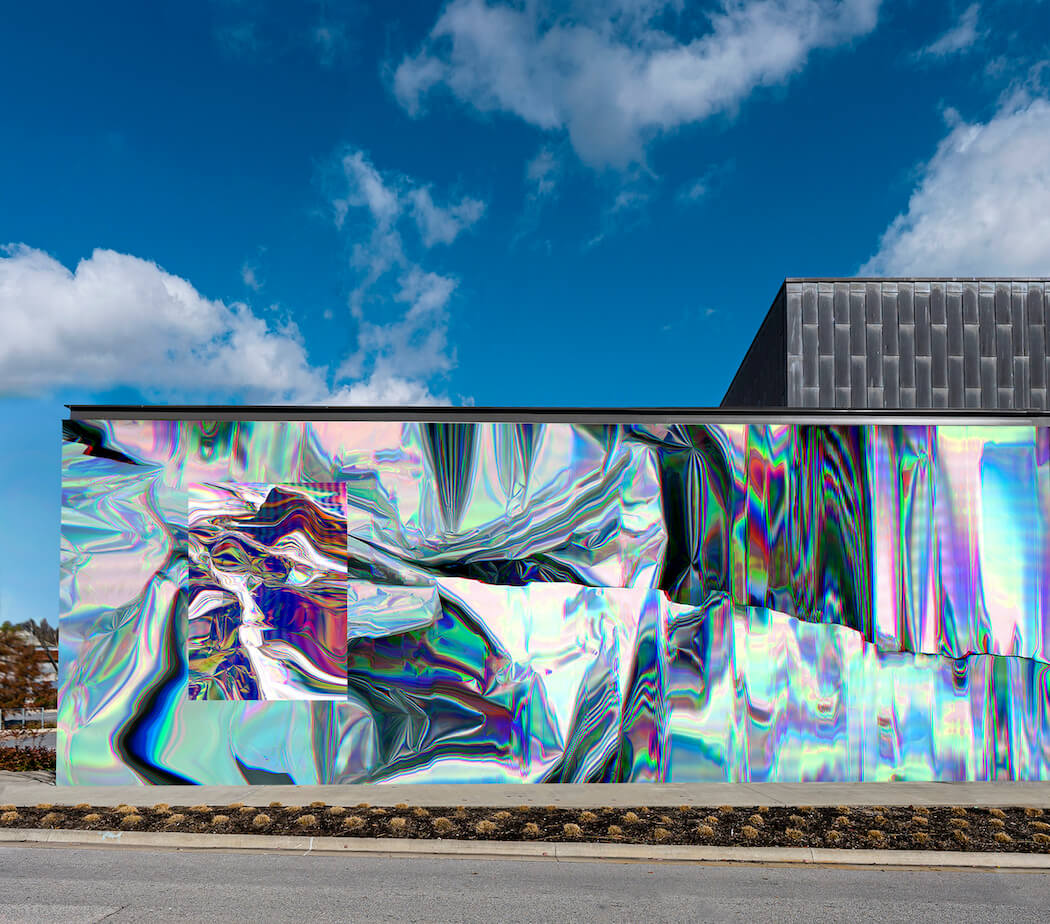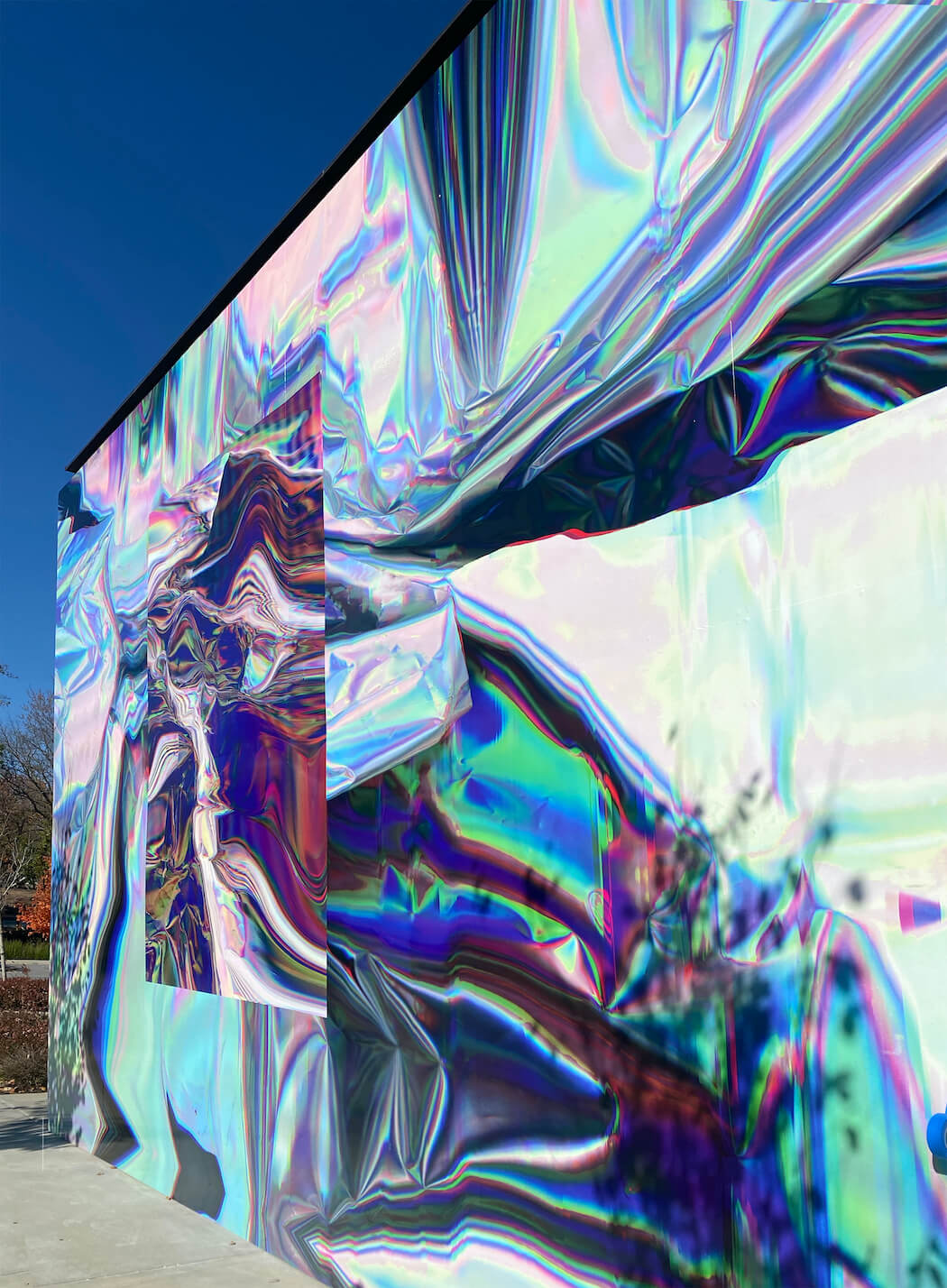 My process starts by scanning holographic paper and warping it over the glass to create glitches. The light source distorts a spectrum of colour from the reflection of the paper, and further augments these photographic digital images into a painterly field. I started this work when I moved to NYC. I made an artist book with this process that led to the larger painting practice.