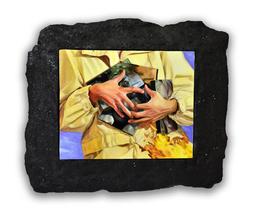 Rebecca, a great musician and a friend of mine modelled. She was in a period of total interest for anarchy and the Paris Commune, and me, on the hacker ethics. On Plato’s Atlantis, we can see two small paintings, I call these elements “cassettes”. They operate as ex-votos and enable me to summon invisible presences on the painting.
