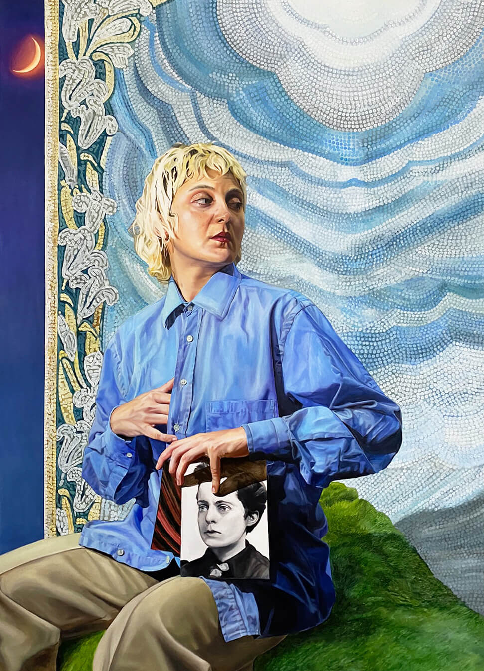 In the background, is a church mosaic representing the celestial sky, but it is only a wall because behind it is the night and the rising moon that makes the grass on which she is sitting grow.