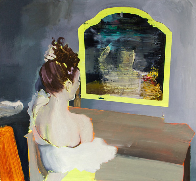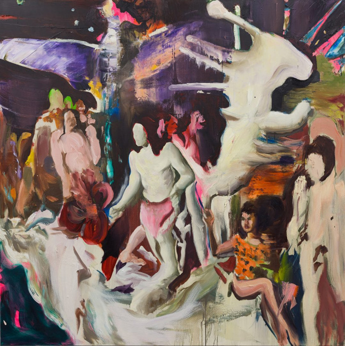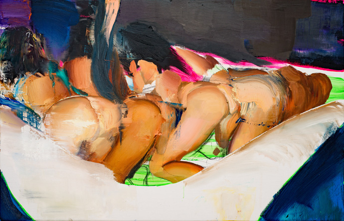Yes, it’s summer. Do you feel like you need an extra spark to light up the hot season? Go to Daniel Lannes’ show ‘A Luz Do Fogo’ at Magic Beans Gallery. The Brazilian painter has been in Germany for a few months with a residency in the famous Baumwoll Spinnerei in Leipzig and he now based in Berlin. But the diet of wurst and bier didn’t seem to have taken the Brazil out of him. The paintings he presents are gorgeous in every sense : luscious colors, opulent compositions reminding me of Tiepolo and Rubens, and my favorite part – ass, body hodiho and more ass.