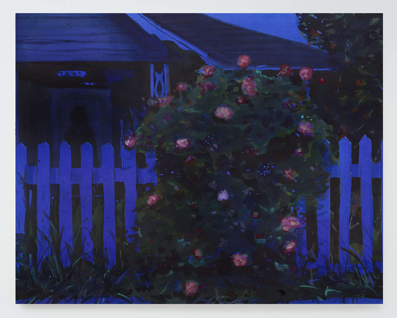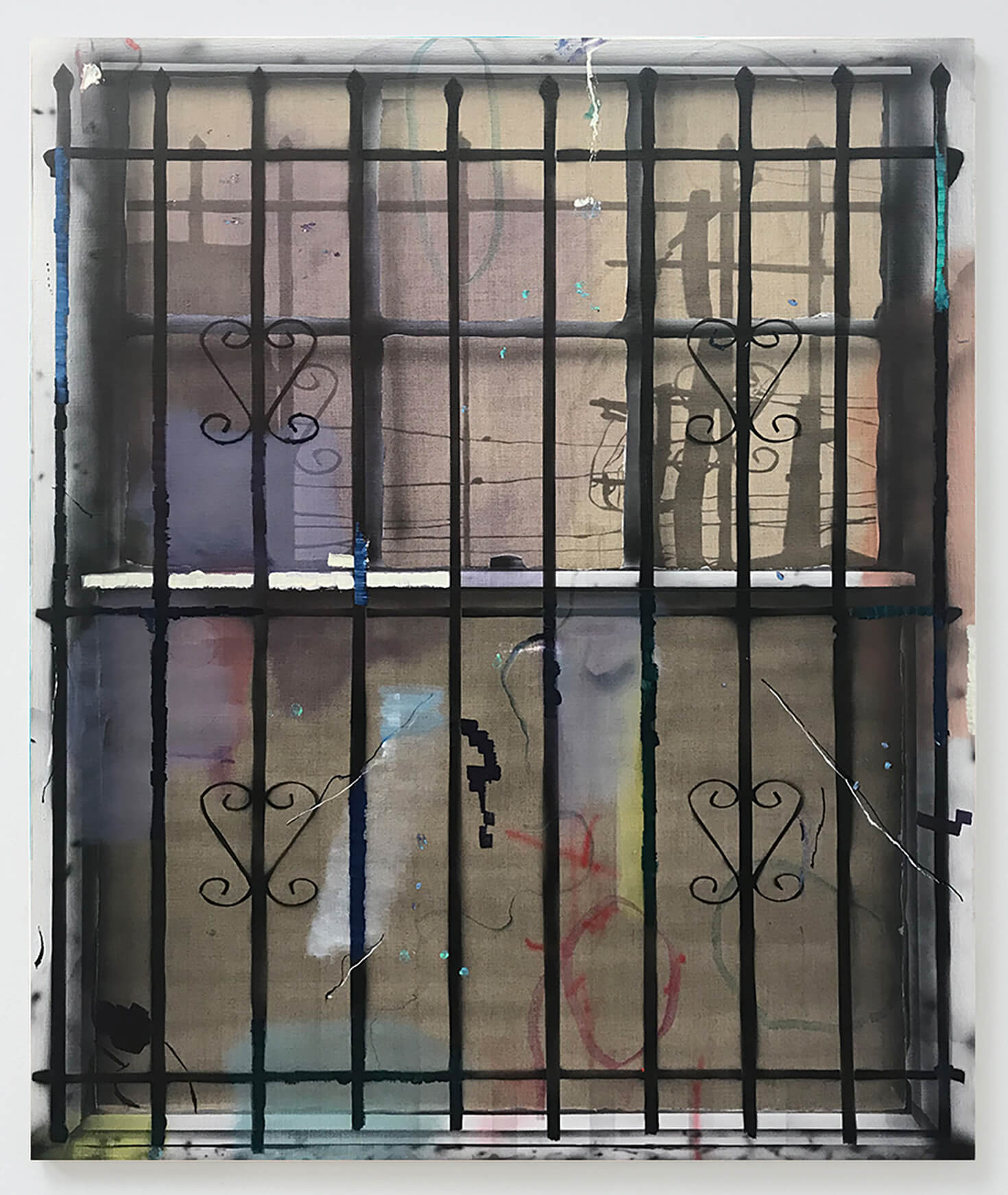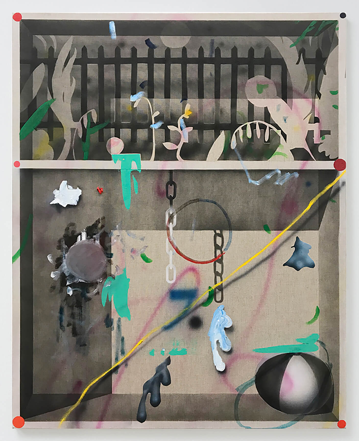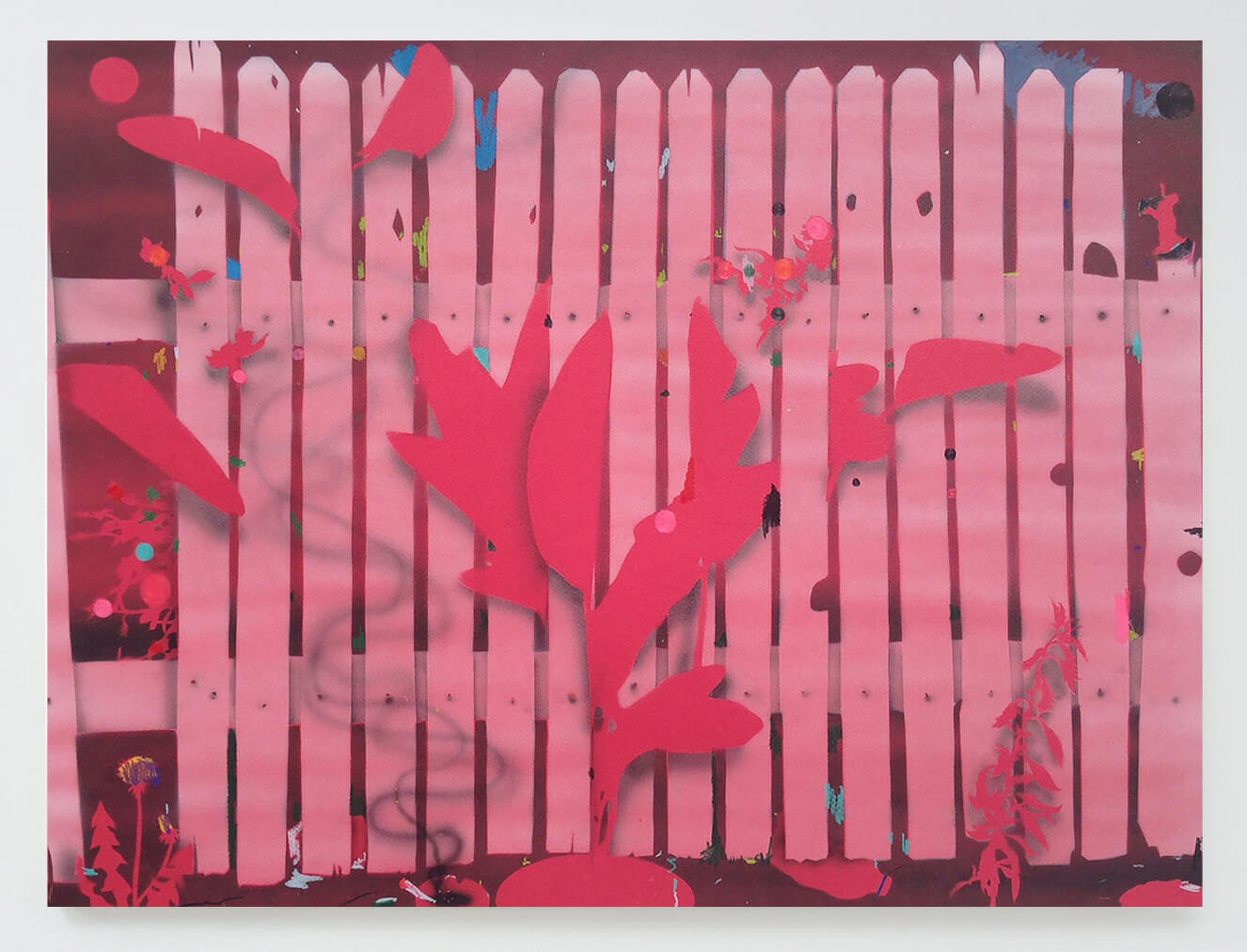 I often paint things over and over. I have done fifty or so paintings of this weird fence I saw when I lived in Kansas City. On my walk to and from work, I would pass this fence, made of cobbled-together mismatched planks full of knots and holes. I would think about it all day and dream about it at night. Who lived there? What was concealed in the yard beyond? It was a symbol of mystery and curiosity. Years after leaving Kansas City, this weird fence would persist in my mind. Now a shadow memory of the original, it became a symbol representing a border, the site of transition between inside and outside. Most recently, in light of COVID-19 and our collective quarantine, the use of masks and gloves, I think of this weird fence in biological terms, as a semipermeable membrane selectively allowing some things to pass freely from one side to the other, while preventing the passage of others.