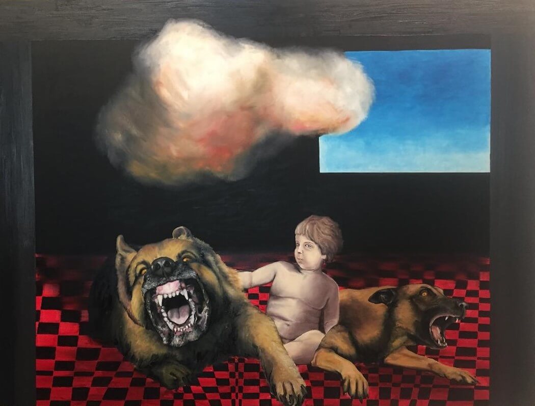 Look as Fin de Rome – one of my favourite paintings – the german shepherd are replacing Romulus’ wolves, one mouth jumps at us, bared teeth, devouring the space between the viewer and the surface. Juxtaposed, the red and black check pattern makes us feel like we’re on some kind of space boat in a storm. The cloud escapes from the window of a blue sky. The child is very flat though, as the other dog. I feel like a chicken who has lost its head, and I love it!