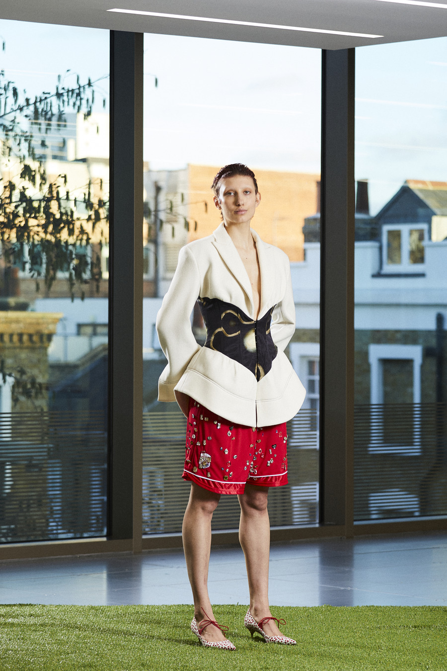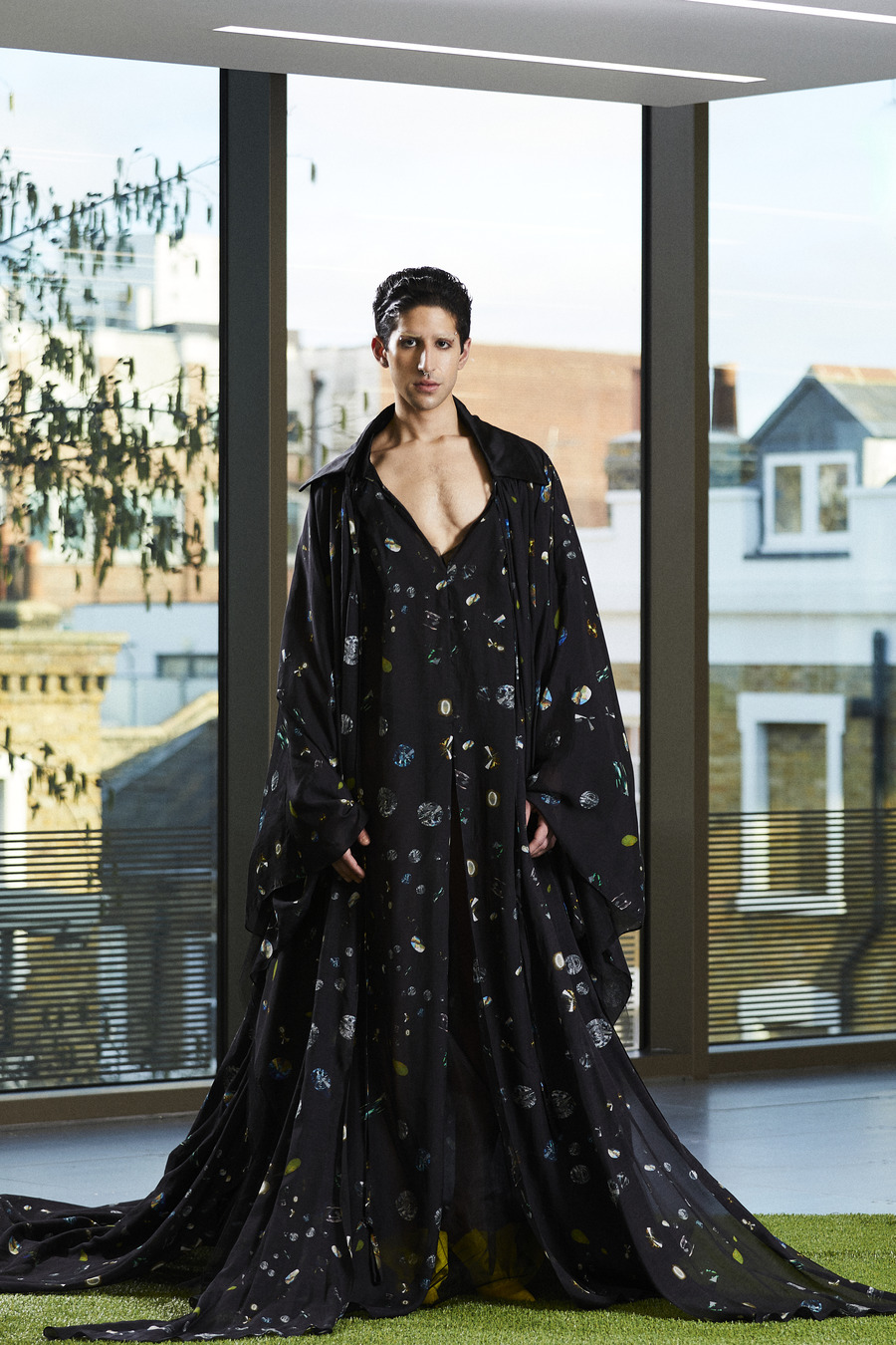 PM: I love the reimagined Football kits with Swarovski Crystals, and the Black Taroni silk tail coat and kilt from Look 18. Both take something classic and rethink it, they’re twisting the expectations in a modern sustainable way.