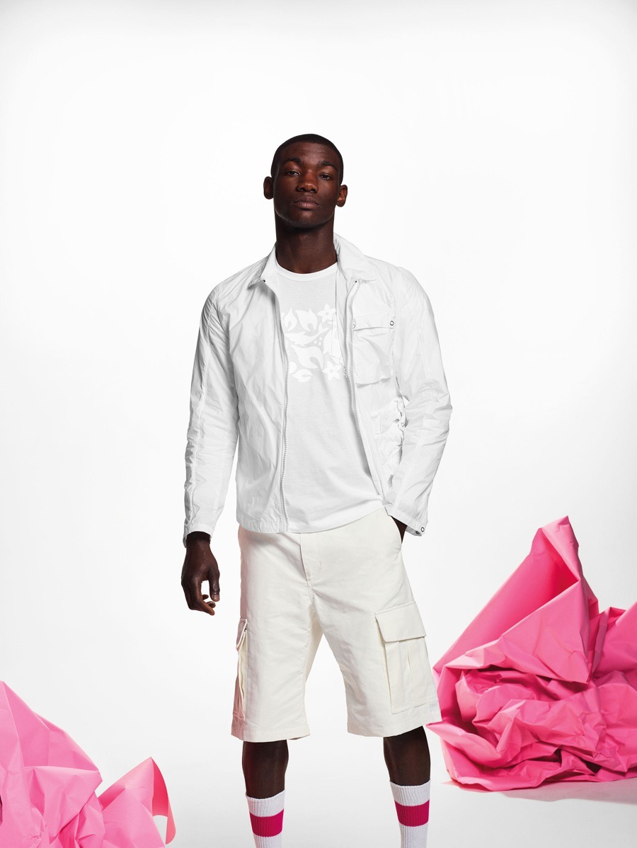 Materials have been used in an unusual and alternative way. The striped cotton of the shirts has been paired with contrasting materials and nylon fabrics to create consistency and give the coats more volume, with their sophisticated design and contrasting details. The super soft, ultra-light cashmere comes in Nick Wooster’s instantly recognisable signature fluorescent colours. The fabrics, with their crisp feel, have also been unconventionally used for shirts and shorts. The coats are often reversible, with two contrasting personalities, just like their fabrics.
