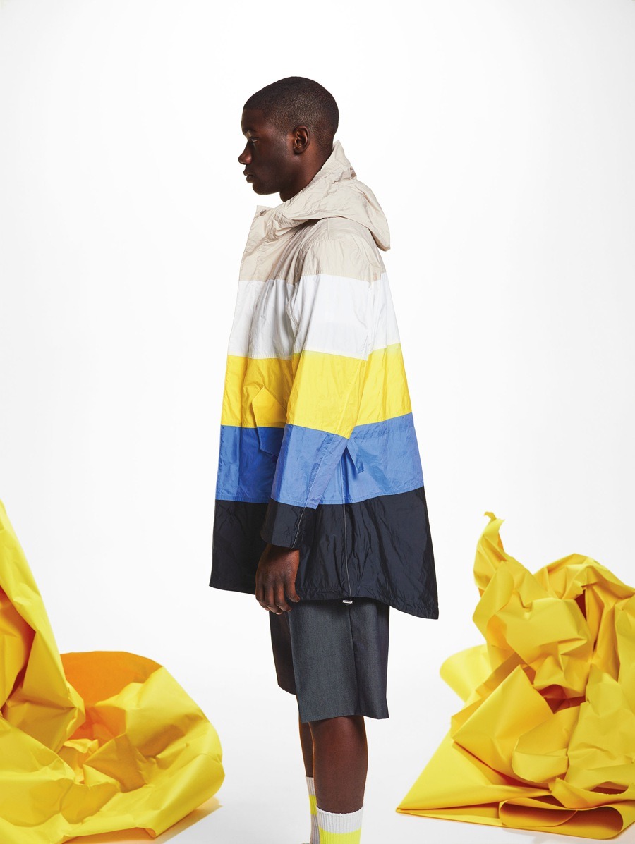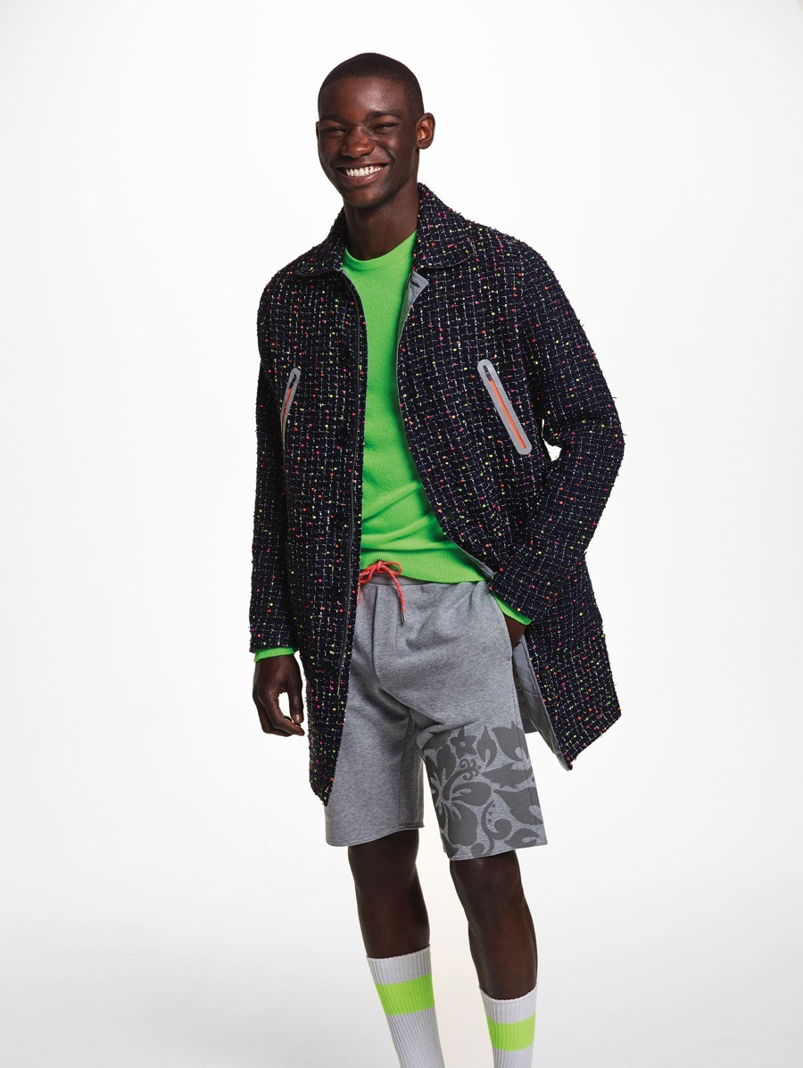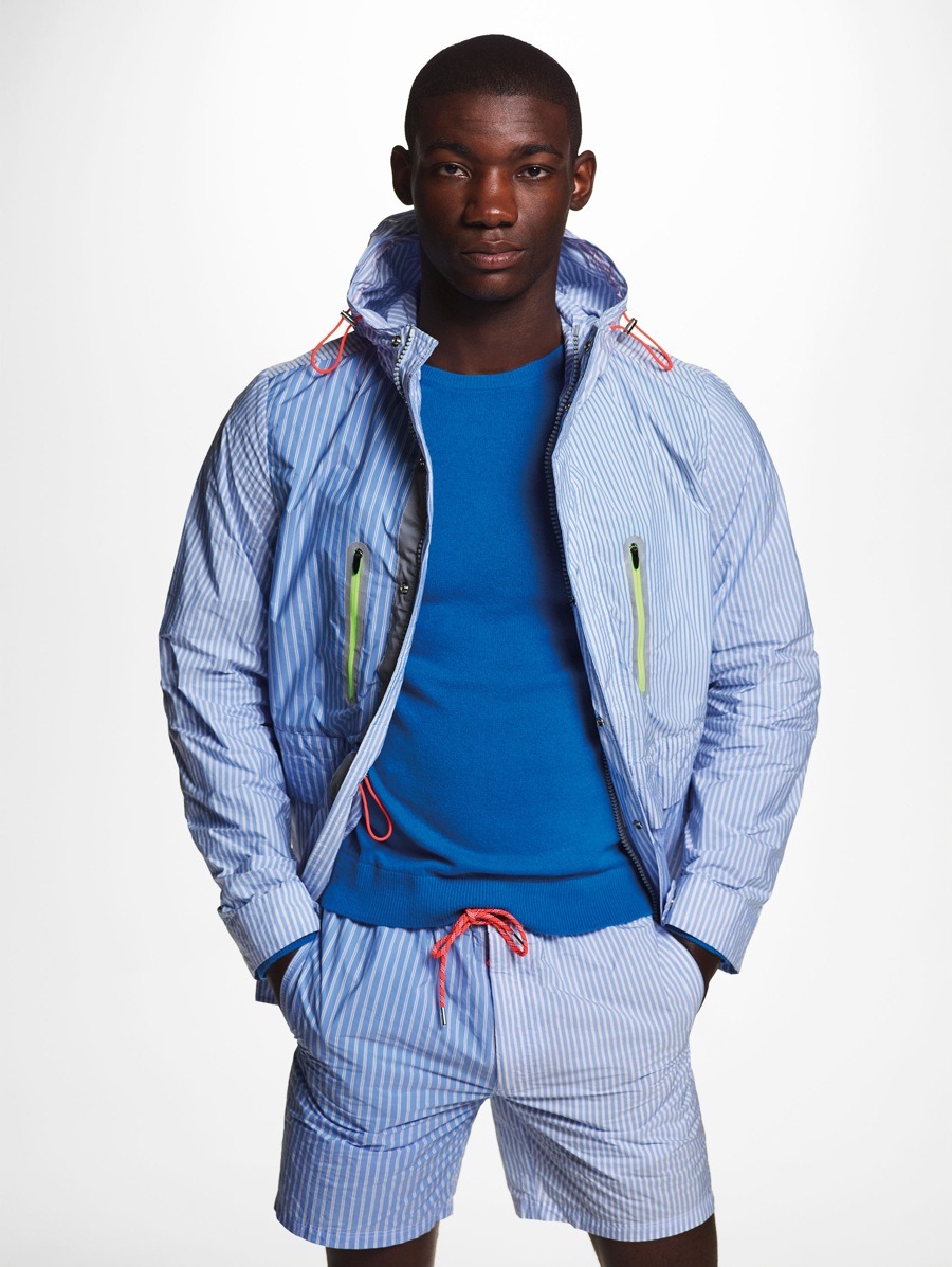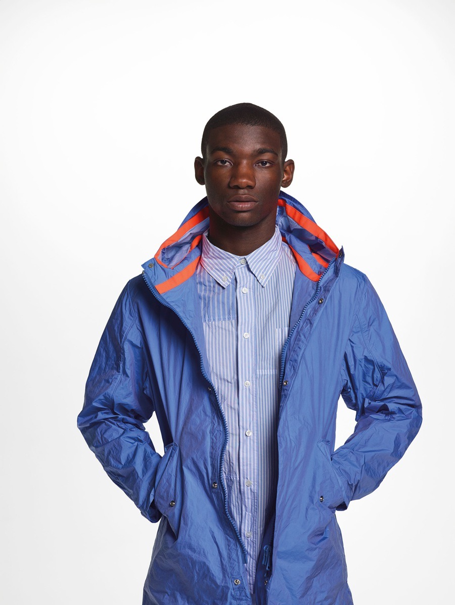 Materials have been used in an unusual and alternative way. The striped cotton of the shirts has been paired with contrasting materials and nylon fabrics to create consistency and give the coats more volume, with their sophisticated design and contrasting details. The super soft, ultra-light cashmere comes in Nick Wooster’s instantly recognisable signature fluorescent colours. The fabrics, with their crisp feel, have also been unconventionally used for shirts and shorts. The coats are often reversible, with two contrasting personalities, just like their fabrics.