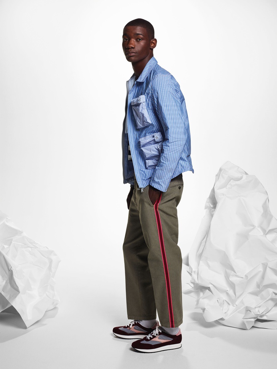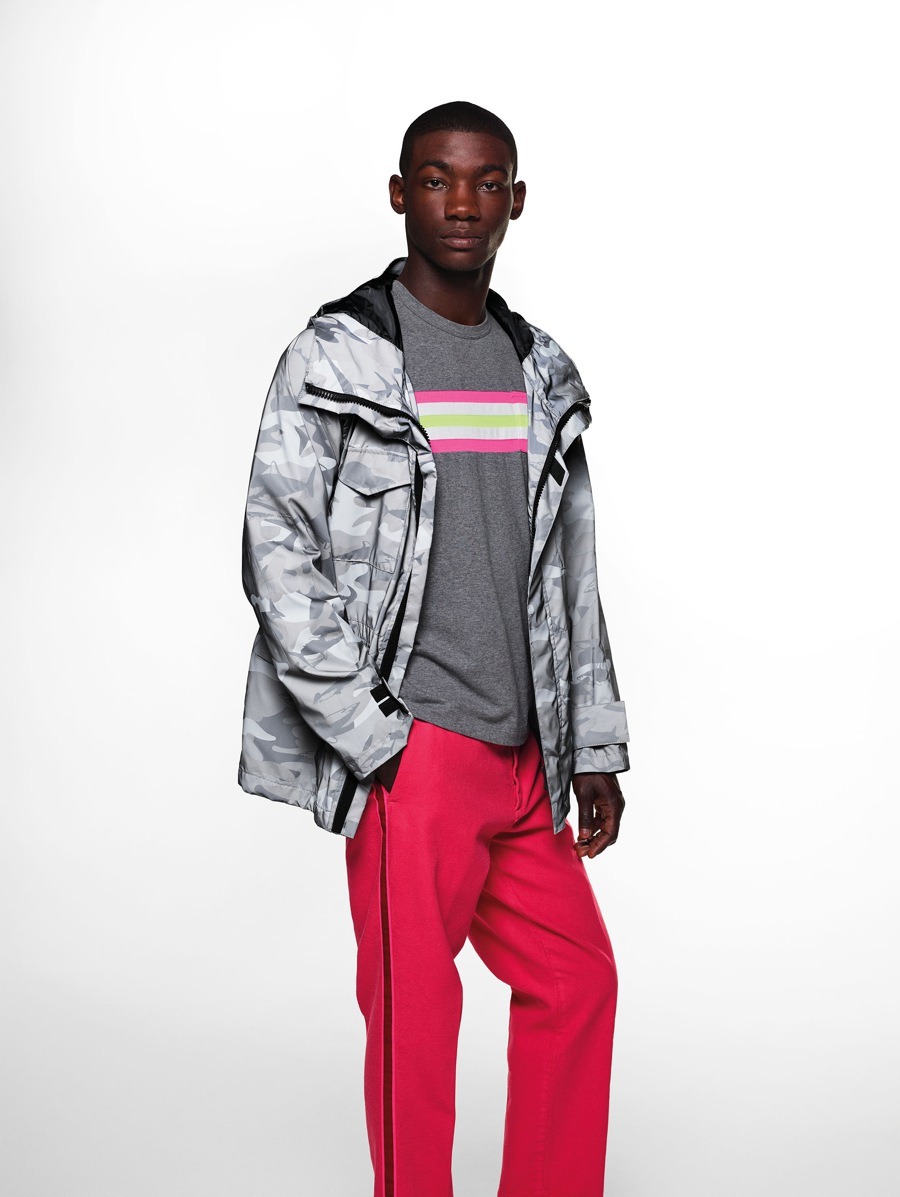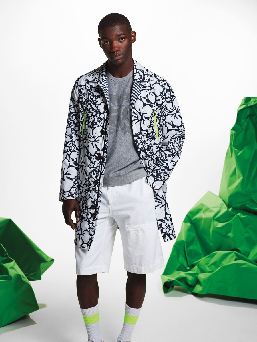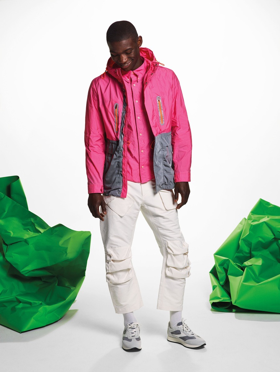 Materials have been used in an unusual and alternative way. The striped cotton of the shirts has been paired with contrasting materials and nylon fabrics to create consistency and give the coats more volume, with their sophisticated design and contrasting details. The super soft, ultra-light cashmere comes in Nick Wooster’s instantly recognisable signature fluorescent colours. The fabrics, with their crisp feel, have also been unconventionally used for shirts and shorts. The coats are often reversible, with two contrasting personalities, just like their fabrics.