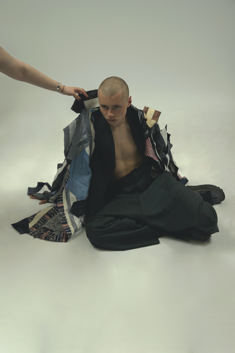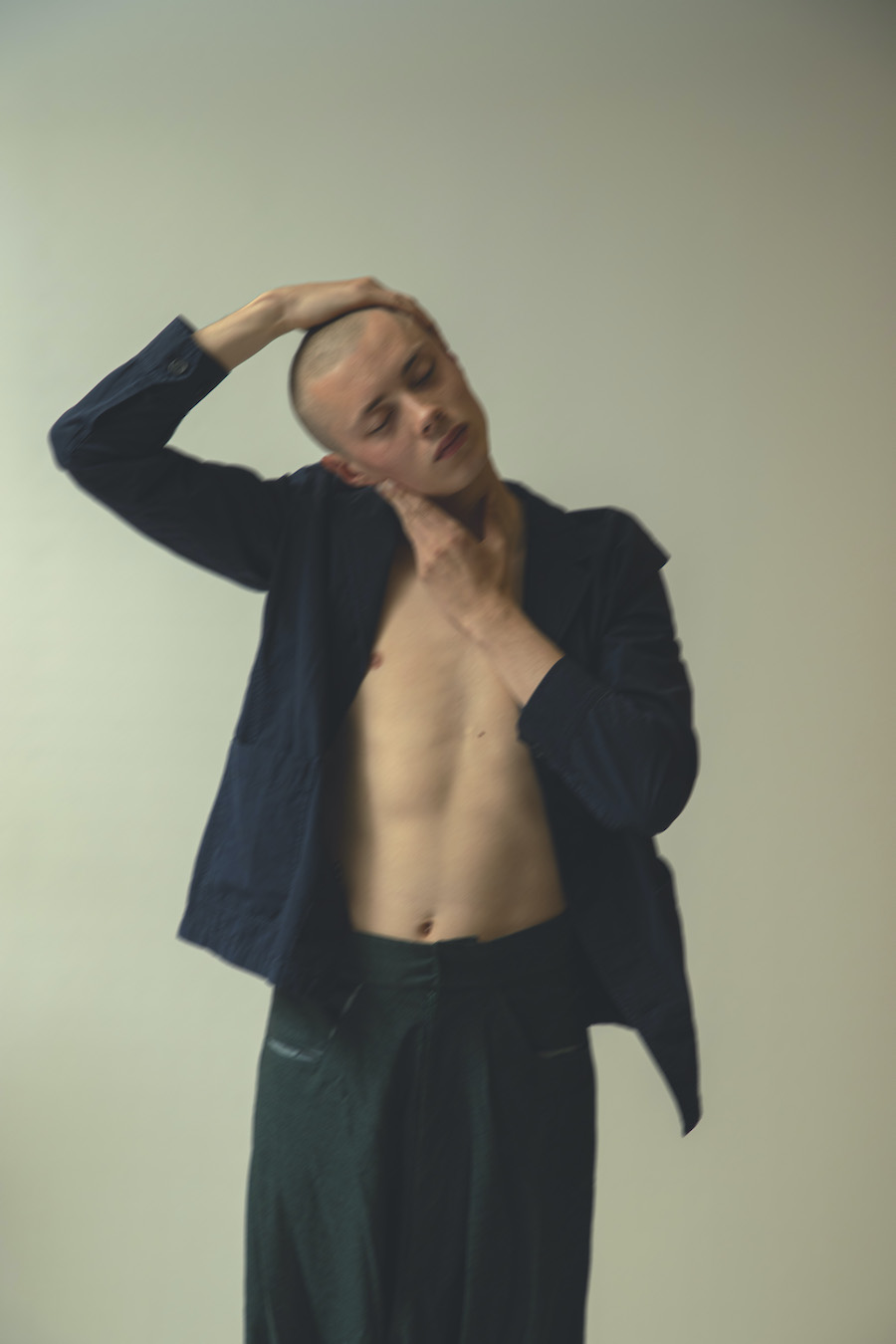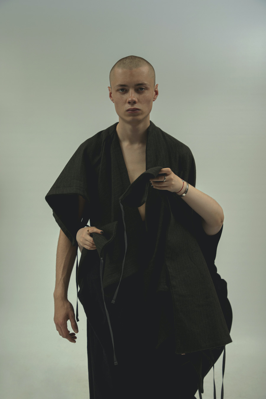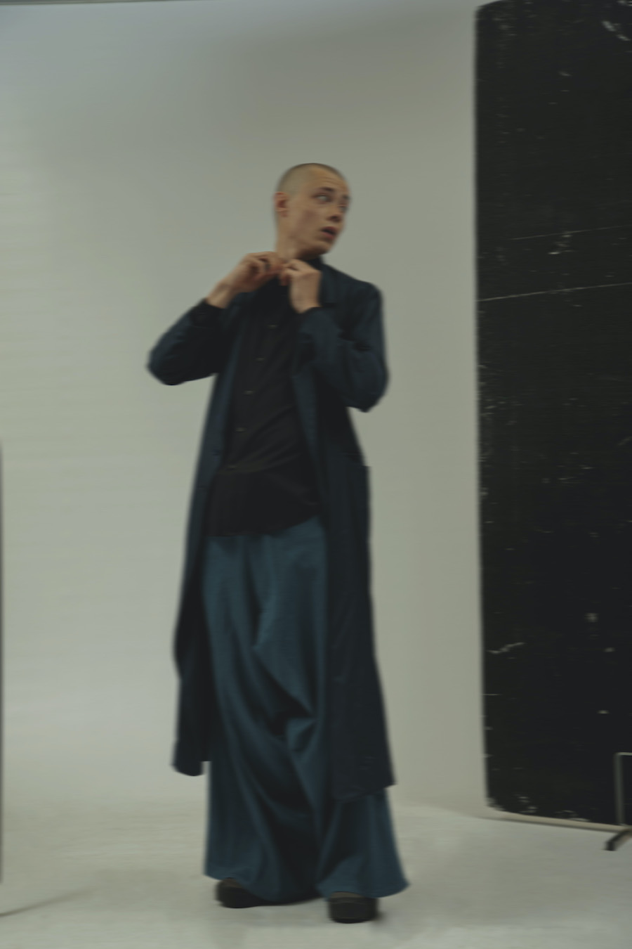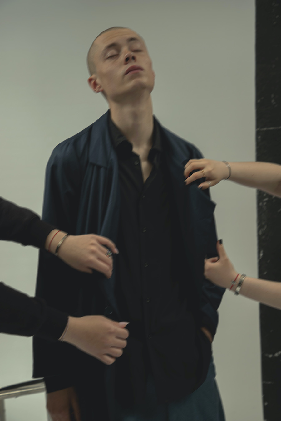 A KALTBLUT exclusive. Photography by Darren Black. Model is Tom Sprott signed at Select Model Management London. Styling & Creative Direction by Laura Sanamova. Inspired by the Japanese aesthetics of Wabi-sabi, demonstrating the beauty of imperfection and incompleteness, the narrative underlying the concept is developed as a shooting that seems unprepared, and the outcome actually looks not at the final stage, but rather like behind the scenes. Besides the atmosphere, the idea also evolves in terms of styling with extra oversized garments, which looks unsuitable to the model’s parameters.