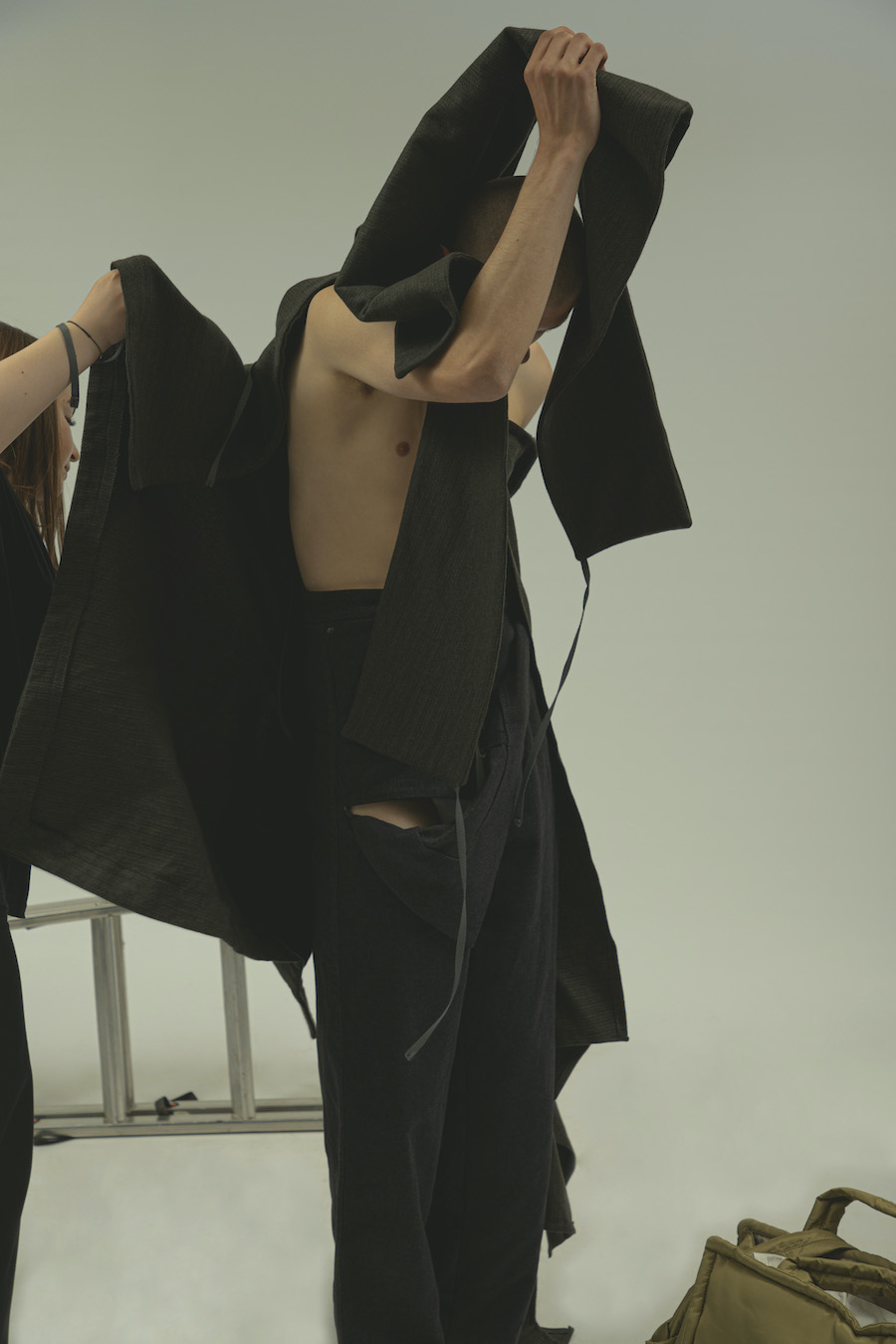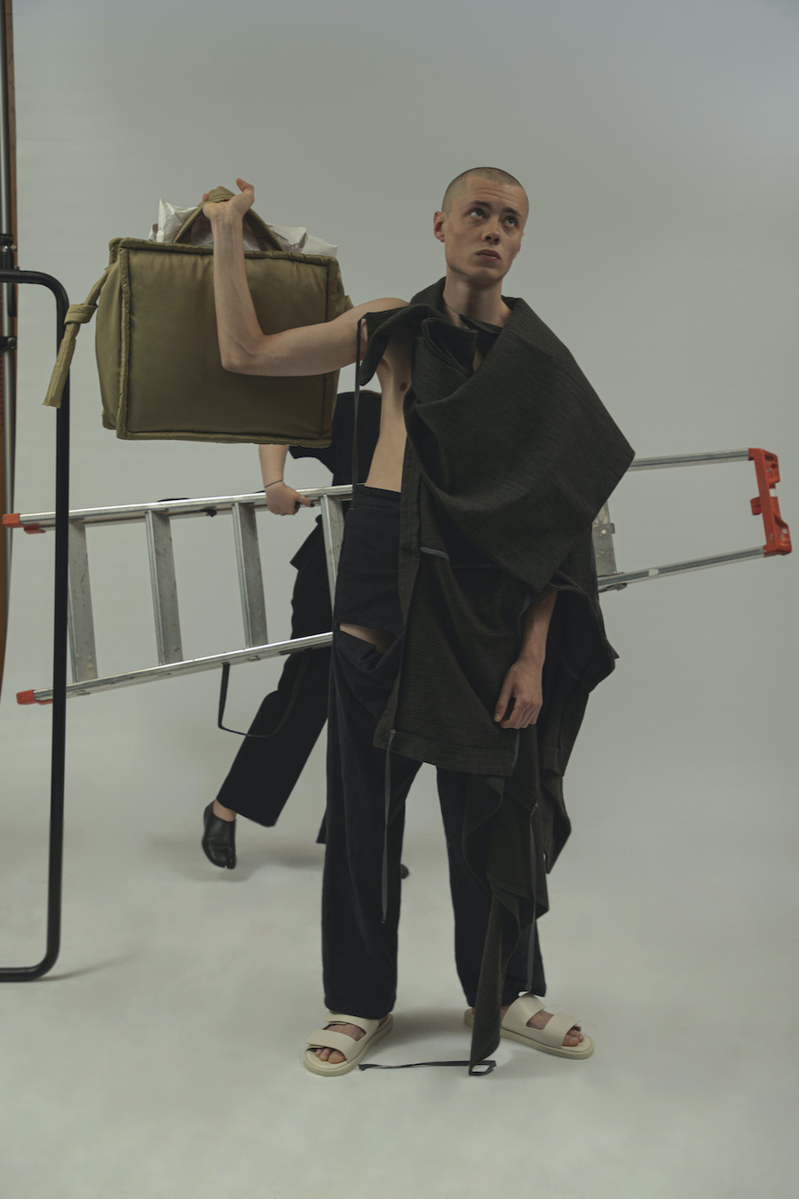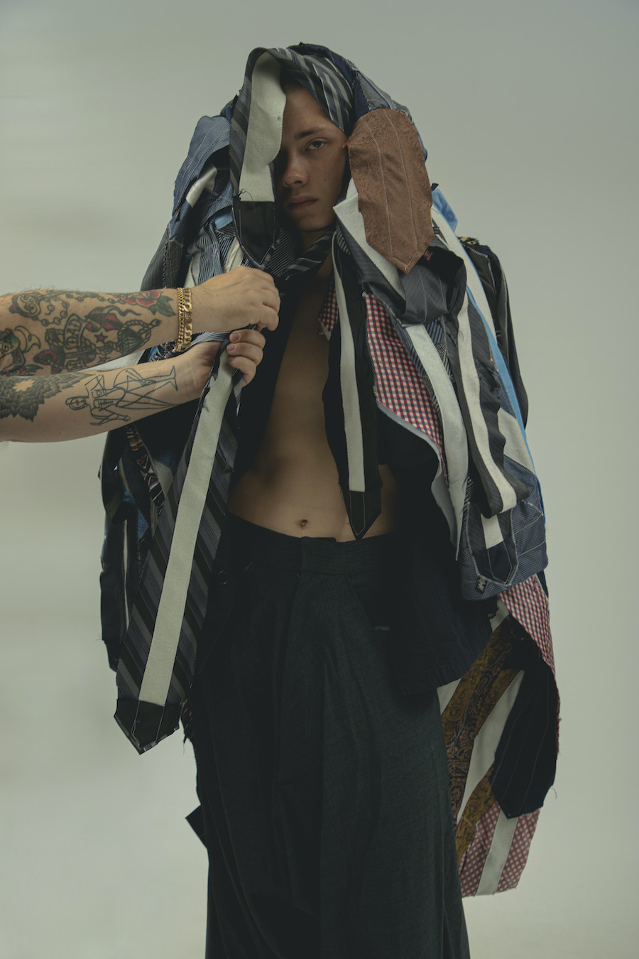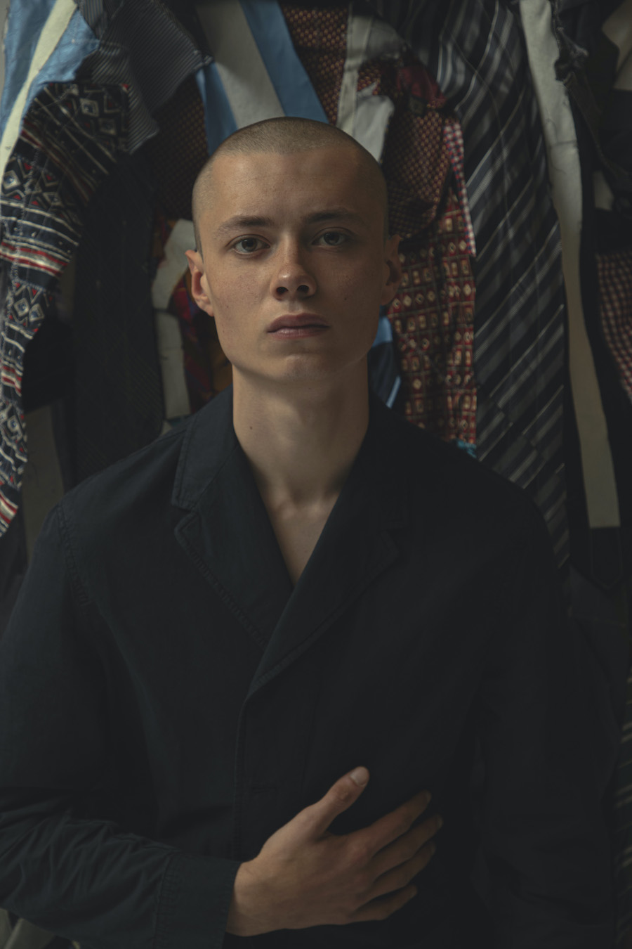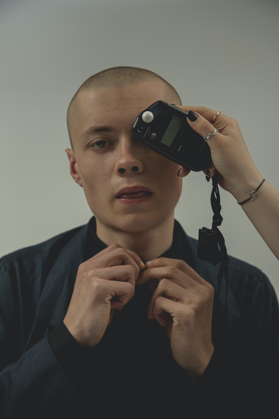 A KALTBLUT exclusive. Photography by Darren Black. Model is Tom Sprott signed at Select Model Management London. Styling & Creative Direction by Laura Sanamova. Inspired by the Japanese aesthetics of Wabi-sabi, demonstrating the beauty of imperfection and incompleteness, the narrative underlying the concept is developed as a shooting that seems unprepared, and the outcome actually looks not at the final stage, but rather like behind the scenes. Besides the atmosphere, the idea also evolves in terms of styling with extra oversized garments, which looks unsuitable to the model’s parameters.