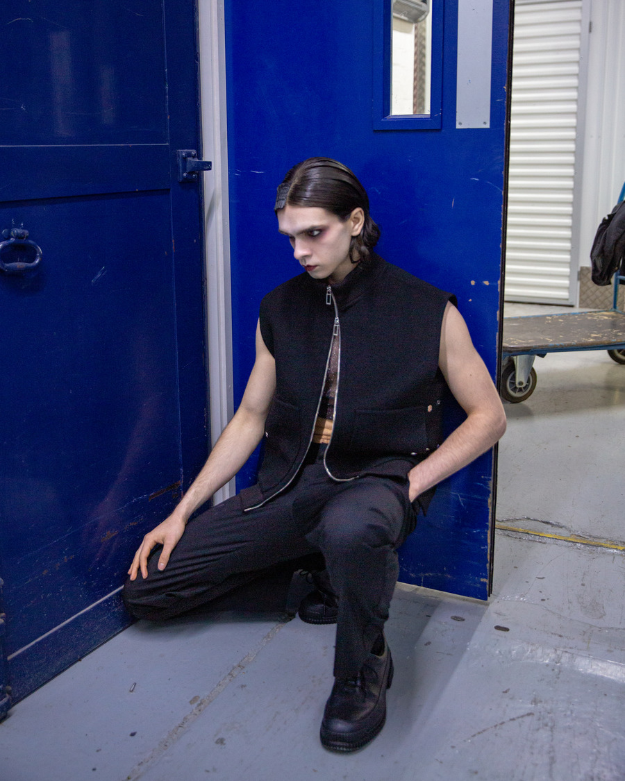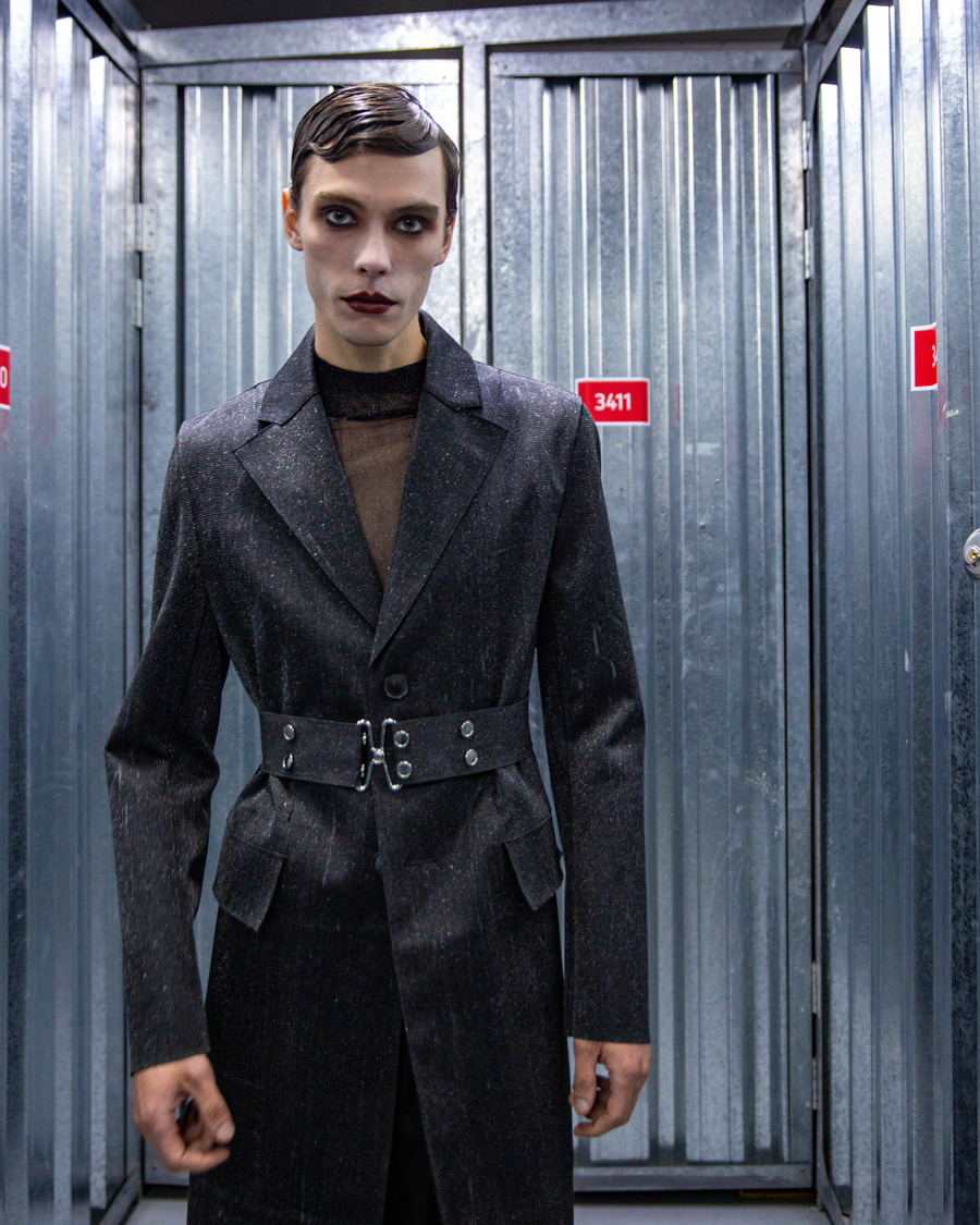 “Konfektion” is a collection that will last for many seasons to come, with its versatile cuts and designs that are simultaneously bold and classic. The collection features sharp boxy tailoring, wide trousers, tailored outerwear, knitted tights, draped tops, and a contrast between cross-dressing and womenswear aspects. The dynamic collection juxtaposes the elegance of dresses and sequins with the rough static architecture of defined and straight pattern cutting, as well as bonded latex with wool coatings.